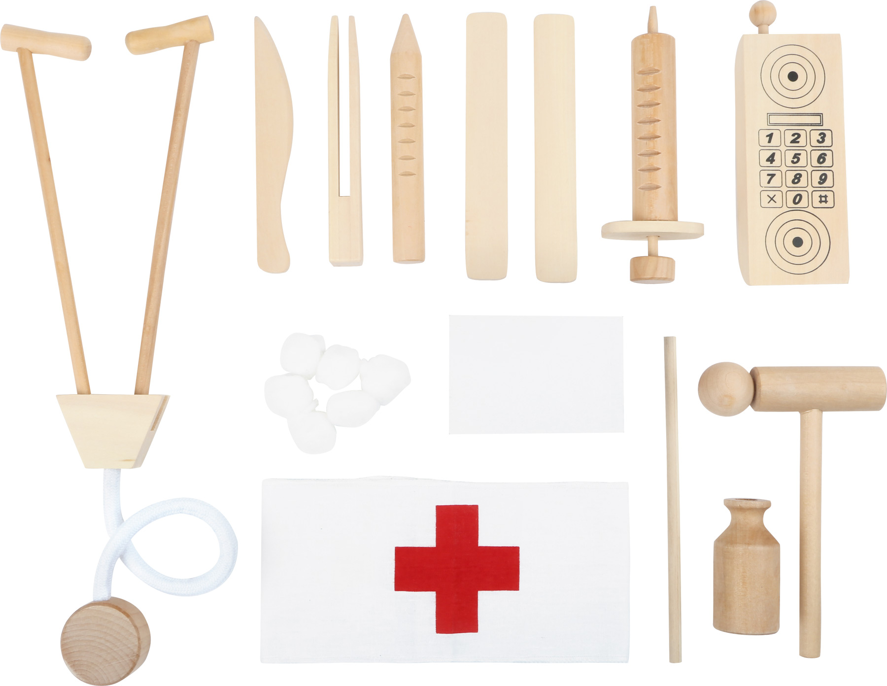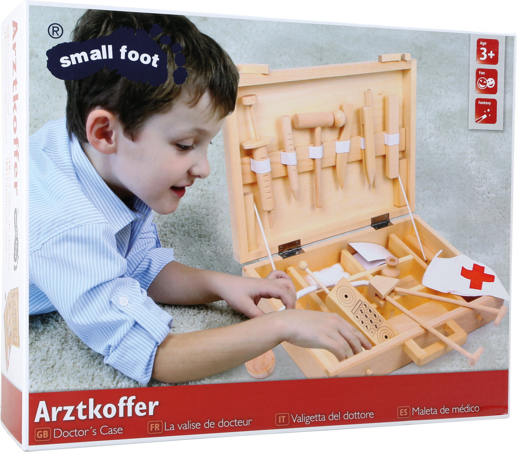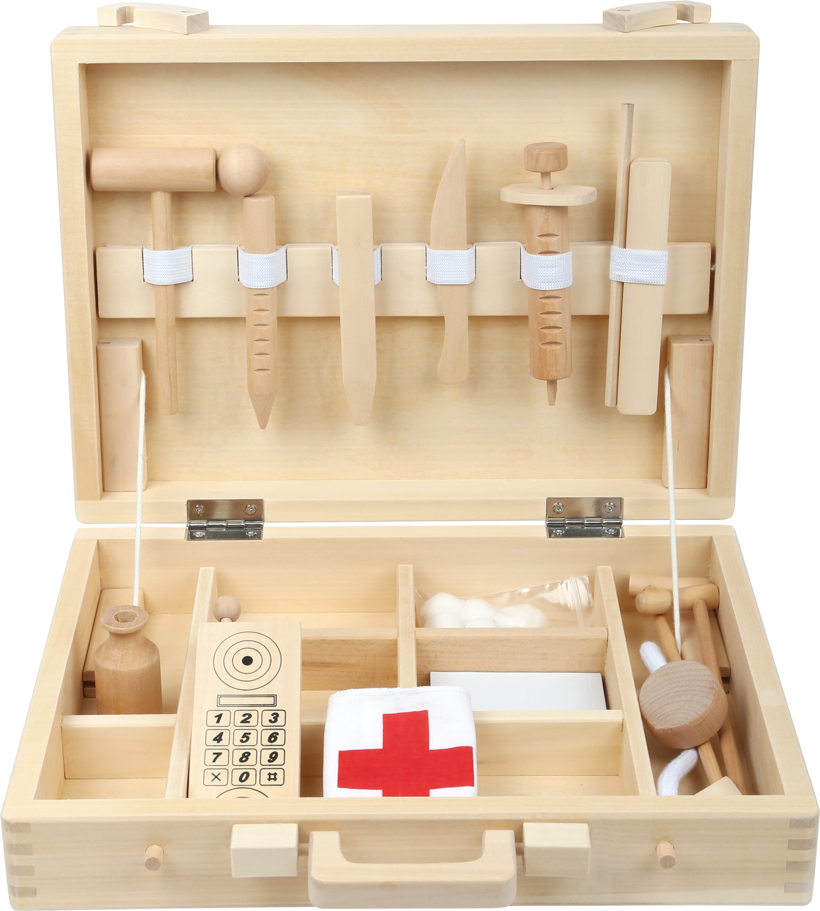 Mit diesem Arztkoffer aus Holz kann beim nächsten Arztbesuch nichts mehr schief gehen. Denn dieser Koffer beinhaltet alles, was ein Doktor braucht: Stifte, Notfalltelefon und sogar Spritzen. Hochwertiger Holzkoffer mit reichhaltigem Inhalt. Wenn der Koffer zu Hause noch mit Verbandsmaterial bestückt wird, kennen die kleinen Helfer kein Halten mehr.
