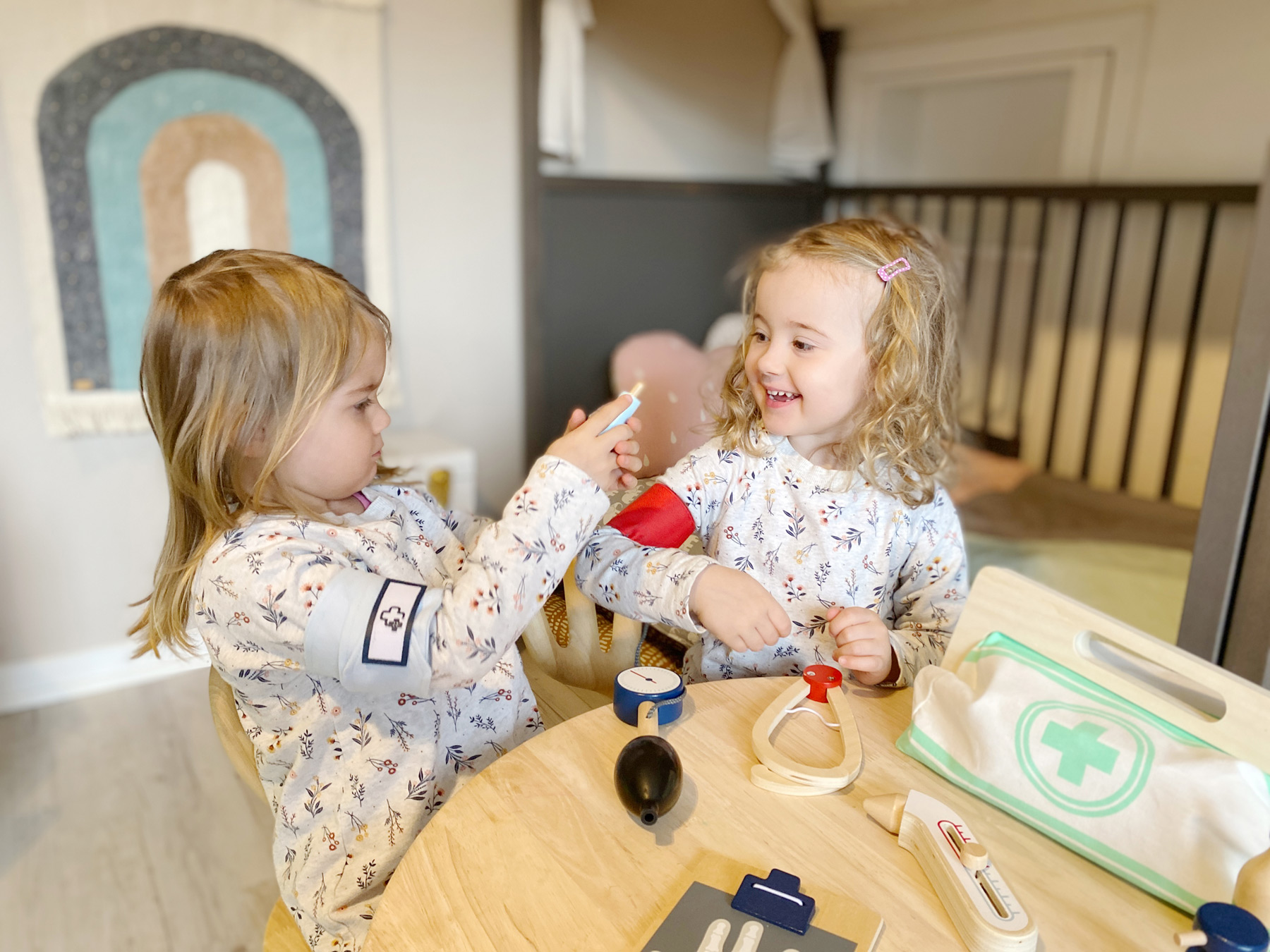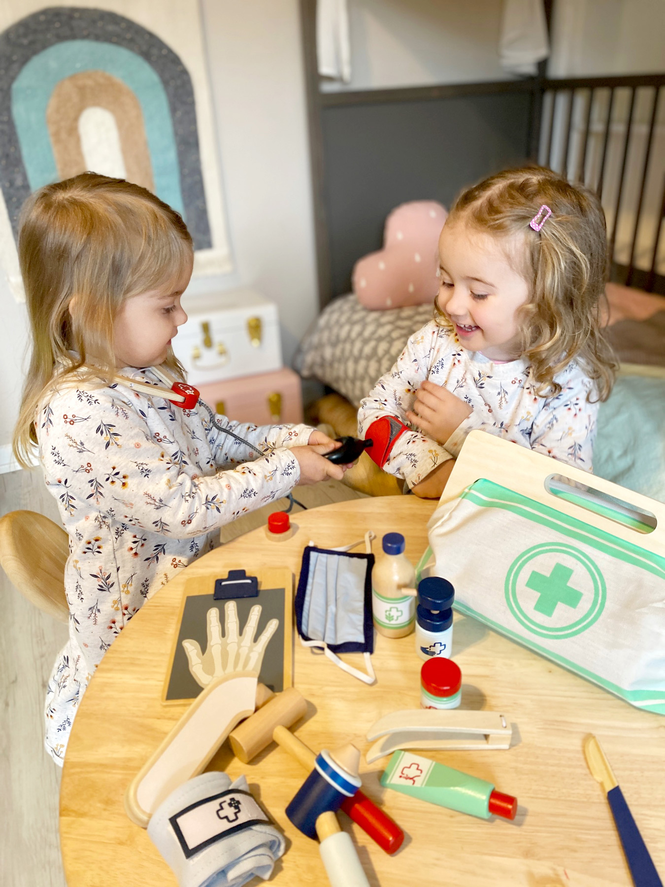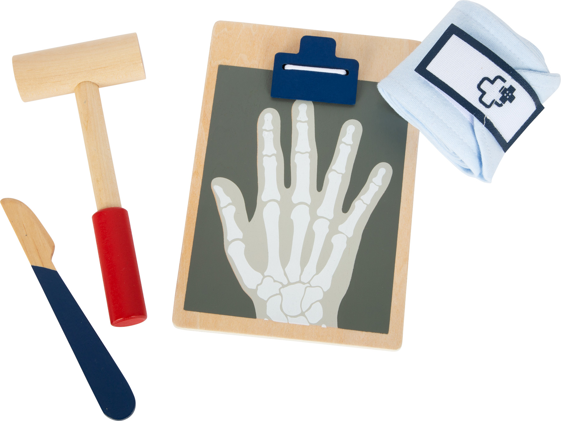 Mit dieser typischen Arzttasche sind kleine Mediziner perfekt ausgestattet! Die Tasche aus weichem Stoff überzeugt optisch und funktionell mit seinen kinderleicht zu öffnenden und durch Magnete sicher schließenden Griffen aus naturbelassenem Holz. Im Inneren der Medizinertasche findet sich alles, was zur Behandlung gebraucht wird: Stethoskop, Fieberthermometer, Spritze und vieles mehr aus robustem Holz! Highlights sind das Blutdruckmessgerät mit Pumpball und das Otoskop mit echtem Vergrößerungsglas. Ein umfangreiches Arztspielzeug-Set, das viele “echte” Utensilien und Geräte aus dem Medizinbereich enthält und alles in einem praktischen Täschchen vereint, was Kinder fürs Arzt-Patienten-Rollenspiel brauchen! Mit den robusten und haptisch angenehmen Medizingeräten aus Holz können Kinder im Rollenspiel erkunden und üben, was für eine ärztliche Behandlung notwendig ist. Die Grafiken auf den Utensilien geben Hinweise, wofür diese im Spiel verwendet werden können. Ideal für unterwegs!