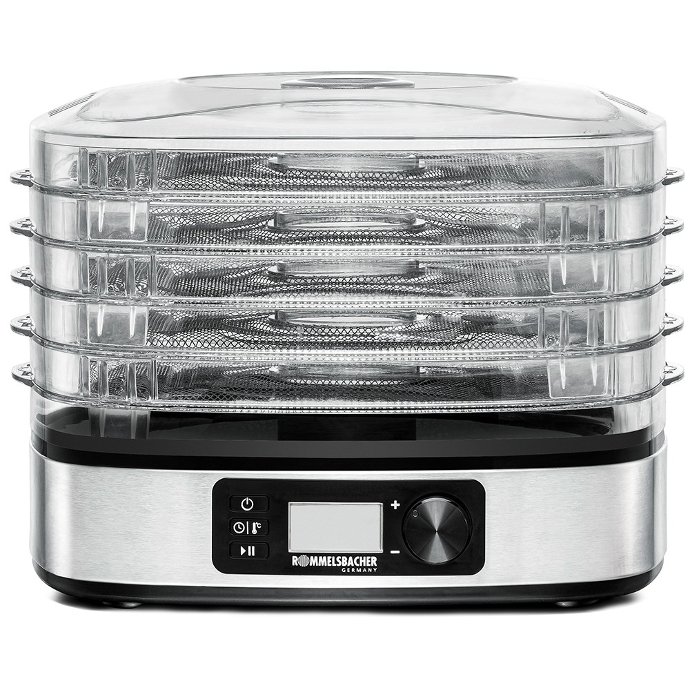 Zum schonenden Trocknen von Obst, Gemüse, Kräutern, Pilzen & mehr – der kompakte Dörrautomat DA 350 ergänzt die Rommelsbacher Dörrgeräte-Familie ideal. Trocknen als älteste Form der Lebensmittelkonservierung erlebt ein modernes Revival. Diese schonende Art der Haltbarmachung ganz ohne Zusatz- und Konservierungsstoffe ist aus der zeitgemäßen Küche nicht mehr wegzudenken. Temperaturgenau und gleichmäßig gelingt dies natürlich am besten mit einem hochwertigen elektrischen Dörrgerät wie dem DA 350. Die Dörretagen sind mit feinmaschigen Gittern aus hygienischem Edelstahl ausgestattet und – als clevere Besonderheit – sogar höhenverstellbar. Im Handumdrehen wird das Volumen verdoppelt. Das Gerät arbeitet energiesparend und leise und ist zudem einfach zu bedienen. Die Temperaturwahl reicht von 35 °C fürs rohköstliche Dörrvergnügen bis hin zu 75 °C fürs schnelle Power-Dörren. Zusammen mit der 36 Stunden Zeitschaltuhr bietet dies maximale Nutzungsmöglichkeiten. Zwei Silikon-Formen für die Herstellung von 8 Müsliriegeln komplettieren diesen modernen Dörrautomaten. Leckere Snacks und gesunde Süßigkeiten entstehen somit genau so bequem wie knackige Gemüsechips, Tees, Trockenfrüchte fürs Müsli und Leckerlis für Tiere. Egal welchem der aktuellen Ernährungsrichtungen man folgt oder welche trendigen Delikatessen man ausprobieren möchte – der DA 350 ist der passende Begleiter.