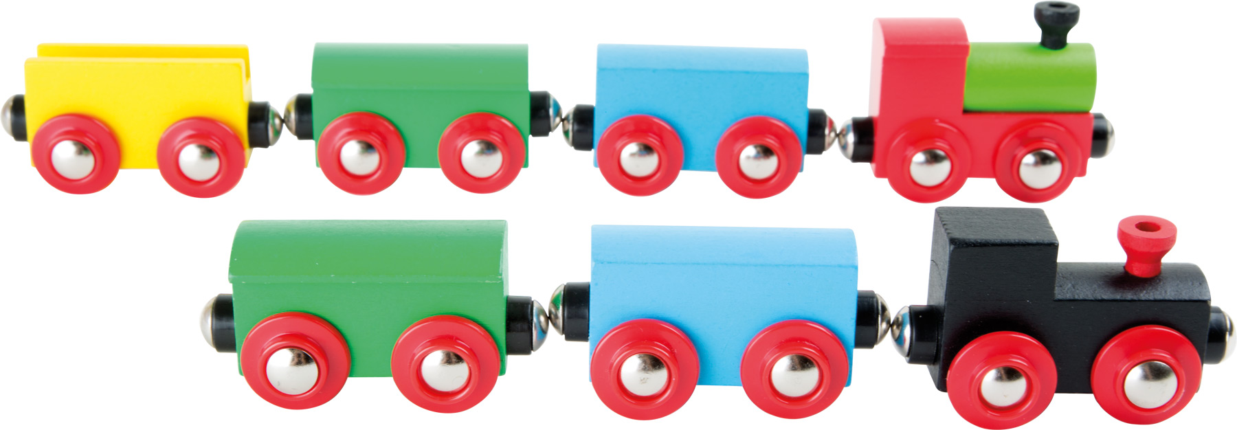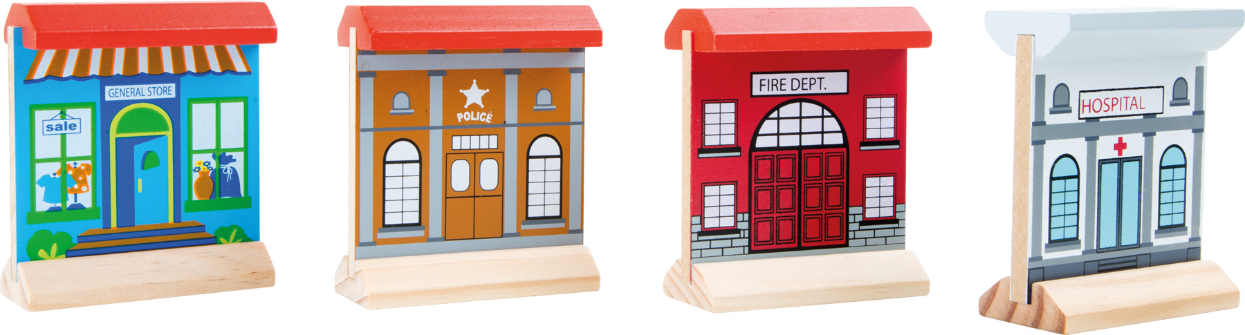 Mit diesem vielseitigen Eisenbahnset aus Holz kann das Eisenbahnerleben losgehen. Robuste Holzschienen und Weichen lassen die Eisenbahnwagen sicher zu ihrem Ziel fahren. Bäume und verschiedene Gebäude aus Holz runden das Landschaftsbild ab.