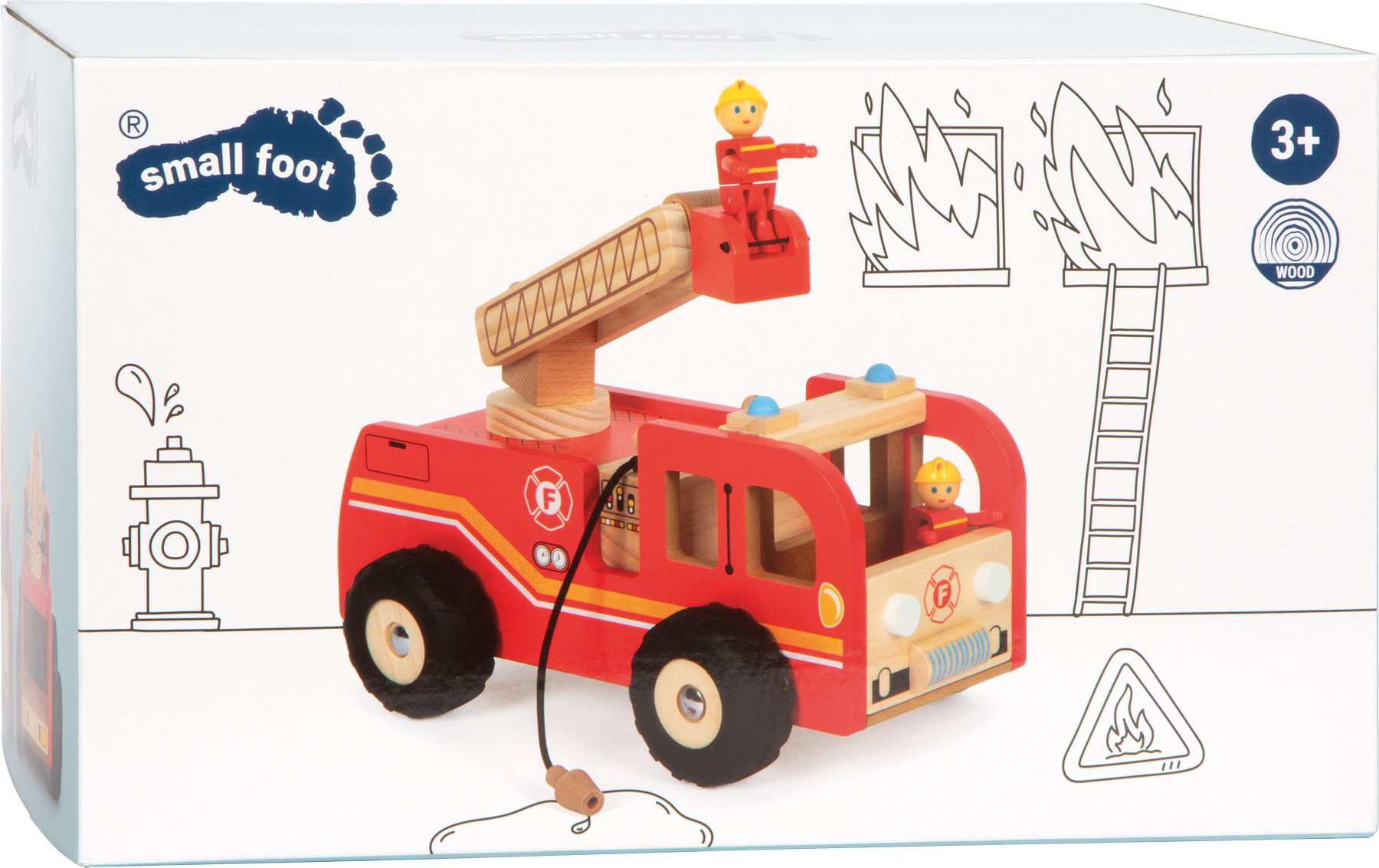 Ganz gleich, ob es brennt oder ob sich eine Katze nicht mehr von allein aus einer Baumkrone befreien kann – mit diesem Feuerwehrauto, der einstellbaren Drehleiter und vielen weiteren Funktionen ist schnelle Hilfe garantiert! Das Fahrzeug aus robustem Holz und mit stabilen Achsen düst mit zwei Feuerwehrmännern über jeden Untergrund. Das Feuerwehrauto mit Drehleiter regt die Fantasie an und rückt zu immer neuen Einsätzen unter der Regie des Einsatzleiters aus. Perfekt auch als Ergänzung zu Spielteppichen.