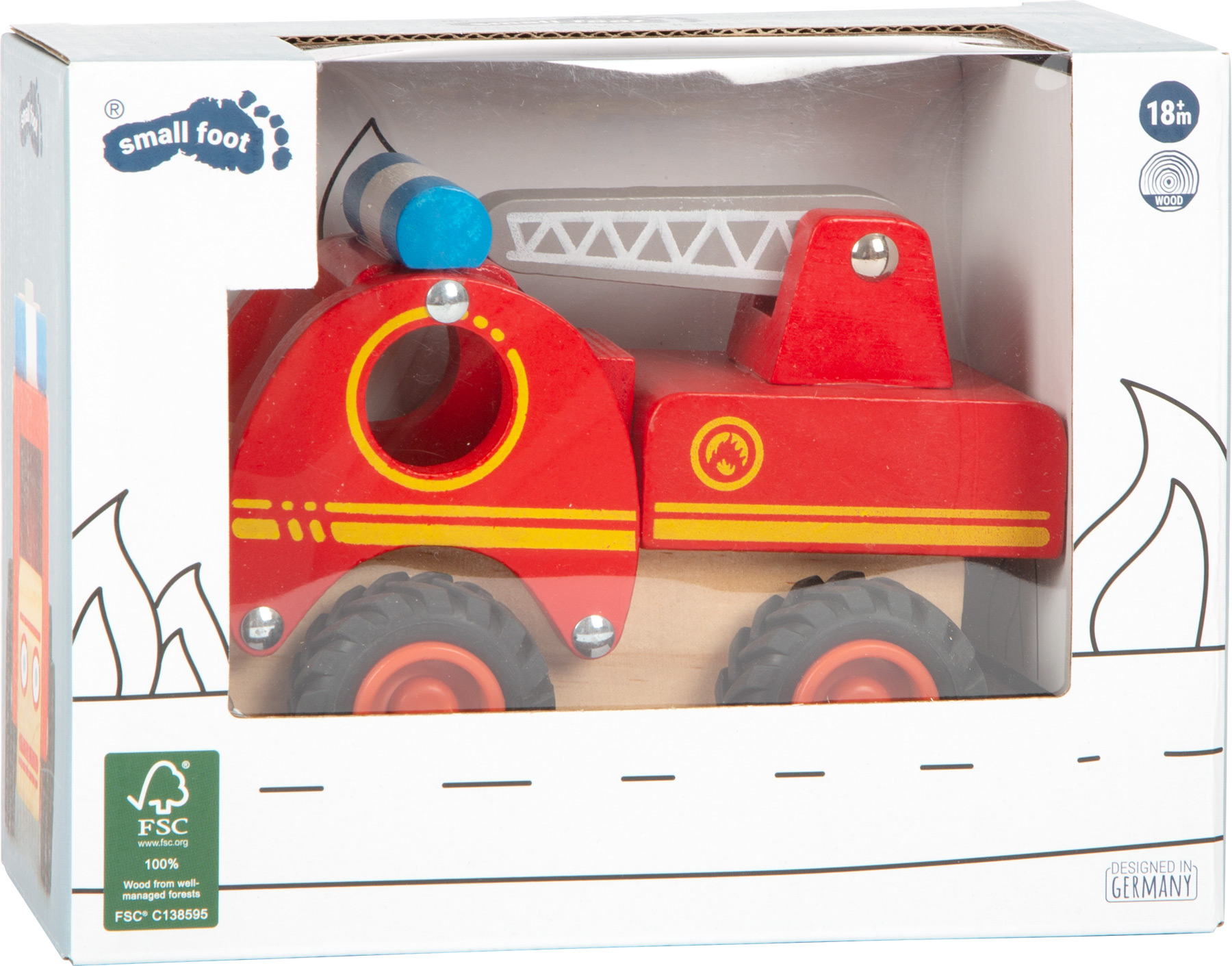 Diese Feuerwehr ist im Nu zur Stelle! Für kleine Feuerwehrleute bietet dieses niedliche Fahrzeug aus FSC® 100%-zertifiziertem Holz großen Spielspaß. Die bewegliche Leiter lässt Feuerwehrleute auch an hochgelegene Einsatzorte gelangen. Auf gummierten, geräuscharmen Reifen navigiert der Einsatzwagen zum nächsten Einsatzort. Ein ideenreicher Spielspaß, der die soziale Kompetenz fördert und in keinem Fuhrpark fehlen darf.