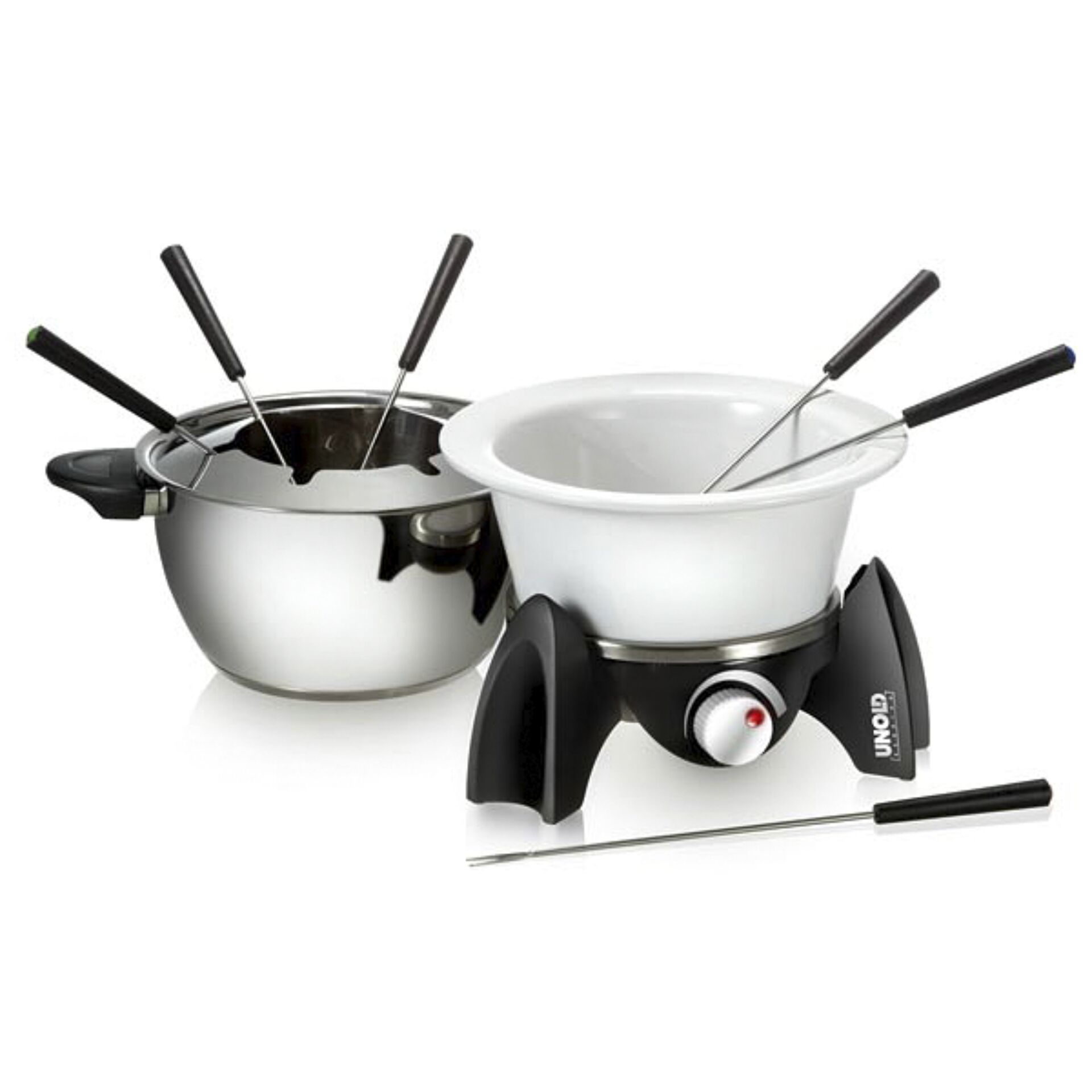 Multifunktionales FONDUE-SET für sechs PersonenAlles in einem: Fleisch-Fondue, Käse-Fondue und Schoko-Fondue. Geht nicht? Geht doch – mit dem FONDUE-SET von UNOLD. Neben dem Edelstahl-Topf für das klassische Fleisch-Fondue gibt es jetzt noch einen obendrauf: Den formschönen, unverwüstlichen Keramiktopf, in dem Schokolade oder Käse super-sanft geschmolzen werden können. Nichts kann anbrennen, dank einem stufenlos regulierbaren Temperaturregler mit Kontrollleuchte. Und damit es der Tischplatte nicht zu heiß wird, steht das FONDUE-SET auf speziellen Cool-Touch-Füßen. Einen Spritzschutz aus Edelstahl mit Gabelhalterung macht die Sache perfekt.