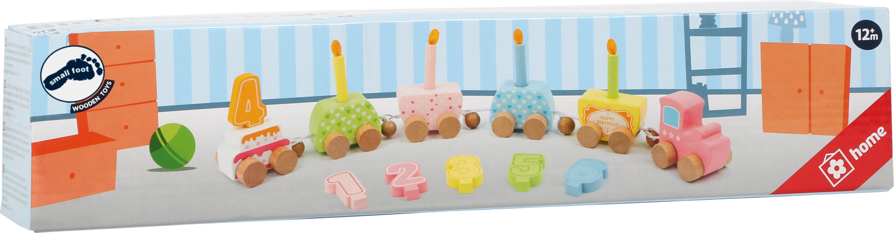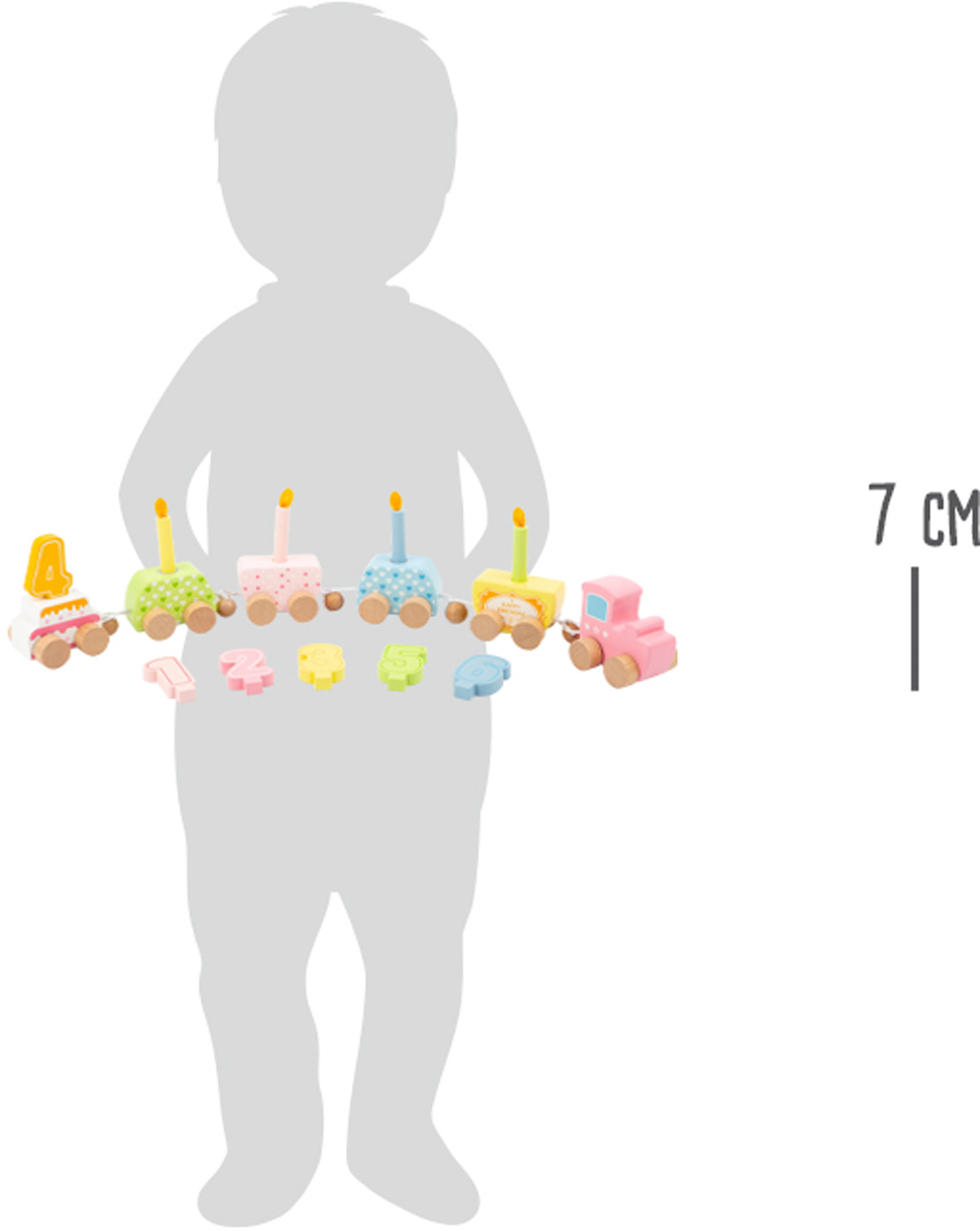 Nächster Halt: Geburtstagstisch! Liebevoll in Pastelltönen lackiert, fährt der Zug zwischen Geschenken und Kuchen ein. Mit ihm fünf Waggons, auf die insgesamt vier Holzkerzen und Geburtstagszahlen von 1 bis 6 gesteckt werden können. Alle Waggons lassen sich einzeln lösen und beliebig anordnen. Ein Hingucker für den Geburtstagstisch!