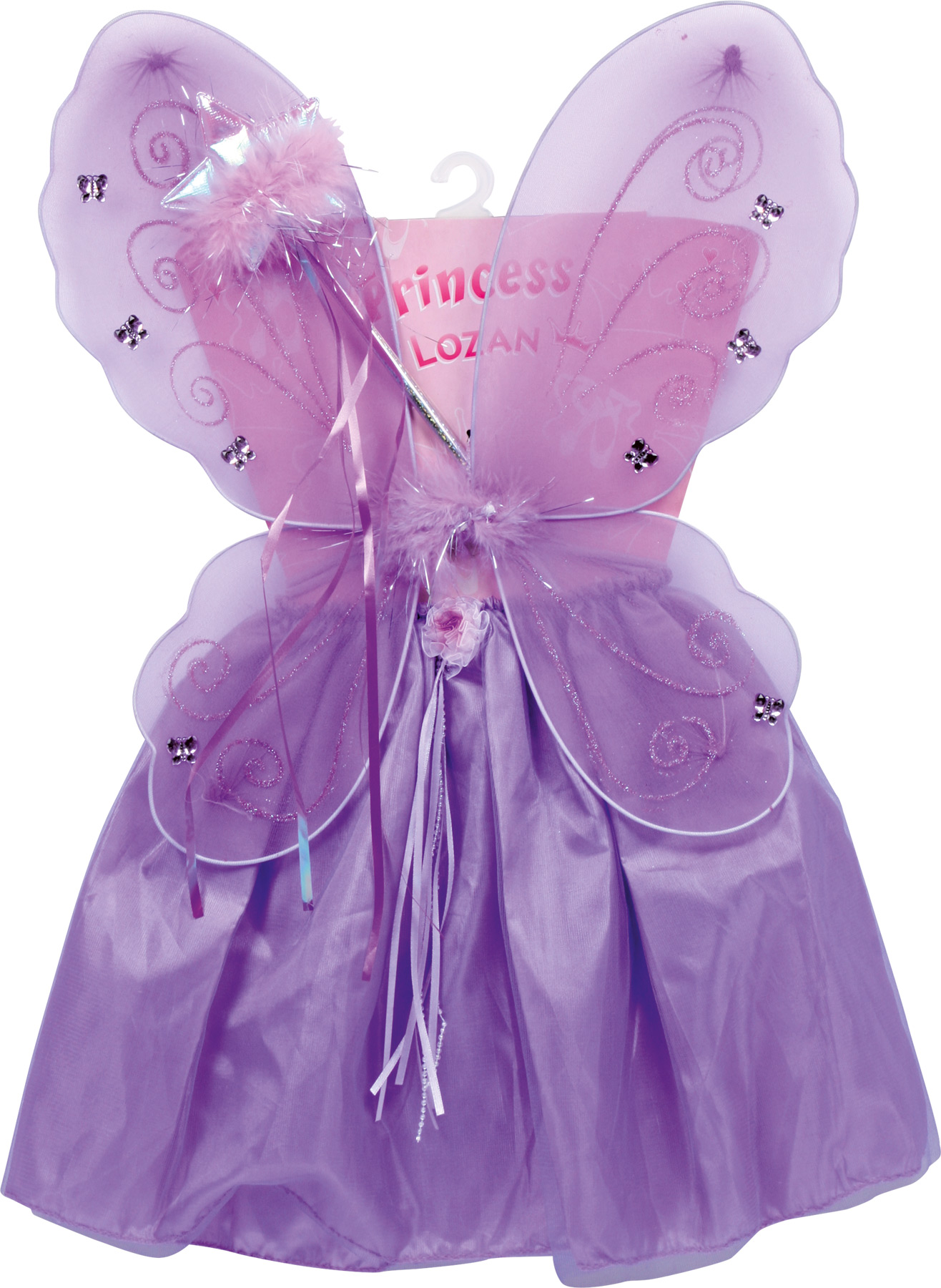 Wie aus einem Märchen wirkt dieses fliederfarbene Kostüm, bestehend aus Satin-Tüll-Rock mit kleiner Rüschen-Rose, Zauberstab mit Glitzerspitze und wunderschönen Feenflügeln mit glitzernen Schmetterlingen. „Perlenketten“ und sanft schimmernde Bänder zieren Rock und Zauberstab.