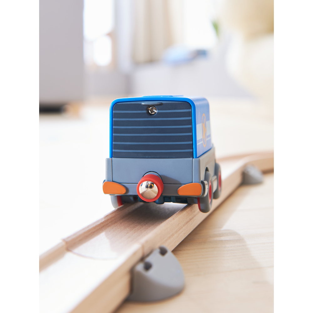 Der blaue Batterie-LKW bringt noch mehr Fahrspaß in die aufregende Kullerbü-Spielwelt von HABA. Dank raffiniertem Batterieantrieb fährt das Kullerbü-Fahrzeug von selbst durch die Bahnen. Besonders praktisch: Um die Batterie zu schonen, stoppt das Fahrzeug automatisch nach einer Minute. Wer mag, kann den Batterie-LKW natürlich auch manuell bedienen, zum Beispiel fürs freie Spielen am Boden. Die Kullerbü-Fahrzeuge mit Batterieantrieb sorgen für noch mehr Tempo auf den Bahnen und begeistern junge Autofans ab 2 Jahren. Sie sorgen für viel Abwechslung und schulen ganz nebenbei feinmotorische Fähigkeiten.