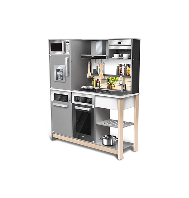 Die hochwertige Kinderspielzeugküche aus Holz setzt kleinen Koch-Fans keine Grenzen. Ihnen stehen neben Herd und Mikrowelle auch ein Kochfeld zur Verfügung, das ihre Herzen höherschlagen lässt: Es simuliert mit Licht- und Soundeffekten echtes Kochen! Einfach den Topf aufstellen und schon können kleine Meisterköche und Meisterköchinnen ihrer Fantasie freien Lauf lassen und leckere Mahlzeiten kreieren. Alle köstlich zubereiteten Gerichte lassen sich im Kühlschrank aufbewahren. Dieser ist ein ganz besonderes Highlight: denn er spendiert den kleinen Genießern/innen sogar Spielzeug-Eiswürfel!Im Spülbecken lässt sich das benutzte Kochgeschirr reinigen, damit es für die nächste Mahlzeit wieder benutzt werden kann. Die Spielzeugküche bietet mit ihren coolen Effekten und verspielten Accessoires jede Menge Spaß und schult nebenbei noch die Motorik sowie die Kreativität kleiner Kochprofis.
