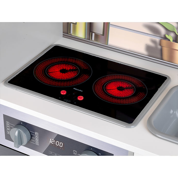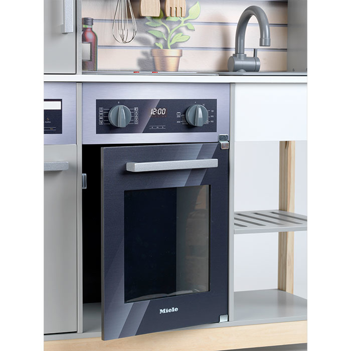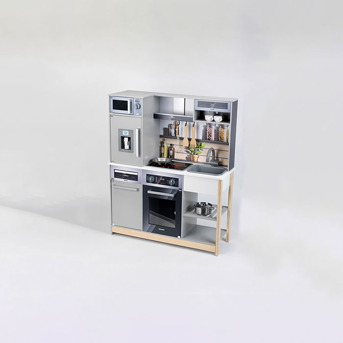 Zu der großen FSC-zertifizierten Holz-Spielzeugküche gehört ein Kochfeld mit Sound- und zweifacher Lichtfunktion, ein Herd, eine Mikrowelle, ein Kühlschrank mit Eiswürfelspender und ein entnehmbares Spülbecken. Hinzu kommt das hochwertige Zubehör aus Metall und Holz: ein Topf mit Deckel, eine Pfanne, ein Rührbesen sowie ein Koch- und Rührlöffel.