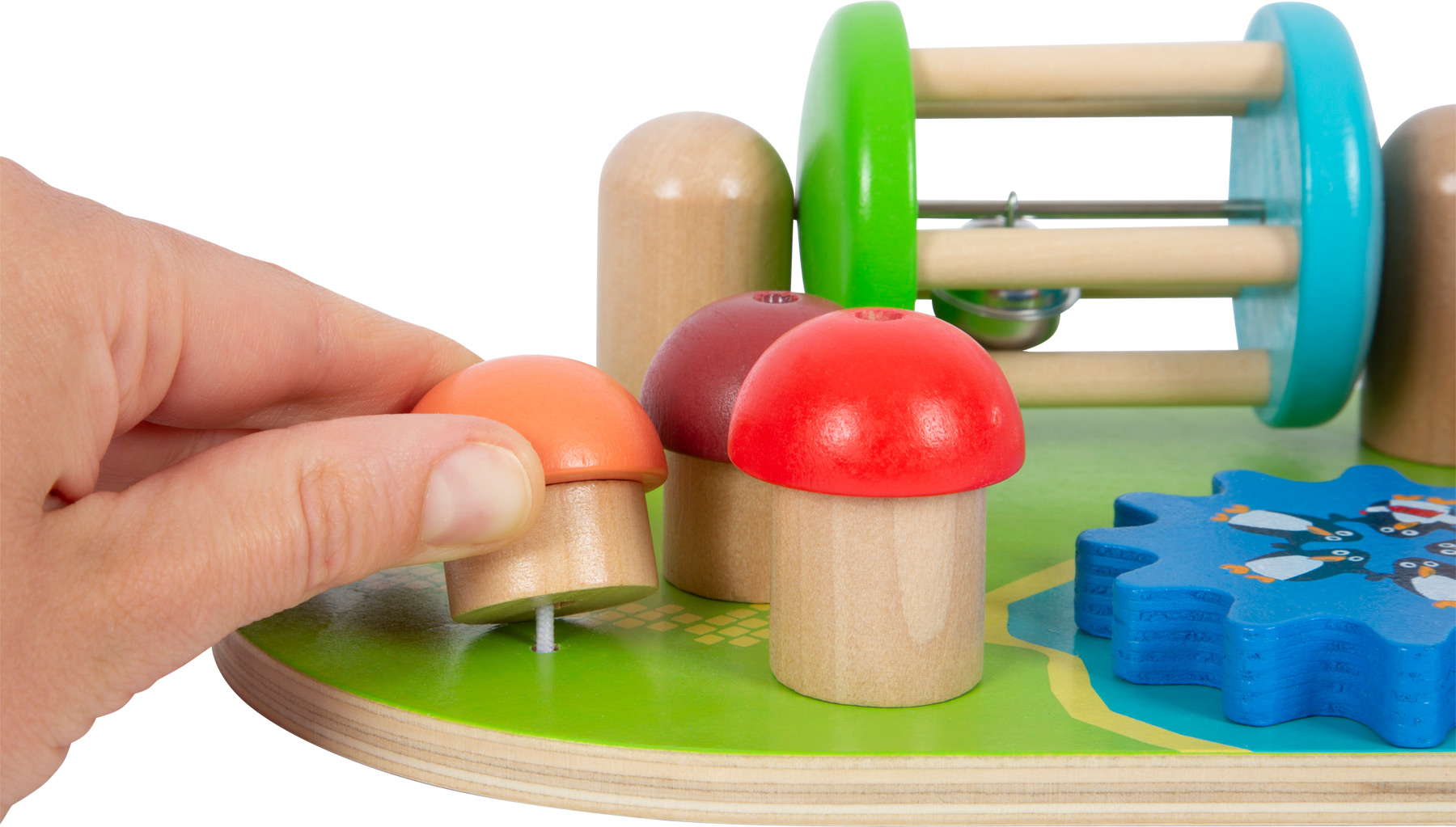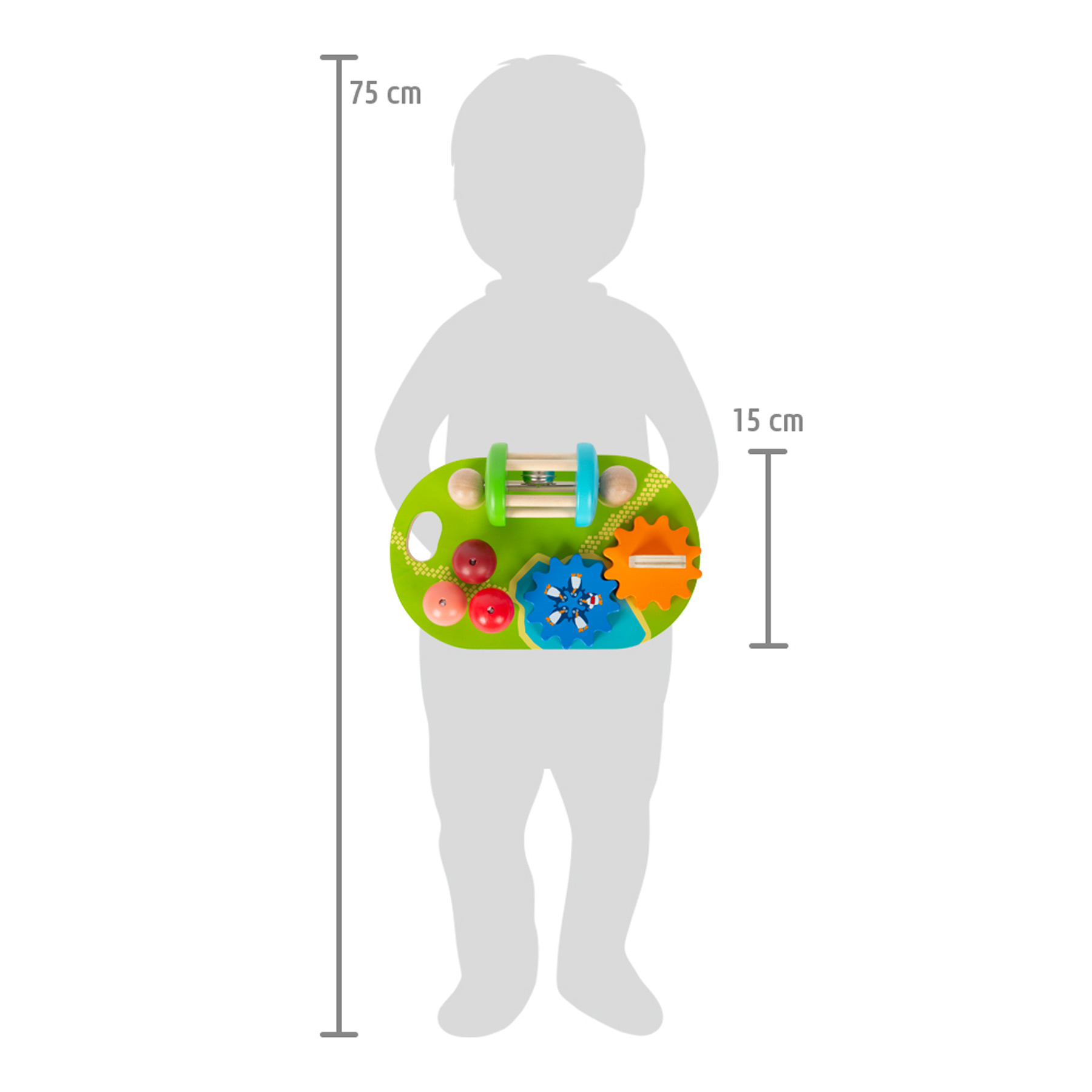 Spiel- und Motorikspaß für die Kleinsten! Dieses farbenfrohe und kindgerecht gestaltete Motorikbrett aus Holz eröffnet Kleinkindern eine Vielzahl an Spiel- und Beschäftigungsmöglichkeiten zur Förderung der Feinmotorik. Während die beiden Zahnräder gedreht und die mit Gummis befestigten Elemente geklappt werden können, sorgt die drehbare Rassel mit Glöckchen für akustische Reize. Beim Klappen, Drehen und Ziehen trainiert das Aktivitätsboard das Greifen sowie die Hand-Augen-Koordination. Ein Holzspielzeug, das die Motorik optimal fördert. Kann zum Spielen sowohl hingelegt, als auch an dem ausgesparten Griff festgehalten werden.