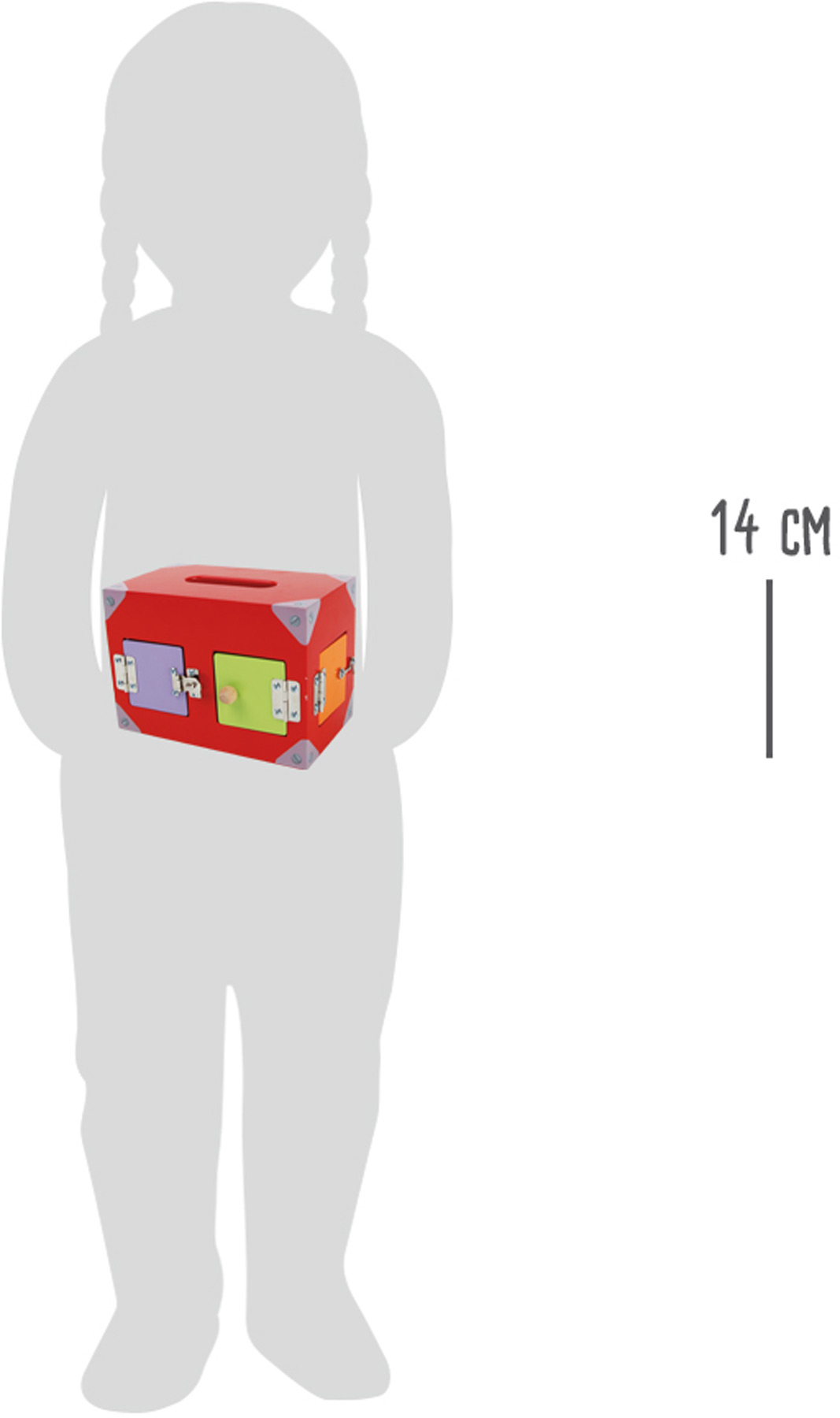Eine Kiste mit vielen leuchtend-farbigen Fenstern und Türchen. Alle sind mit unterschiedlichen Verschlüssen ausgestattet. Doch wer bekommt sie auf? Hier sind Aufmerksamkeit und Ausdauer gefragt. Durch die filigranen Verschlüsse wird auch die Feinmotorik geschult. Eine knifflige Angelegenheit.