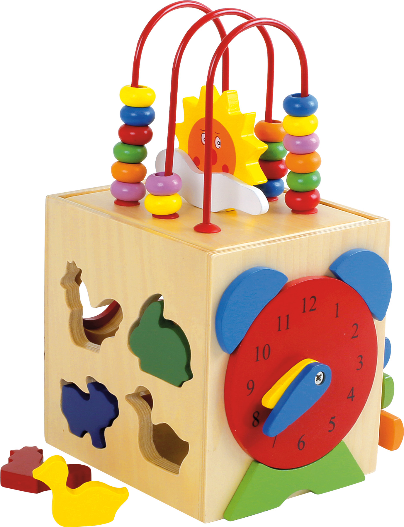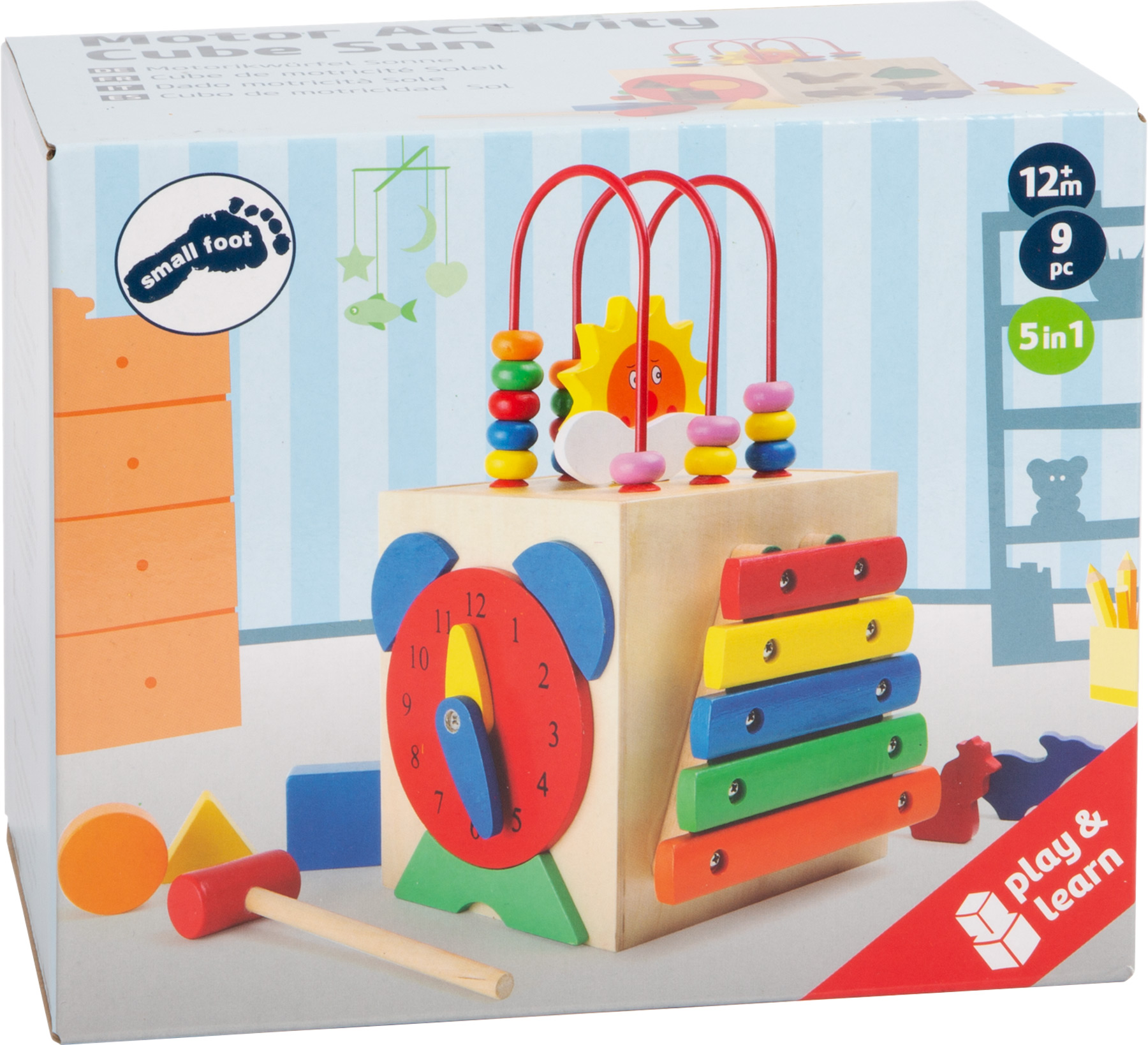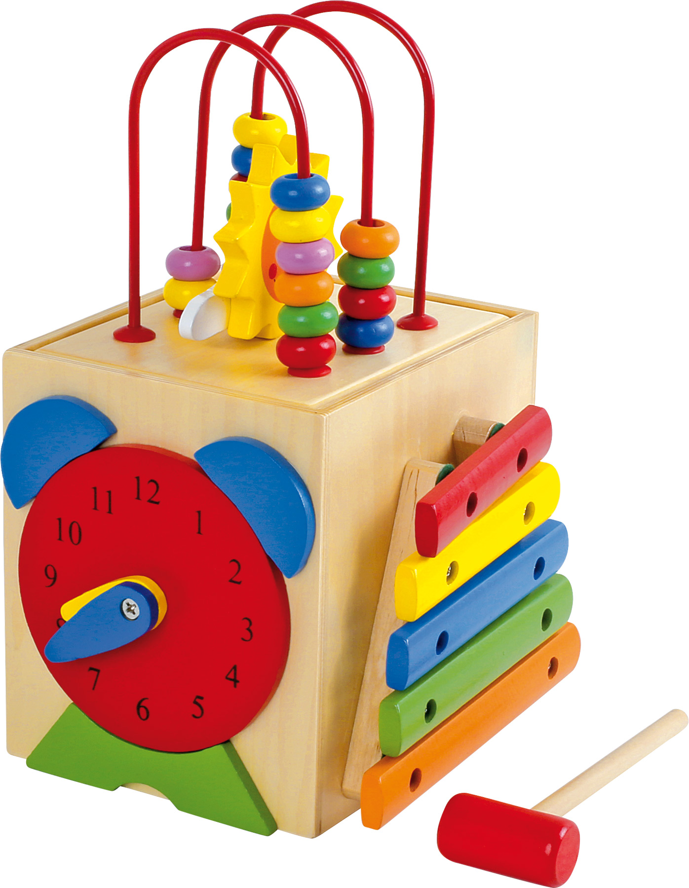 Ein Spielwürfel der besonderen Art: Mit Xylophon, Steckspiel, Lernuhr und Motorikschleife ist dieser multifunktionale Motorikwürfel das ideale Spielzeug zum Spielen und Lernen. Hier können auf fünf bespielbaren Seiten motorische Fähigkeiten erlernt und geübt werden. Eignet sich auch für die musikalische Früherziehung und das Erlernen der Uhrzeit.