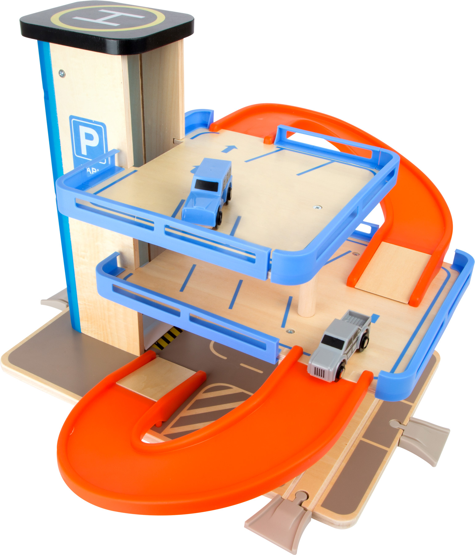 Drei Ausfahrten, ein Kurbel-Aufzug und die breite Fahrbahn machen dieses stabile Parkhaus zu einem echten Hingucker. Die Eisenbahnschiene läuft durch das Parkhaus und ist mit handelsüblichen Schienen kombinierbar. Ein Holzspielzeug mit dauerhaften Spielwert, inkl. 2 Autos.