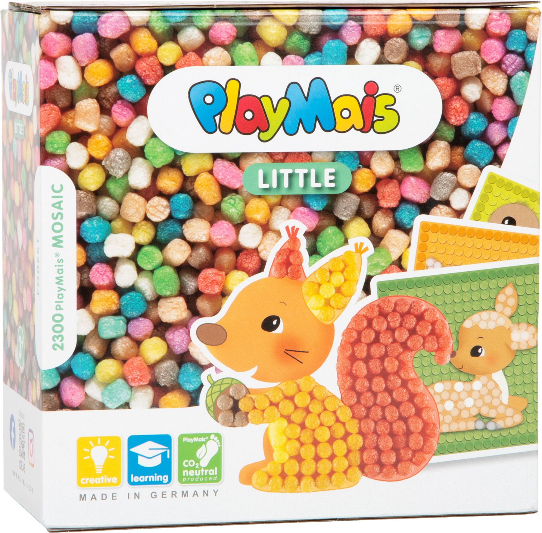 Mit diesem MOSAIC-Set von PlayMais® entstehen bunte Bilder und Figuren von Waldtieren. Beim Nachlegen der sechs Vorlagenbilder werden die Feinmotorik und die Hand-Augen-Koordination trainiert. Das Set enthält mit Lebensmittelfarbe gefärbte PlayMais® aus Maisstärke. Durch Anfeuchten wird die natürliche Klebefähigkeit des PlayMais® aktiviert und schon geht der Bastelspaß los. Inkl. Anleitung und Zubehör. Beim Basteln werden Kreativität und Motorik gefördert. Das natürliche Spielzeug ist 100% biologisch abbaubar und ohne künstliche Zusatzstoffe – für Kinder absolut unbedenklich.