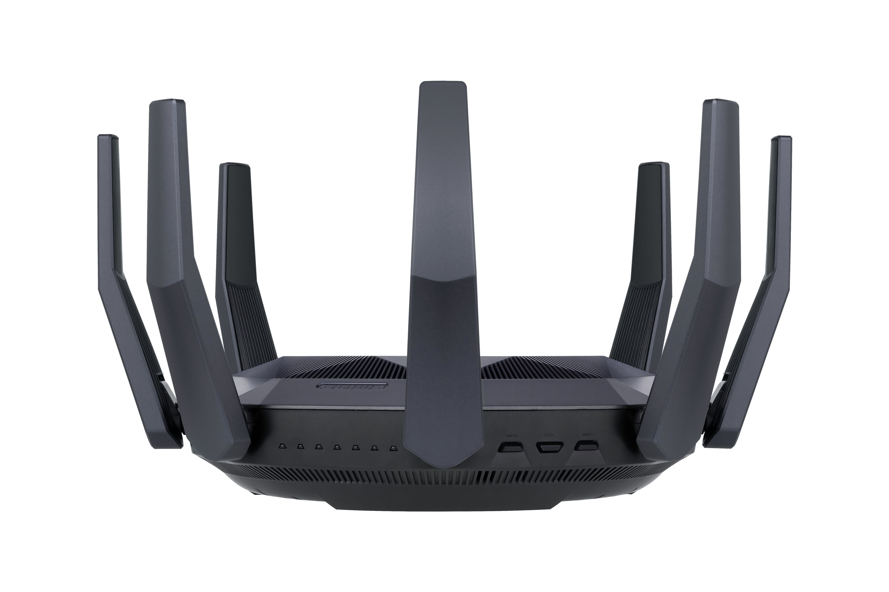 Der RT-AX89X ist ein 8x8 Dual-Band WLAN-Router mit 1024-QAM für deutlich schnellere drahtlose Verbindungen. Mit einer Gesamtnetzwerkgeschwindigkeit von etwa 6000Mbit/s – 1148Mbit/s im 2,4 GHz-Band und 4804Mbit/s im 5 GHz-Band – ist der RT-AX89X 2,8x schneller als 4x4 Dual-Band-Router, die den 802.11ac-Standard nutzen.