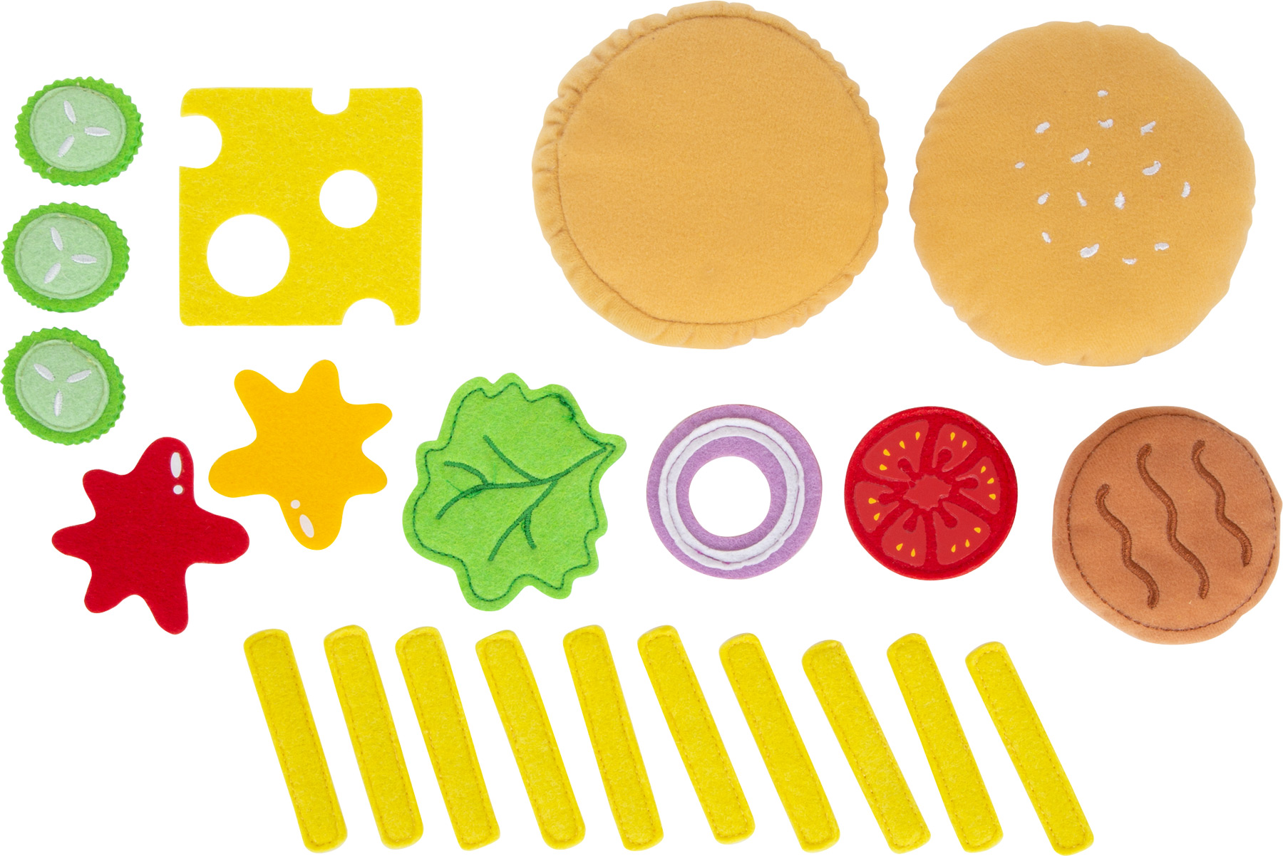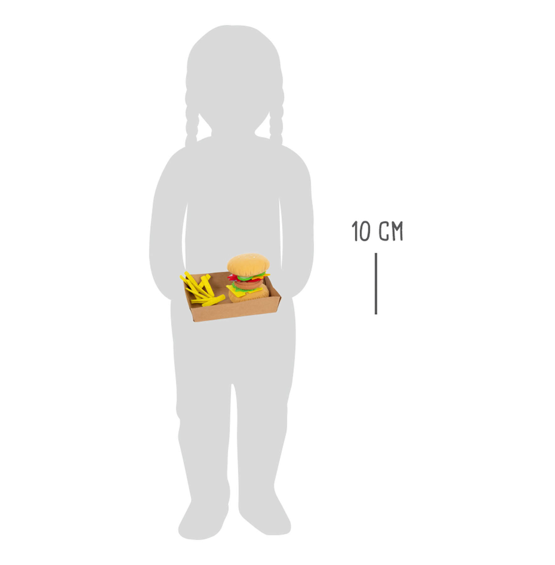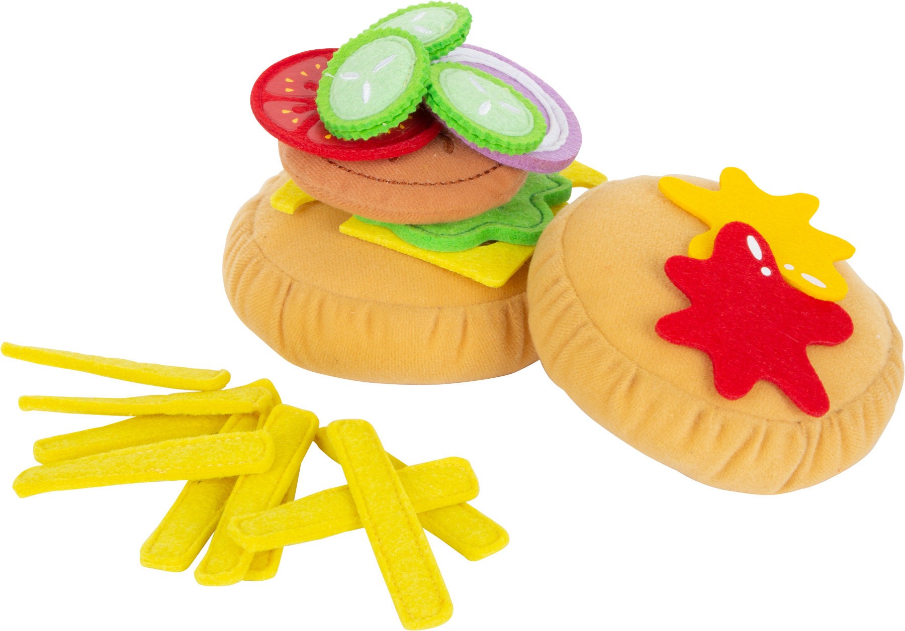 Fastfood-Fans aufgepasst! Mit diesem Hamburger-Set kommt ein leckerer Burger mit Pommes auf den Tisch. Für das Burger-Brötchen aus weichem Plüsch stehen als Belag eine Bulette, eine Käsescheibe, drei Gurkenscheiben, eine Tomatenscheibe, eine Salatscheibe, ein Zwiebelring sowie Ketchup und Majo aus Filz zur Auswahl. Besonders praktisch: Dank der rauen Stoff-Oberfläche bleibt alles in Position und rutscht nicht aus den belegten Brötchenhälften heraus. Mit der Käsescheibe wird im Nu aus dem Hamburger ein Cheeseburger! Burger und Pommes werden wie in einem richtigen Schnellrestaurant in einer detailgetreuen Schachtel serviert. Dieses Spiellebensmittel-Set ist eine ideale Ergänzung für Kinderküche, Kaufladen oder den Picknick-Korb! Beim Zubereiten fördern Kinder ihre motorischen Fähigkeiten im aktiven Rollenspiel. Ein Muss für jede Kinderküche!