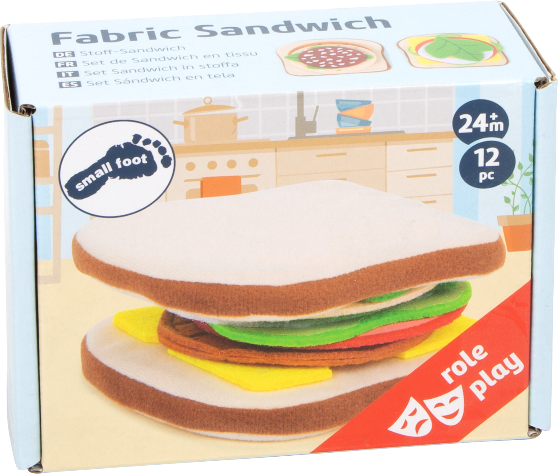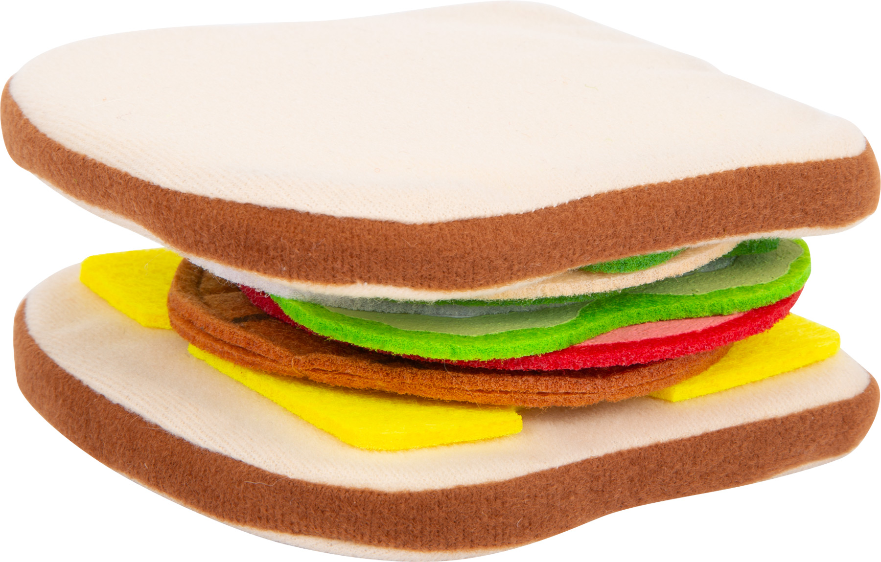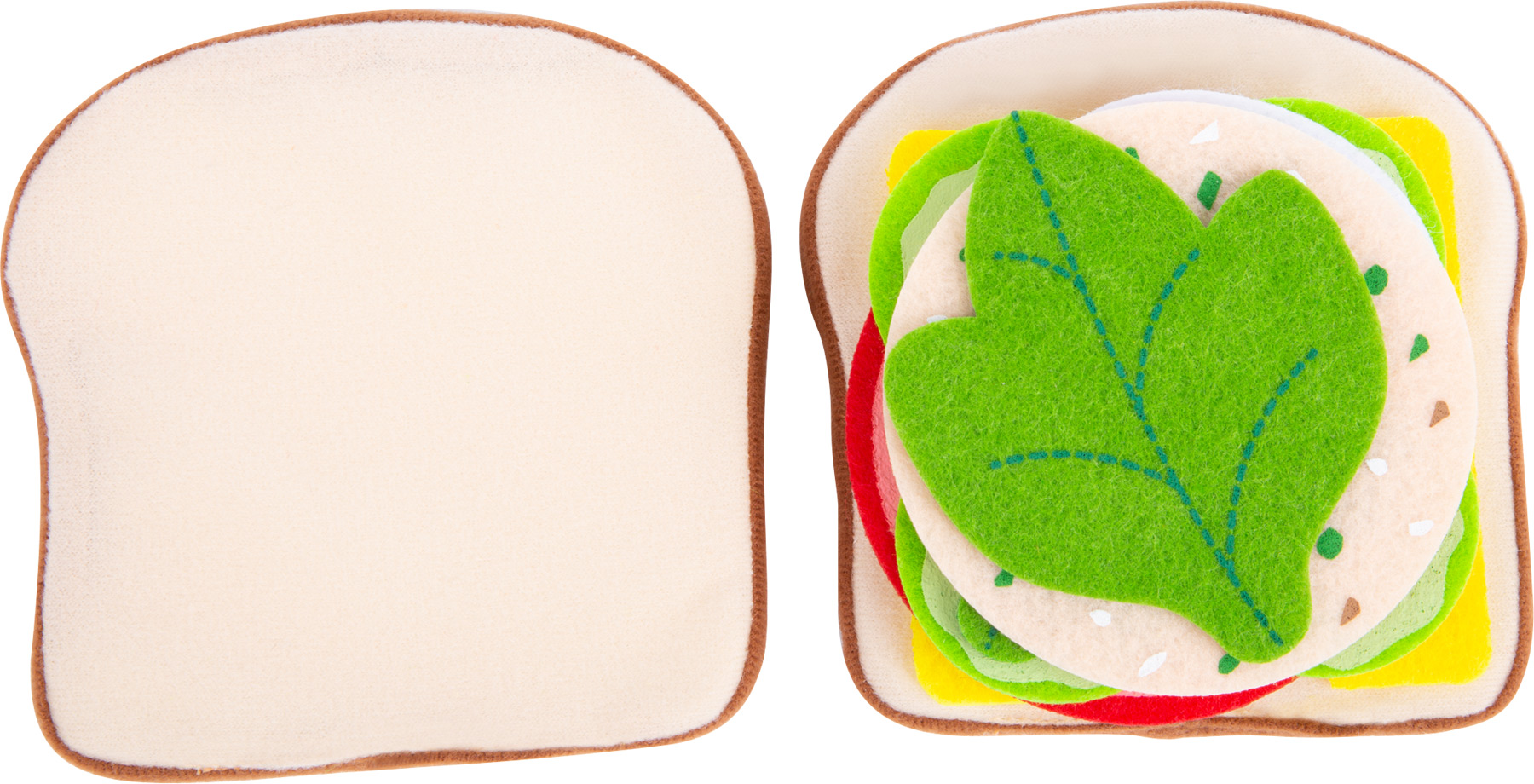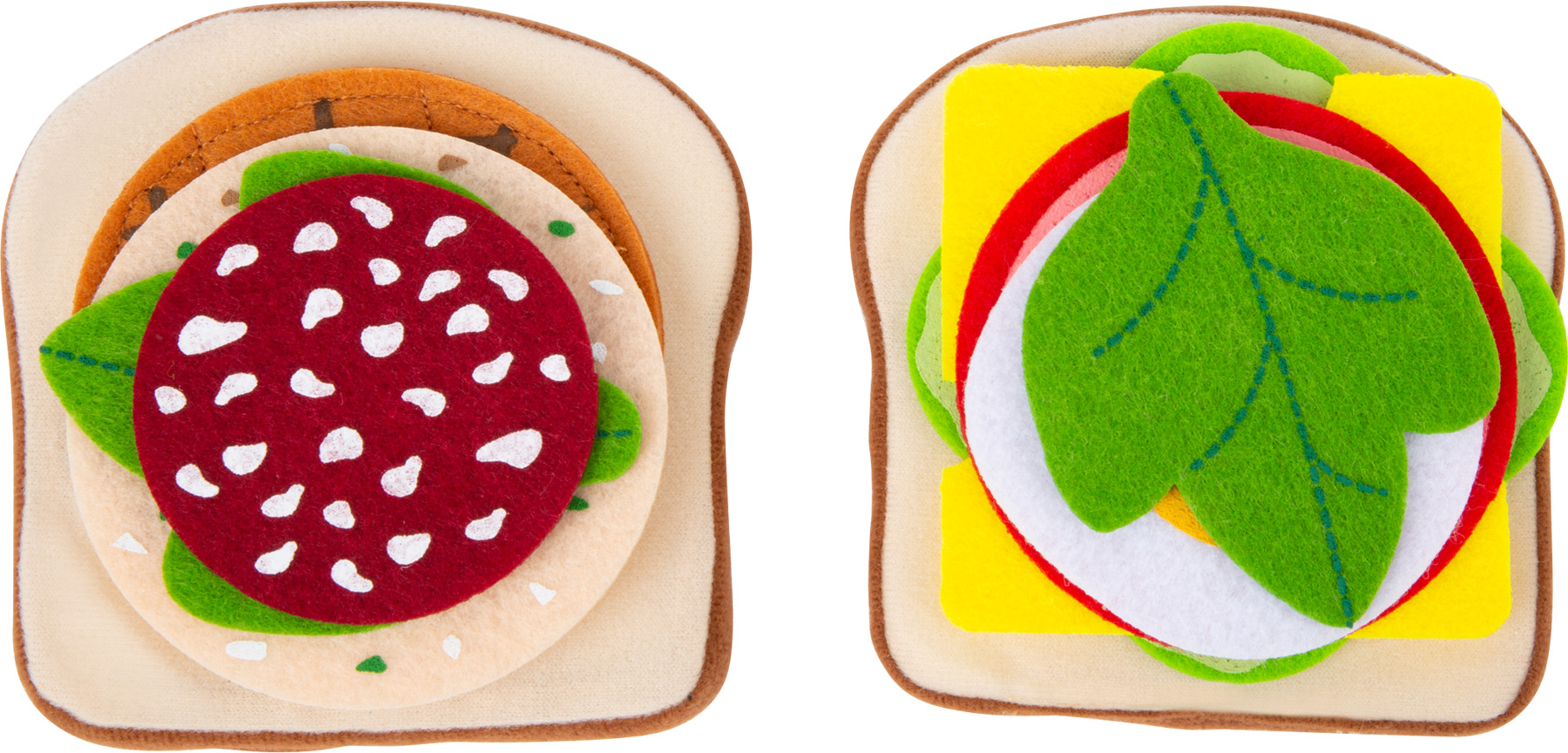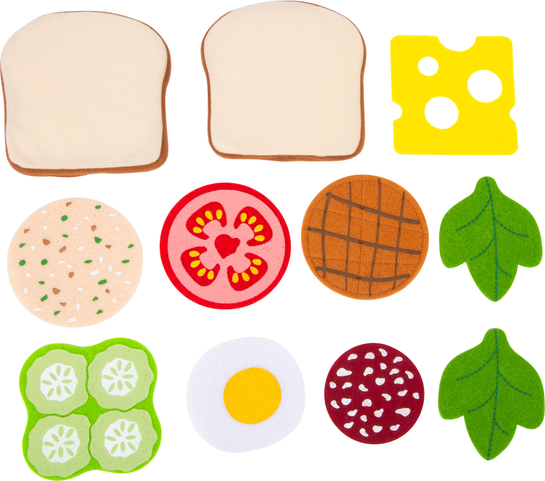 Heute gibt es Sandwich! Die weichen Toastbrot-Scheiben können ganz nach Belieben belegt werden, denn als Belag stehen Käse, Salat, Gurke, Tomate, Ei, Salami, Wurst und Bulette aus Filz zur Auswahl - da bleiben keine Wünsche offen. Besonders praktisch: Dank der rauen Stoff-Oberfläche bleibt alles in Position und rutscht nicht aus dem belegten Brot heraus. Dieses Spiellebensmittel-Set aus Stoff ist eine ideale Ergänzung für Kinderküche, Kaufladen oder den Picknick-Korb! Beim Zubereiten einer leckeren Zwischenmahlzeit fördern Kinder ihre motorischen Fähigkeiten im aktiven Rollenspiel.