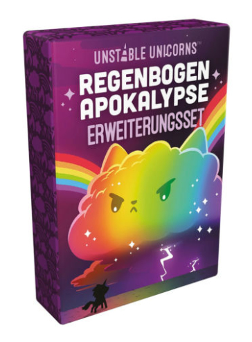 Bezwingt eure Gegner mit Zuckerwatte … oder einer fatalen Seuche.Dieses Regenbogen-Apokalypse Erweiterungsset enthält 54 Karten für apokalyptisch süße Unstable Unicorns-Partien. Es ergänzt das beliebte Partyspiel um 27 wunderbar destruktive Karten und weitere 27 Karten voll apokalyptischem Chaos. Zum Spielen wird ein Grundspiel von Unstable Unicorns benötigt.