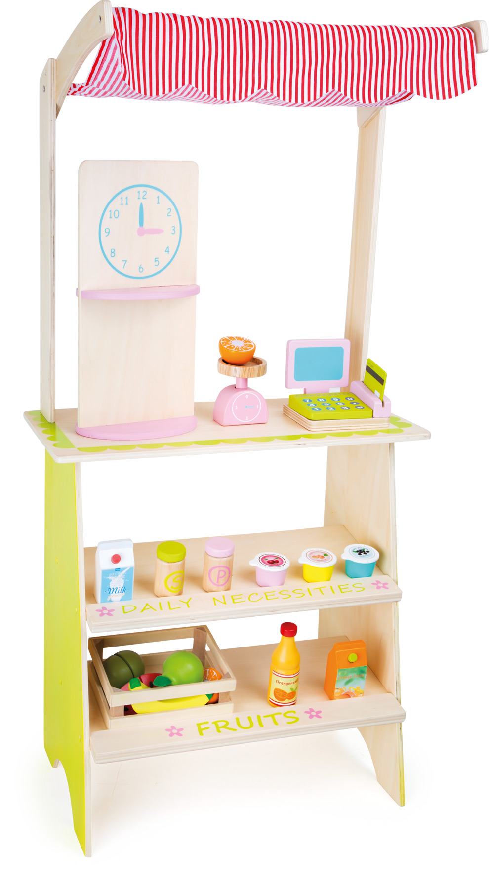 Eine Markise überdacht diesen tollen Verkaufsstand aus Holz. Zwei Auslagen präsentieren Obst und Lebensmittel. Der Marktverkäufer wiegt alles auf der Waage ab und lässt die Kunden sogar mit EC-Karte bezahlen. Ein tolles Rollenspiel, um den Umgang mit Geld zu lernen. Inkl. 18-teiligem Zubehör.