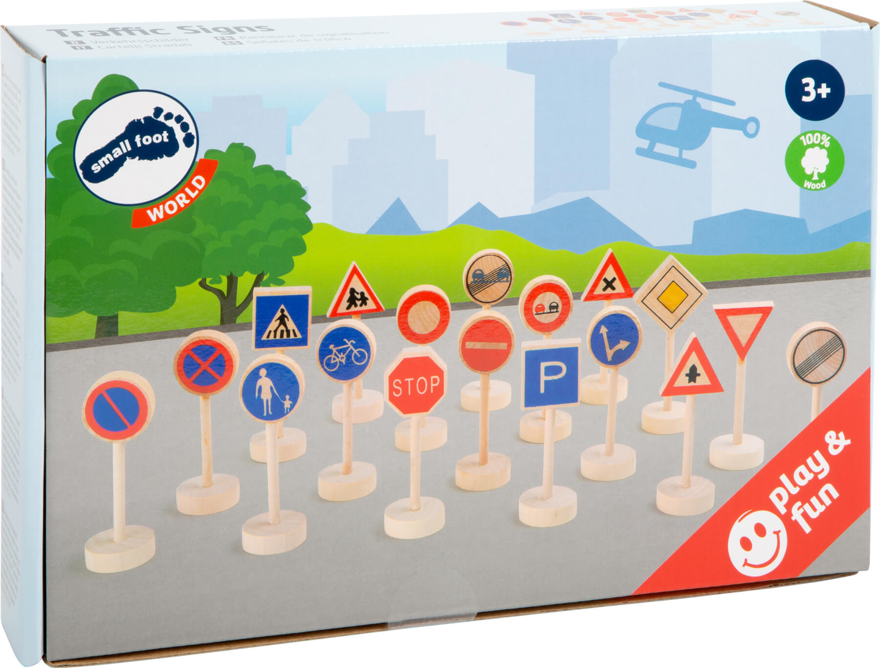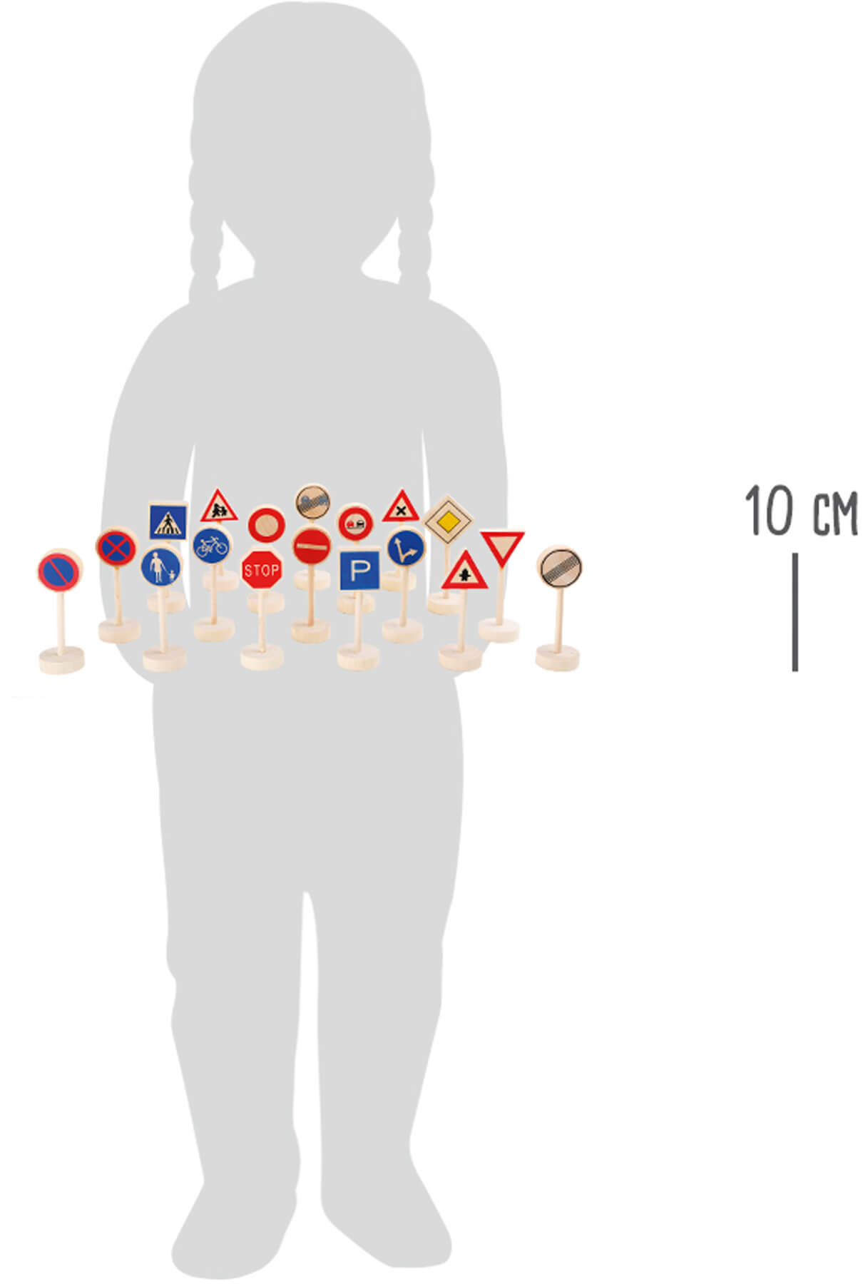 Viele bunte Verkehrsschilder, die Kindern spielerisch die Regeln im Verkehr näher bringen. Von Vorfahrtsschild bis Zebrastreifen und Stoppschild ist alles dabei. Auch in Kombination mit Spielzeugeisenbahnen oder Autos eignen sich die kleinen Schilder super als Ergänzungszubehör!