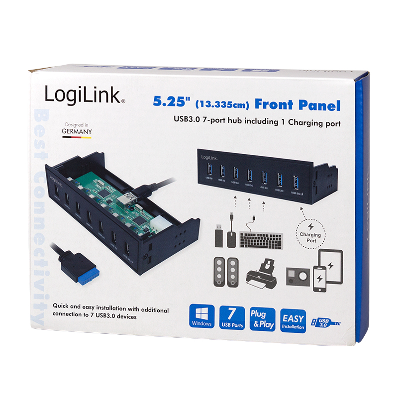 Produktinformationen "USB 3.0 Hub, 7-Port 5,25" intern, mit Schnellladeport" von LogiLinkDer USB 3.0 Hub UA0342 von LogiLink wird in den genormten 5,25" Schacht des Computers eingebaut und stellt 7x USB 3.0 Anschlüsse zur Verfügung. An diesen können ganz nach Belieben Endgeräte wie Drucker, Scanner, externe Festplatten oder Kartenleser betrieben werden. Das Gerät unterstützt Plug and Play und benötigt keine Treiber. Dank des USB 3.0 Standards können Sie Übertragungsraten von bis zu 5 GBit/s nutzen. Der 7te USB-Port ist zudem ein Schnellladeport, damit Sie Ihre Mobilgeräte wie Smartphone oder Tablet noch schneller laden können!