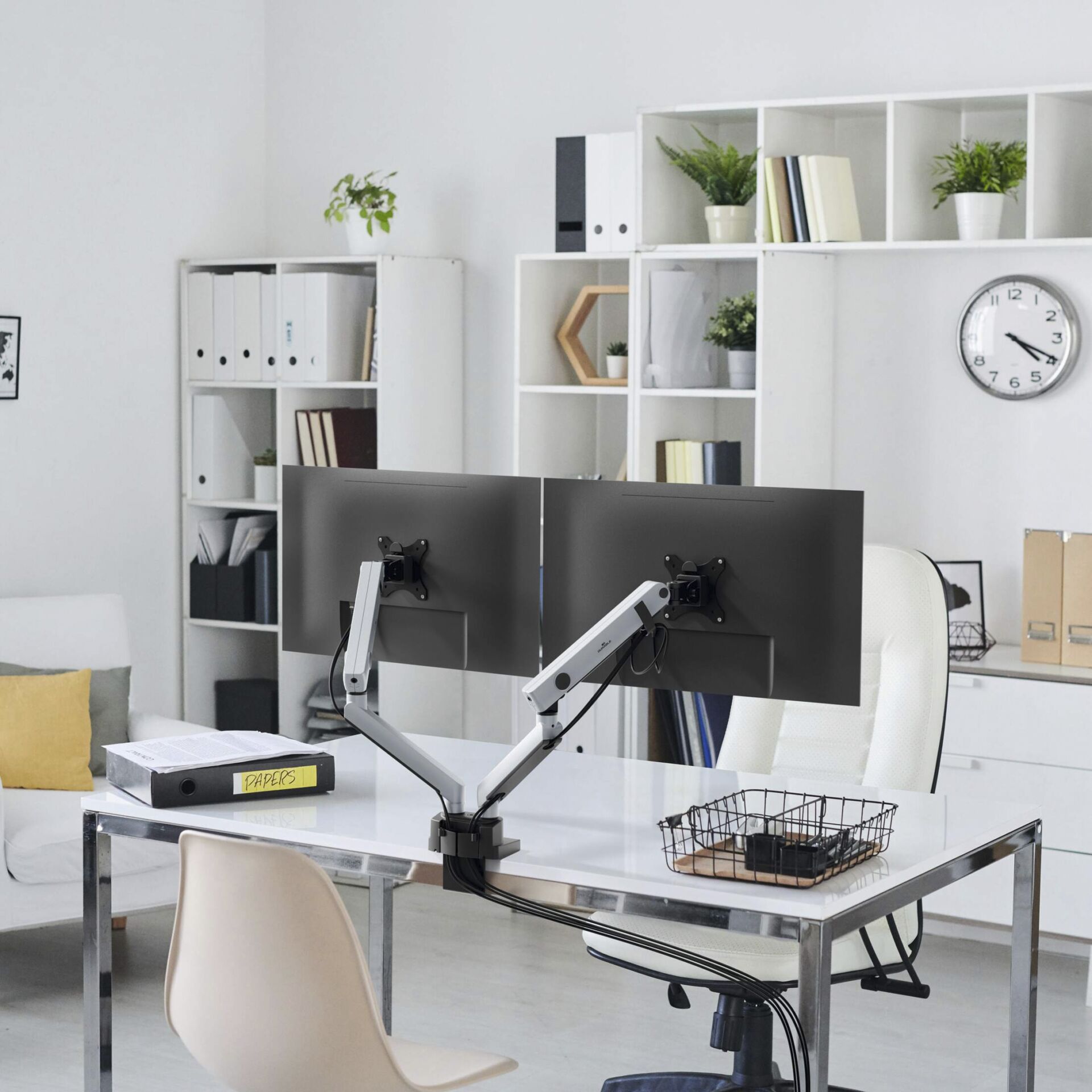 Monitor Halter mit flexiblem Arm für 2x Bildschirm inklusive individueller Befestigungsmöglichkeit mittels Tischdurchführung und Tischklemme.