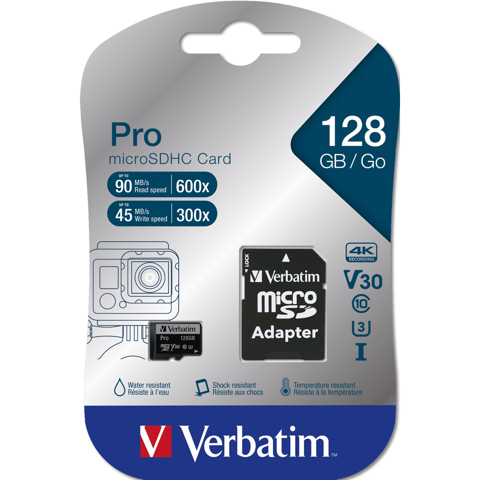 Verbatim Pro MicroSD-Speicherkarten sind wasser- und stoßfest; ein MicroSD-zu-SD-Adapter ist im Lieferumfang enthalten.