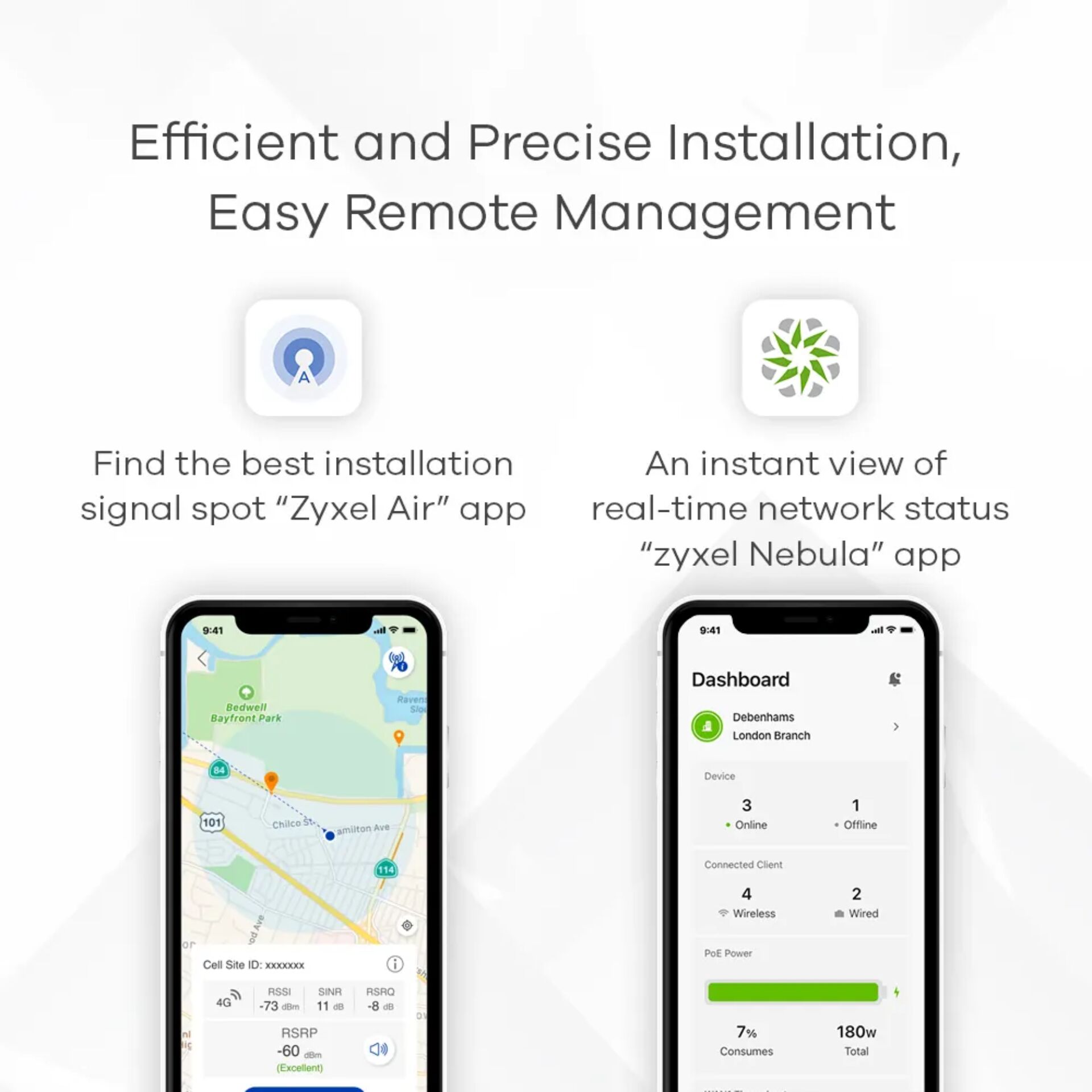 Der Nebula FWA510 ist mit wichtigen Sicherheitsfunktionen ausgestattet, um das Risiko von Datendiebstahl und Sabotage zu minimieren. Die Zyxel Air-App erleichtert die Einrichtung und Verwaltung des Geräts. Das robuste und elegante Design mit glatter, gummierte Oberfläche sowie intuitiven LED-Anzeigen macht ihn zu einem Plug-and-Play-Gerät.
