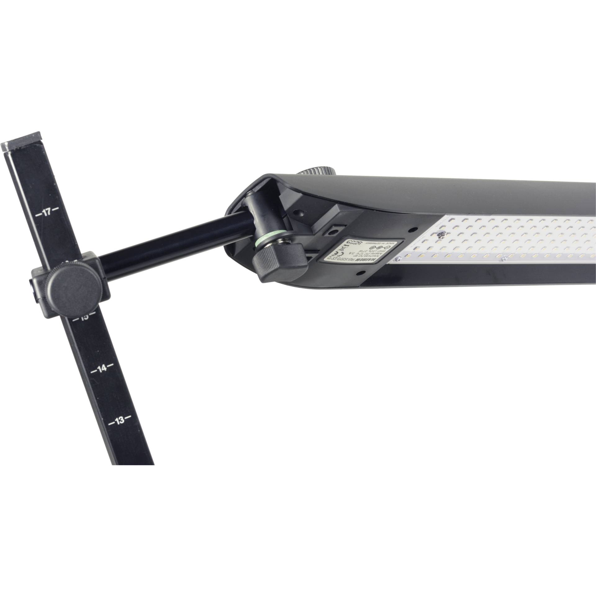 Leuchten dreh-, schwenk- und höhenverstellbar. Vertikale Haltearme neigbar in Rastgelenken. Befestigung mit stabilen Druckguss-Klemmsockeln, Spannweite bis 48 mm.