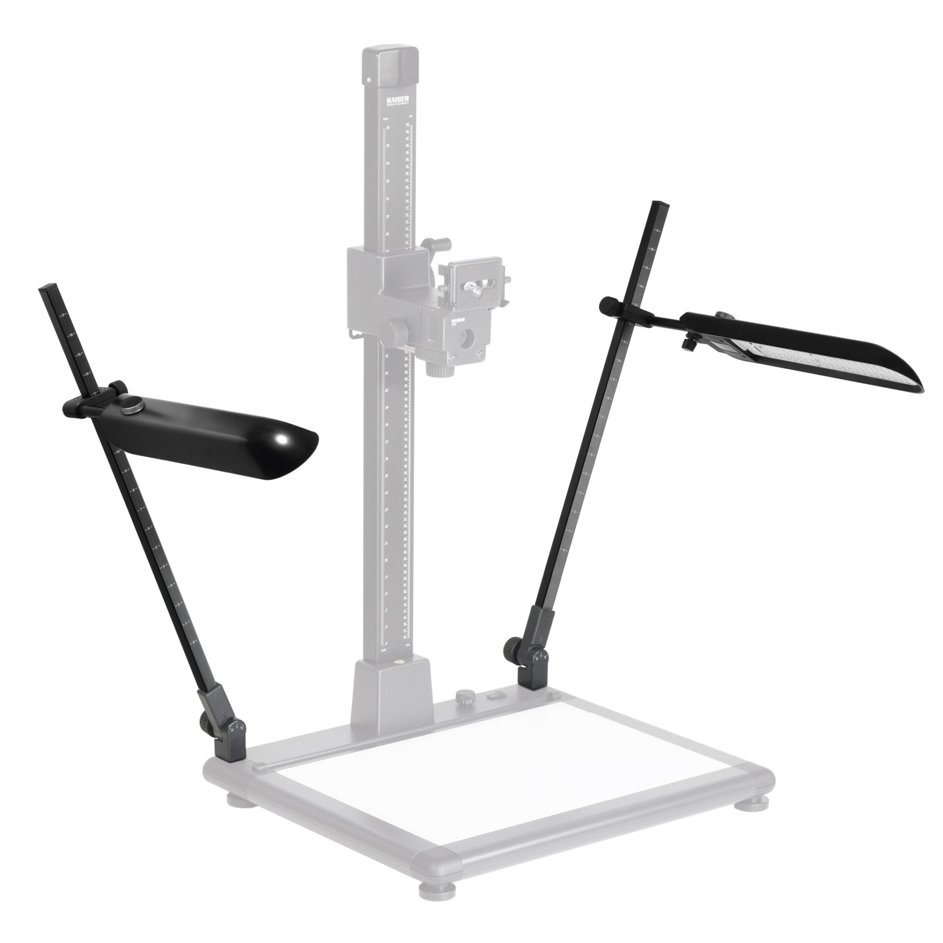 - Leuchten dreh-, schwenk- und höhenverstellbar. Vertikale Haltearme mit Höhenmarkierungen, schwenkbar in Rastgelenken. Befestigung über Gelenksockel an Copylizer/Leuchtgrundplatte. Inklusive Netzteil.
