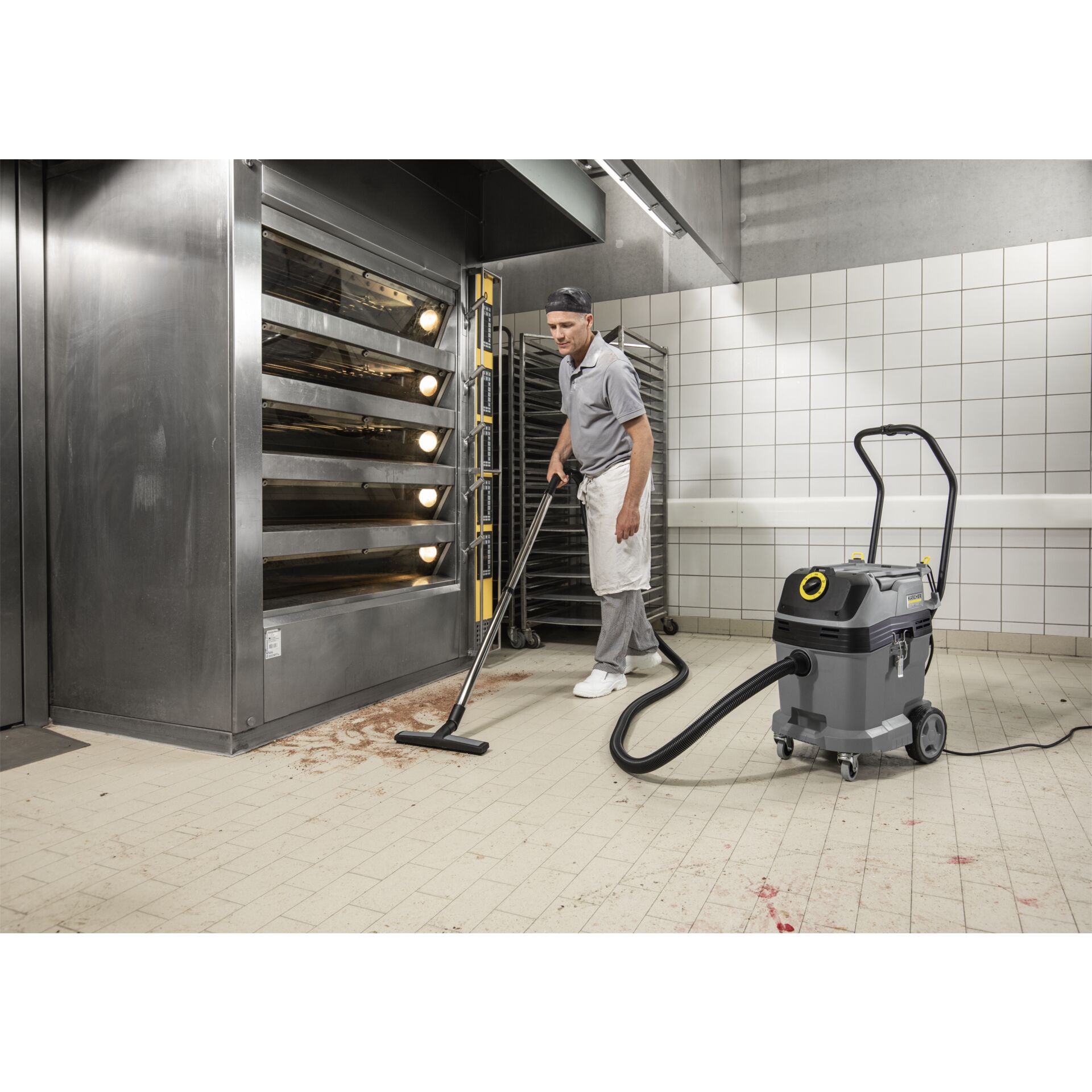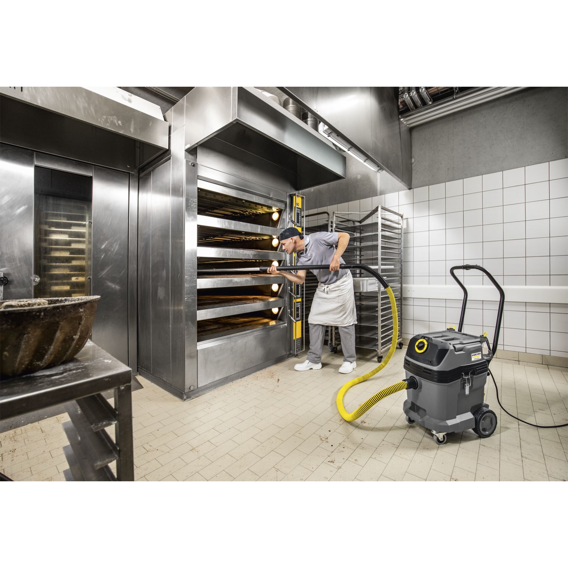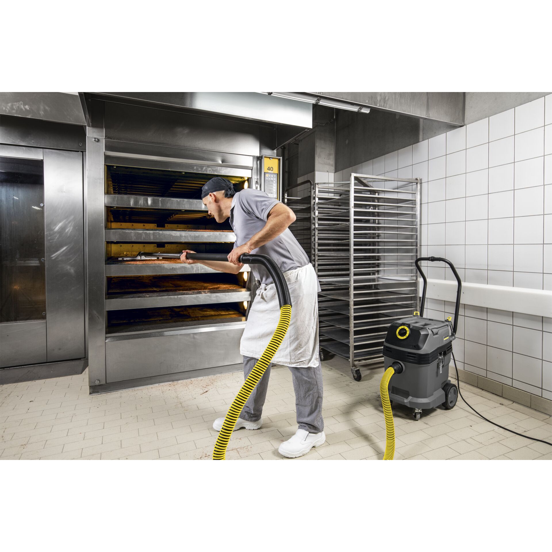Dank des Bäckersaugers NT 40/1 Tact Bs können Bäcker und Konditoren aufatmen. Ob Fußböden, Maschinen oder sonstige Geräte - und mit optional erhältlichem Zubehör sogar der Backofen: Der Sauger meistert mühelos alle Herausforderungen, die ihn in der Backstube erwarten. Durch seine stabilen Verschlusslaschen aus Metall ist er auch zum Saugen potenziell gefährlicher Mehlstäube geeignet. Die automatische Filterabreinigung Tact sorgt dabei nicht nur für eine konstant hohe Saugleistung, sondern ermöglicht auch das Saugen von großen Mengen feiner Stäube. Dazu ist der Sauger mit dem mittig angeordneten Drehschalter kinderleicht zu bedienen, hält durch den robusten Behälter auch härtere Einsätze schadlos aus und ist dank des serienmäßigen, ergonomischen Schubbügels besonders einfach zu transportieren.