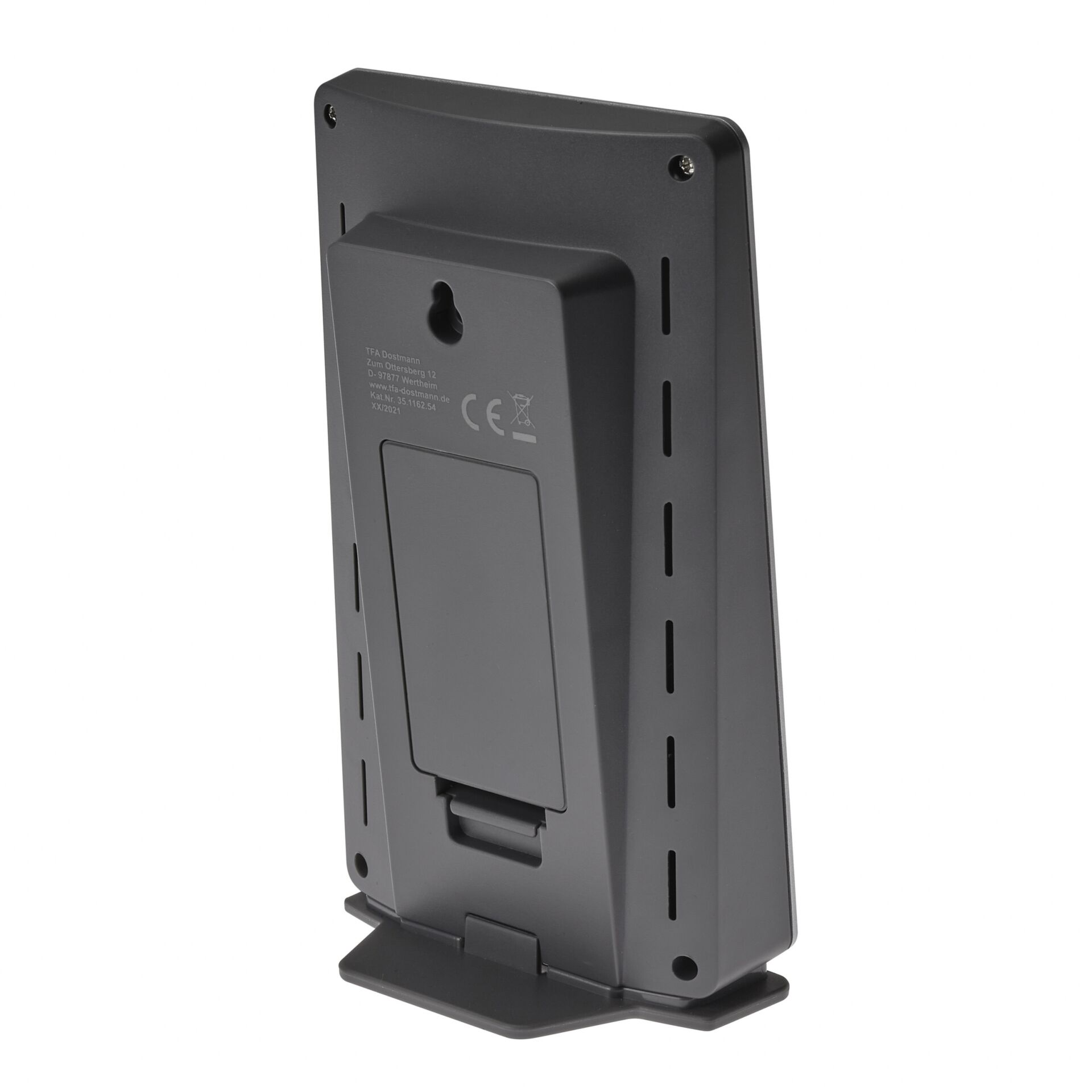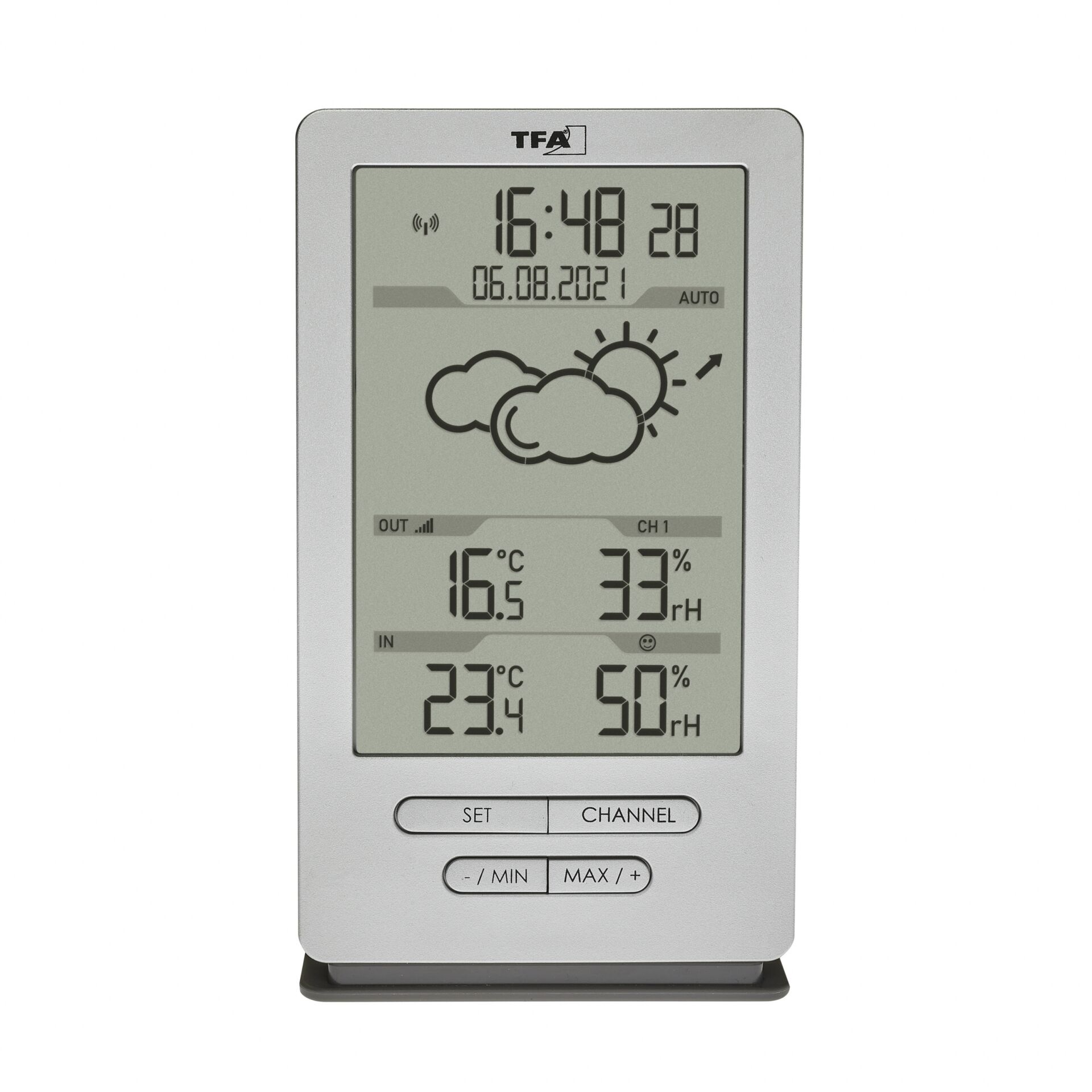 Außentemperatur und Luftfeuchtigkeit werden über einen mitgelieferten Funksender ermittelt, der im Freien an einem geschützten Ort aufgestellt wird. Zwei weitere Sender (optional, nicht Teil des Lieferumfangs) zur Temperatur- und Luftfeuchtigkeitskontrolle, z.B. im Kinderzimmer oder in der Garage, sind anschließbar.