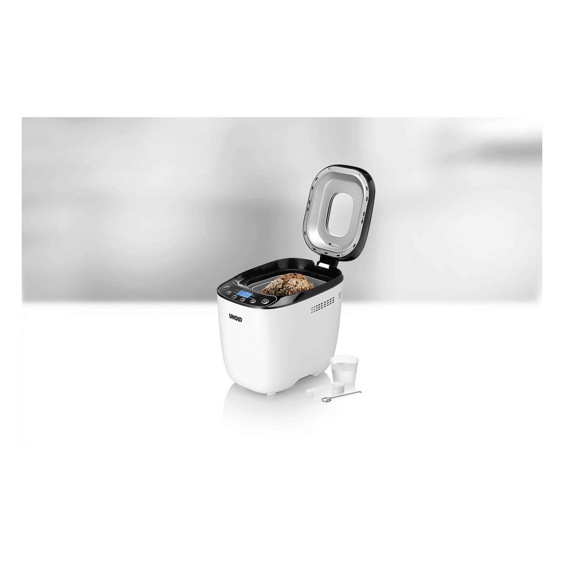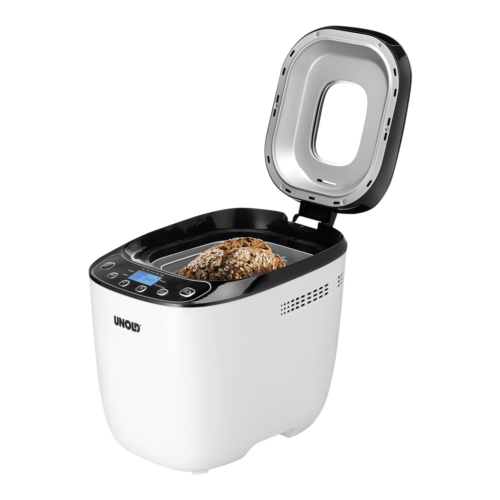Der BACKMEISTER Design von UNOLD bringt frischen Duft nach Brot in die Küche. Mit seinem modernen Cool-Touch-Gehäuse in der Farbe Weiß passt er in jeden Haushalt. Über das benutzerfreundliche LCD-Display mit Soft-Touch-Bedienelementen kann man unter den 12 Programmen, davon eins für Marmelade und eins für glutenfreies Brot, die passende Brotsorte auswählen. Funktionen wie eine Zeitwahltaste, die Warmhaltefunktion sowie der Bräunungsgrad setzen keine Grenzen für das individuelle Brot. Wer es nicht abwarten kann, darf seinem Brot durch das große Sichtfenster beim Backen zusehen.