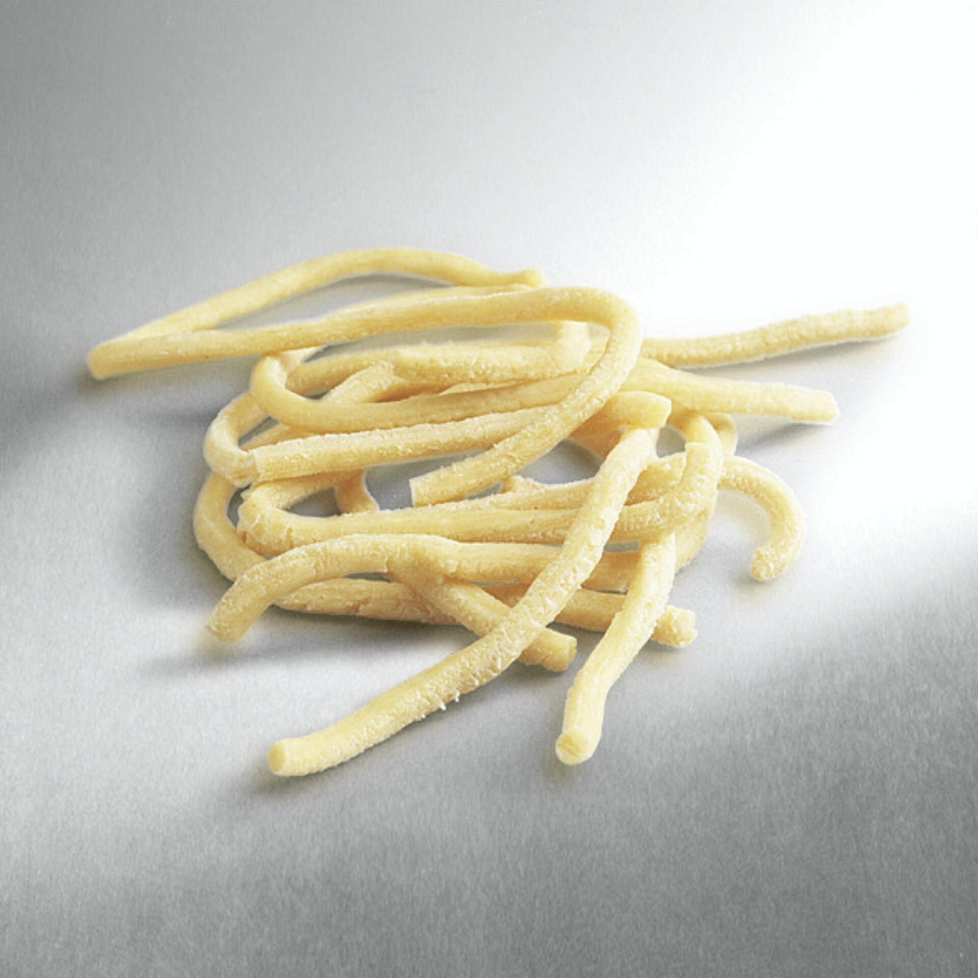 Mit dem Einsatz aus Bronze ist bei der Pasta-Herstellung außerdem ein höherer Druck notwendig. Dadurch wird die Struktur der einzelnen Nudeln dichter, was hilfreich ist die Pasta später beim Kochen möglichst al dente - also bissfest - zuzubereiten.