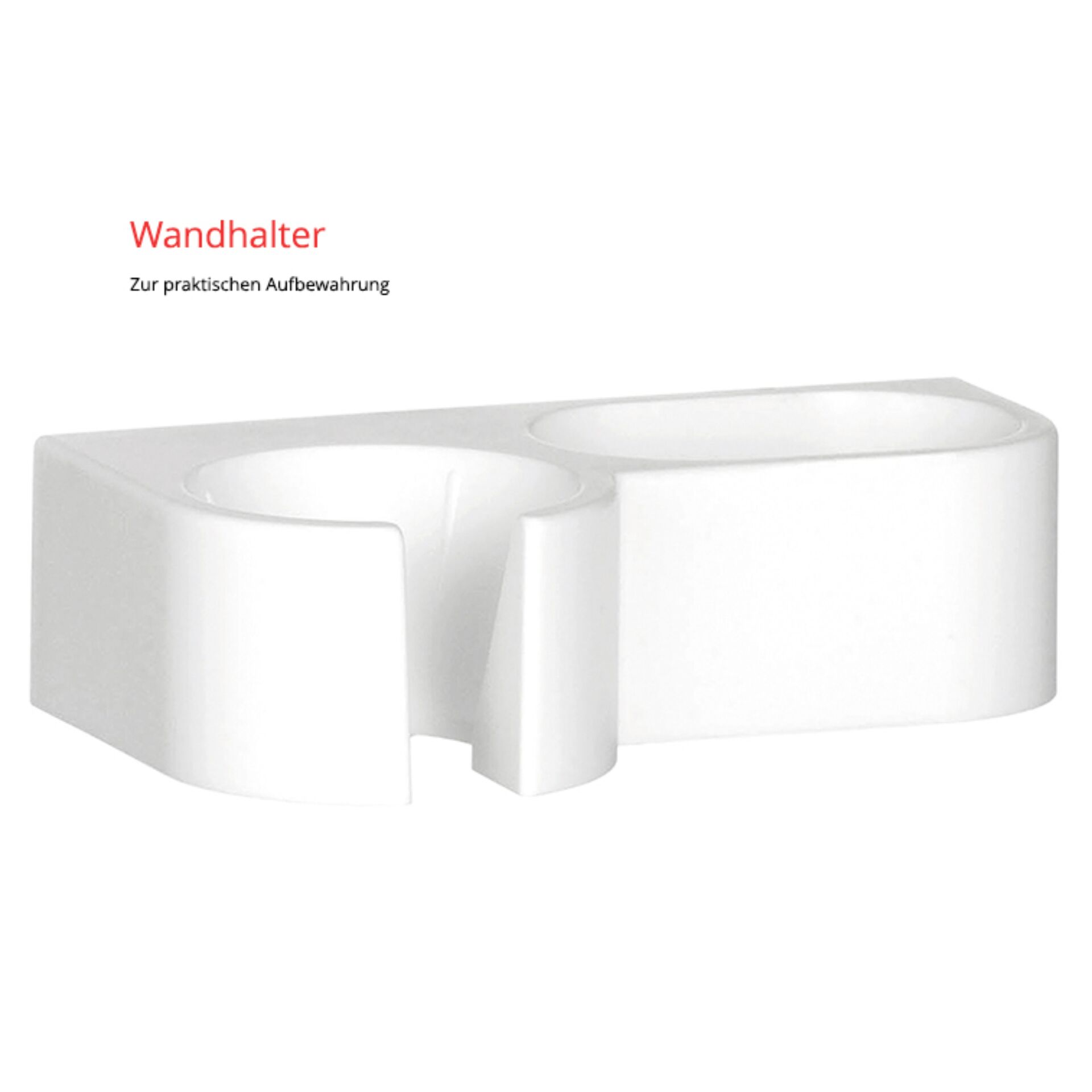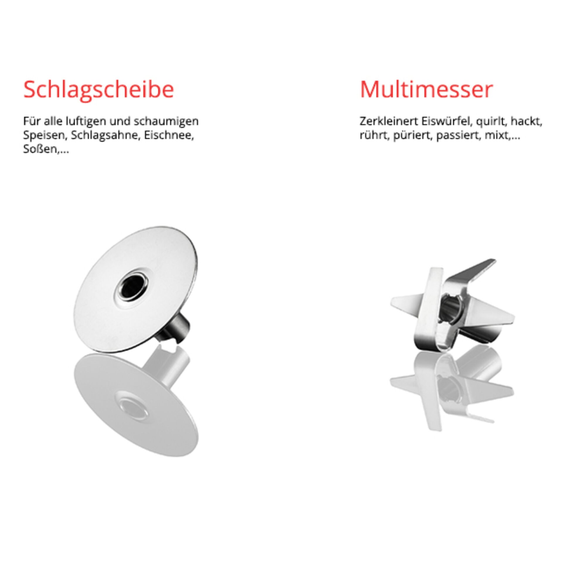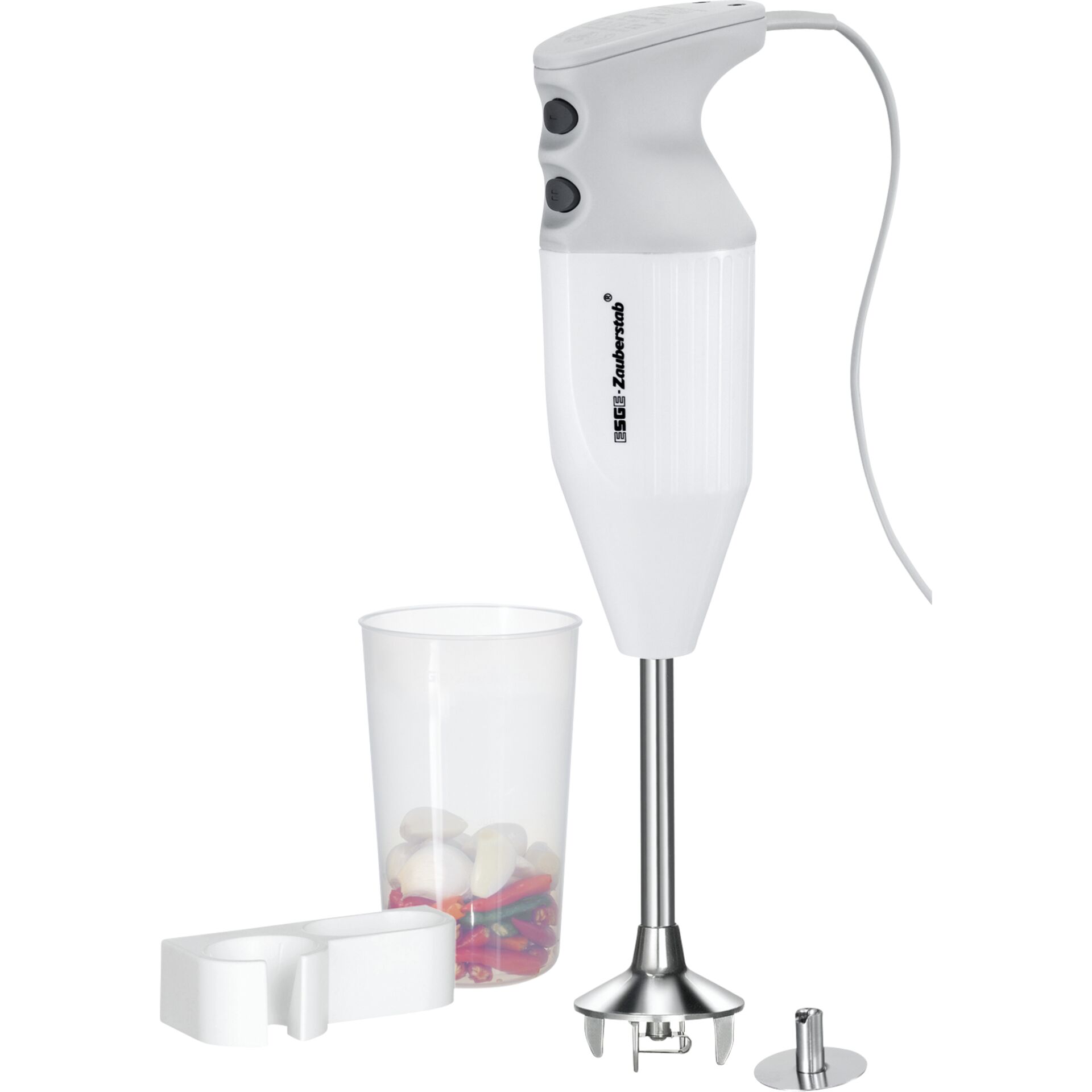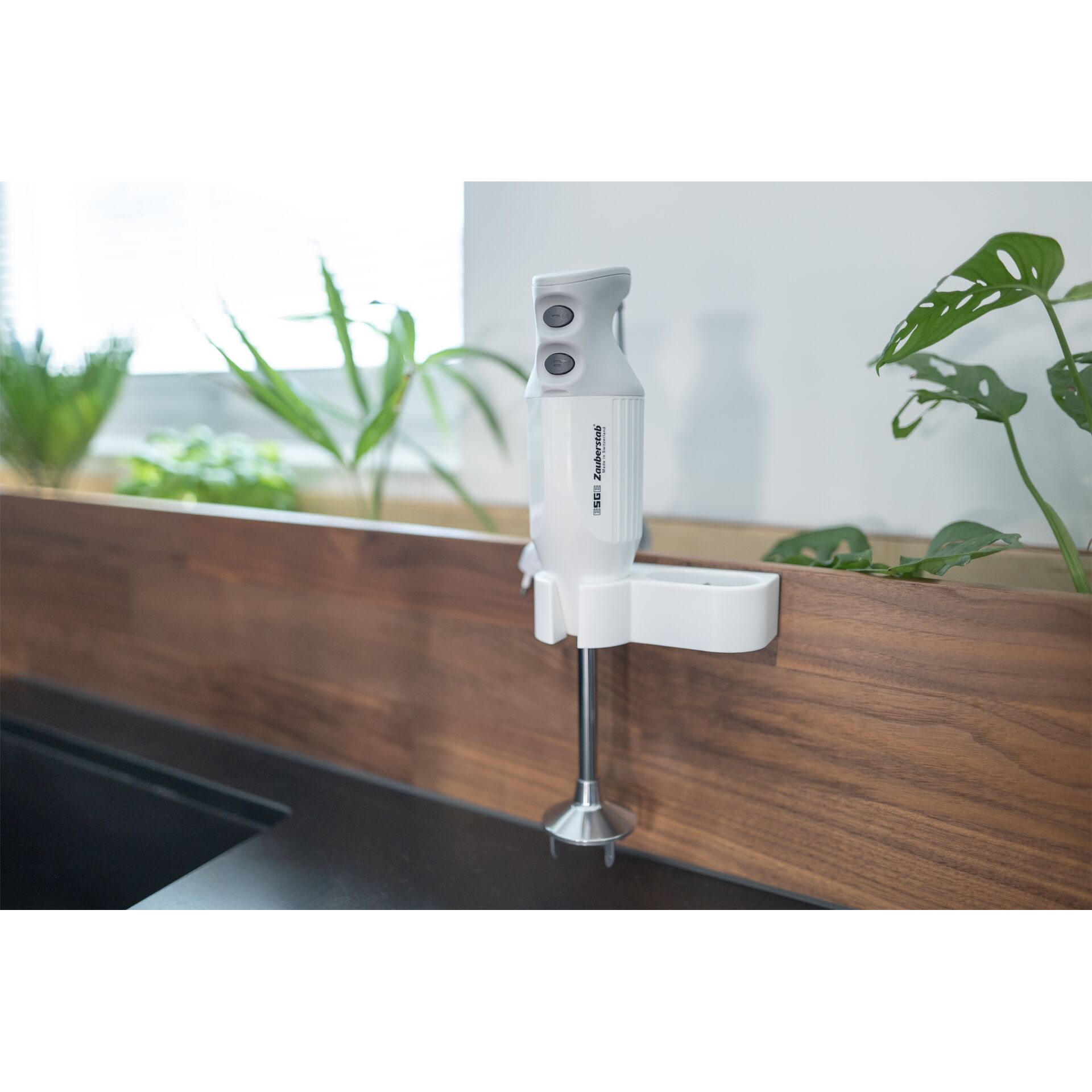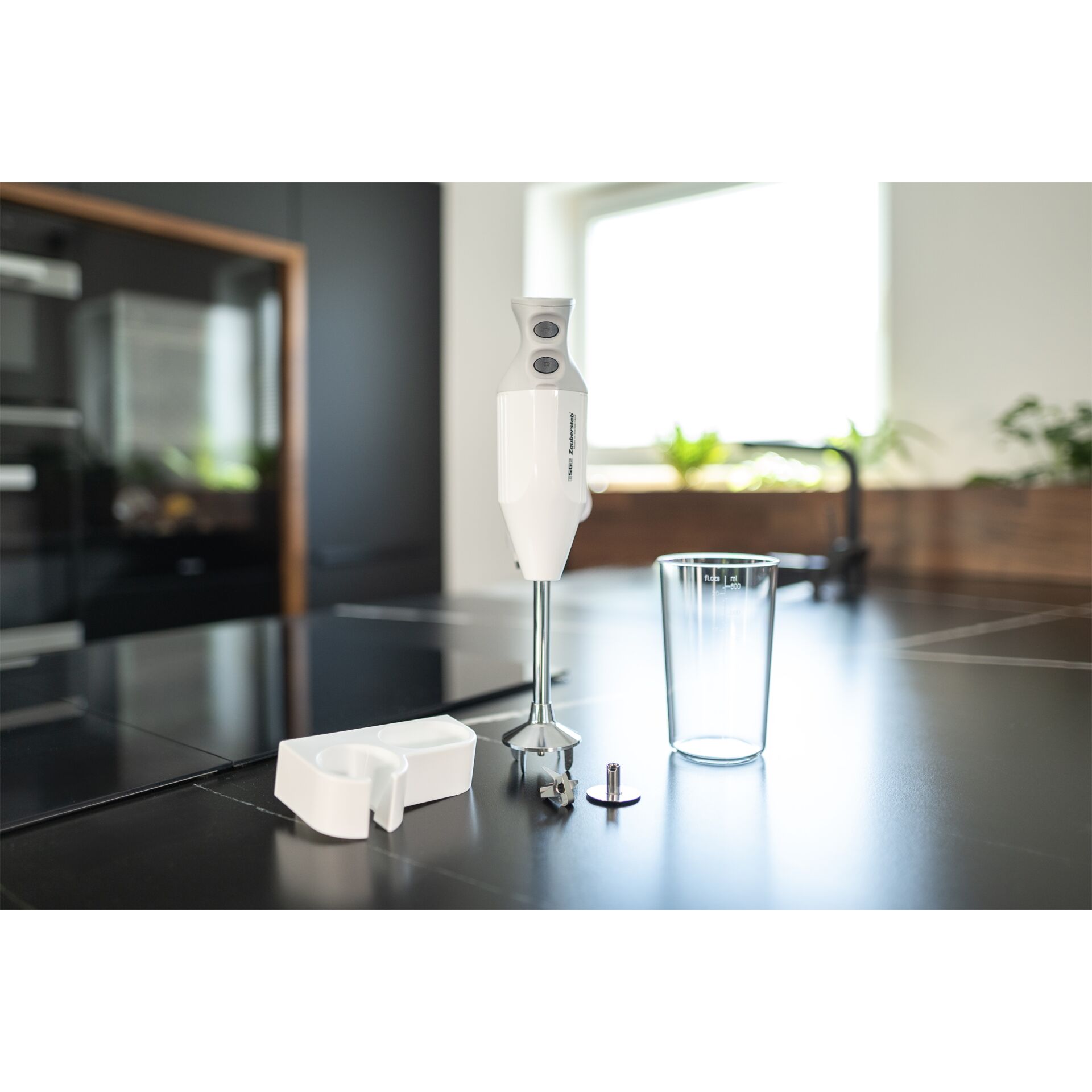 Von A wie aufschäumen bis Z wie zerkleinern ist der ESGE-Zauberstab® M 122 S der nimmermüde Küchenhelfer. In die Küche zieht er mitsamt der praktischen Wandhalterung ein und hat neben dem Multimesser fürs Hacken, Zerkleinern und Pürieren auch die Schlagscheibe im Gepäck, mit der Sahne oder Eischnee steif geschlagen oder auch Milch aufgeschäumt werden kann. Weiteres Gepäckstück des Kraftpakets mit zwei Tempo-Stufen (10.000 oder 14.000 Umdrehungen pro Minute) ist der praktische 600 ml-Messbecher. Durch die praktische Aufsteckzentrierung lassen sich Multimesser und Schlagscheibe ganz easy aufstecken und dann legt der leistungsfähige AC-Motor "Made in Switzerland" im ergonomisch gestalteten Griffelement auch gleich los. Nach dem Einsatz den Stab und das Aufsteckteil einfach unter heißem Wasser reinigen, dann ist der ESGE-Zauberstab® M 122 S wieder einsatzbereit für die nächste kulinarische Herausforderung! Durch das circa 160 cm lange Kabel sorgt der ESGE-Zauberstab® M 122 S für Bewegungsfreiheit in der Küche!