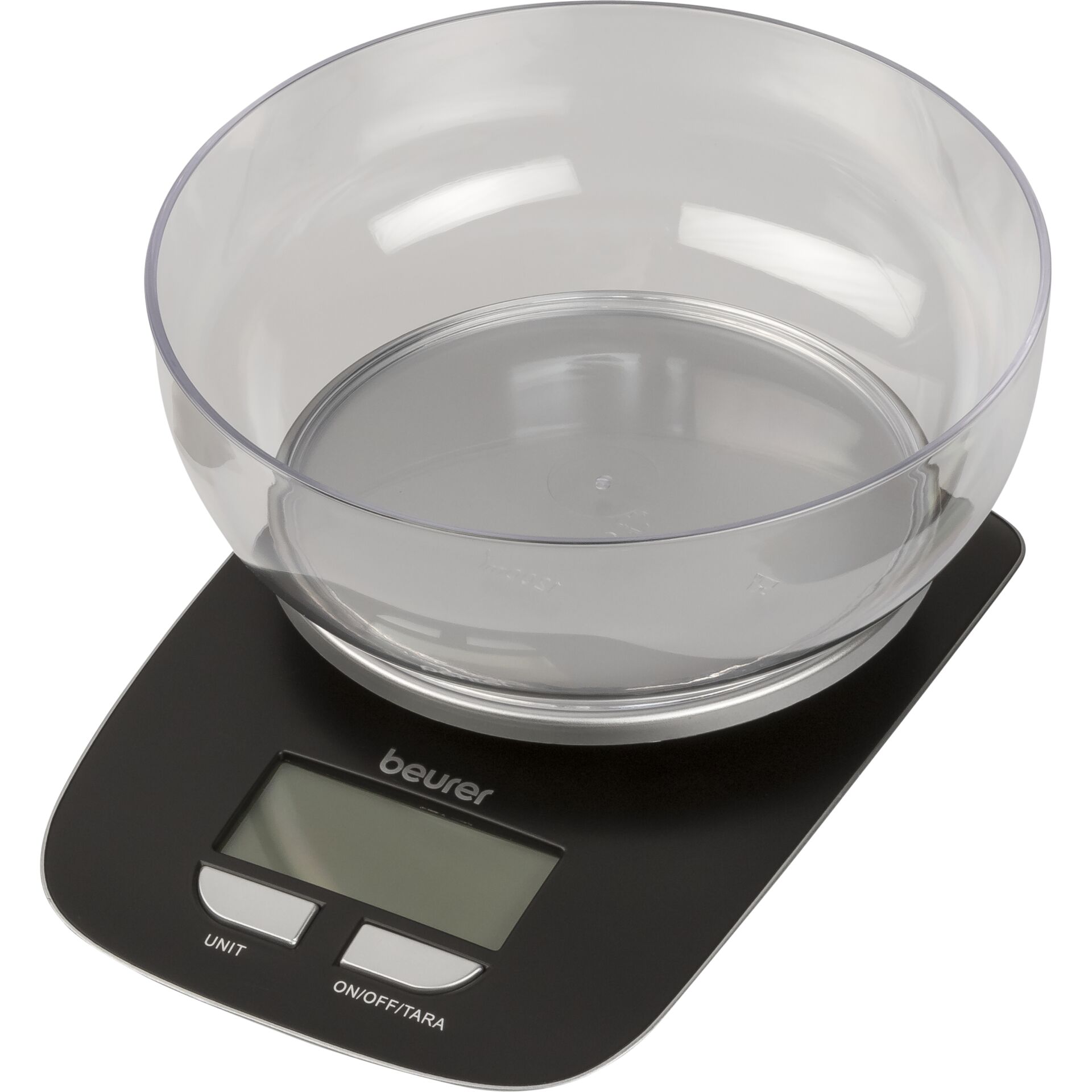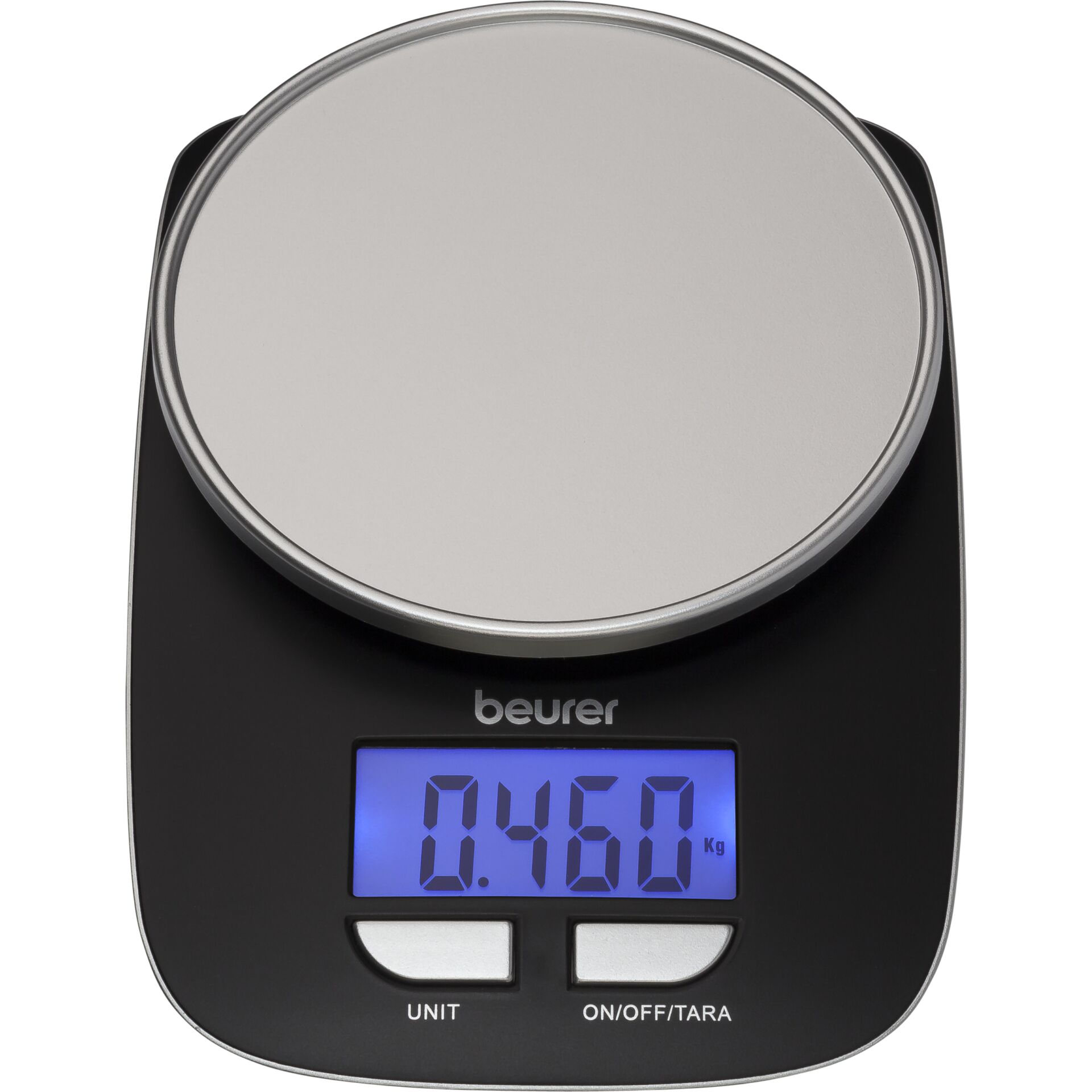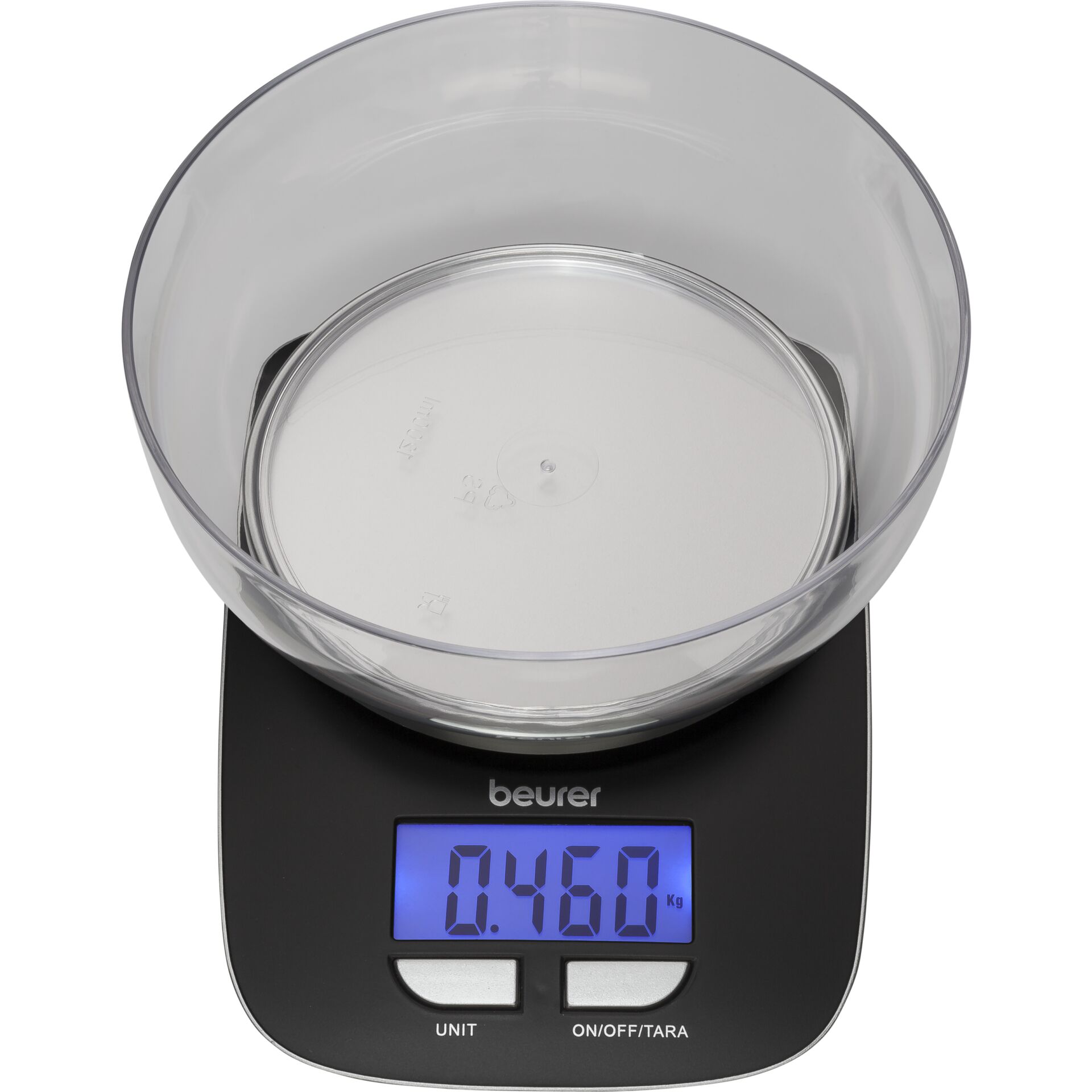 Formschöne Beurer Küchenwaage KS25 mit Wiegeschüssel aus Glas und blau beleuchtetem Display.