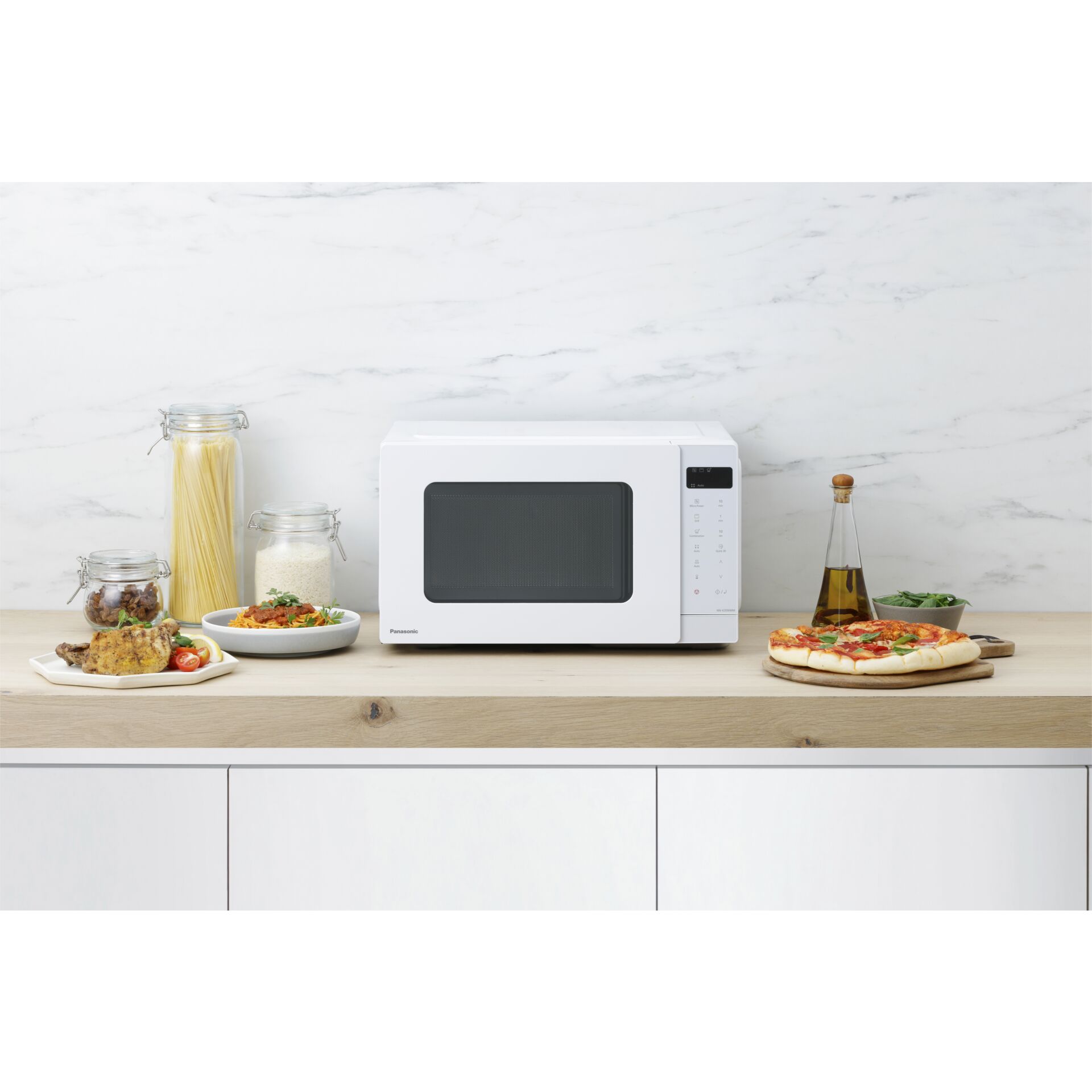 Der Panasonic NN-K35 Grill-Mikrowellenofen fügt sich dank seines minimalistischen, modernen Designs nahtlos in jede Kücheneinrichtung ein. Vom klaren weißen LED-Display über die kompakte Größe bis hin zur matten Türoberfläche und dem glatten Touchpanel - mit dieser Mikrowelle können Sie jeden Tag das Kochen genießen.