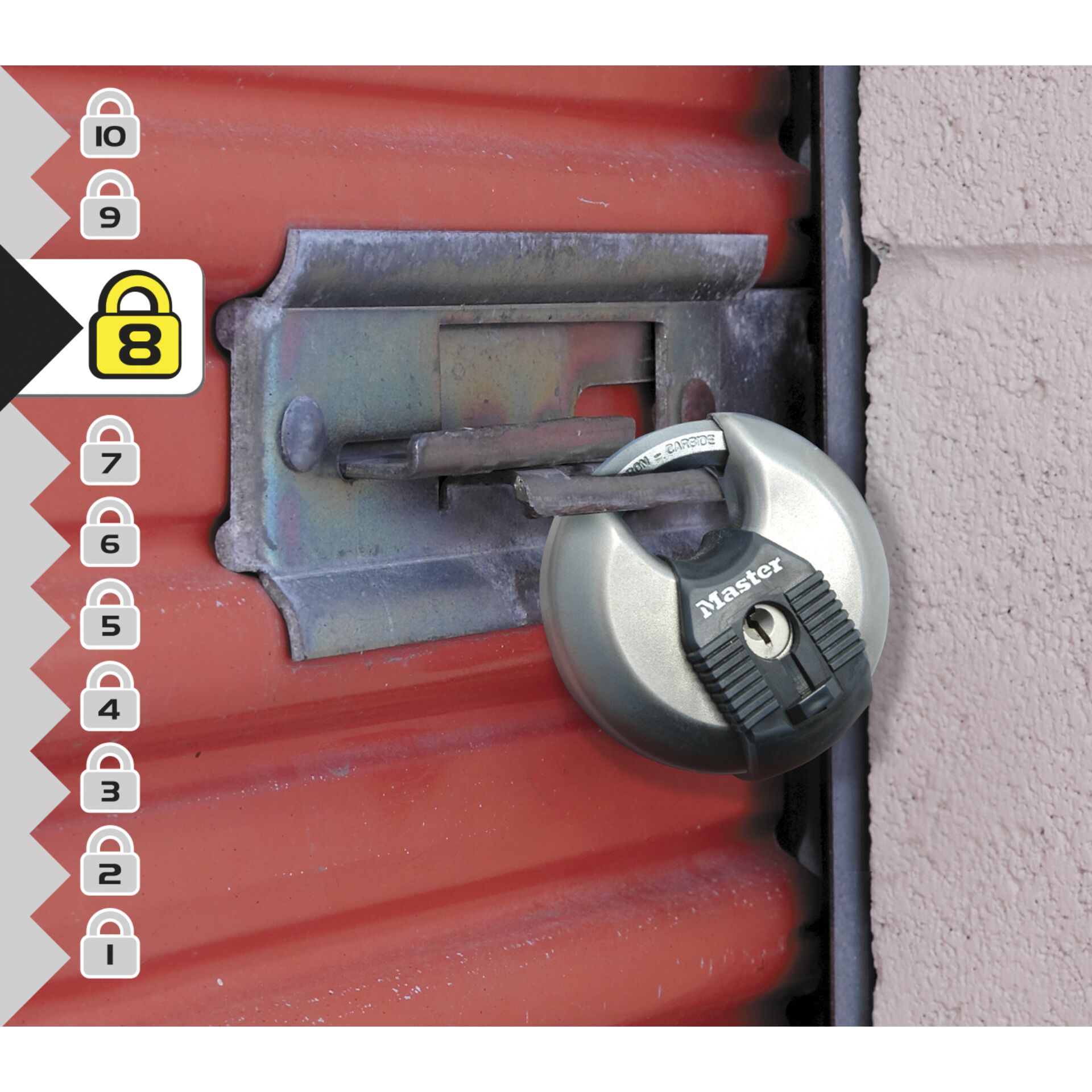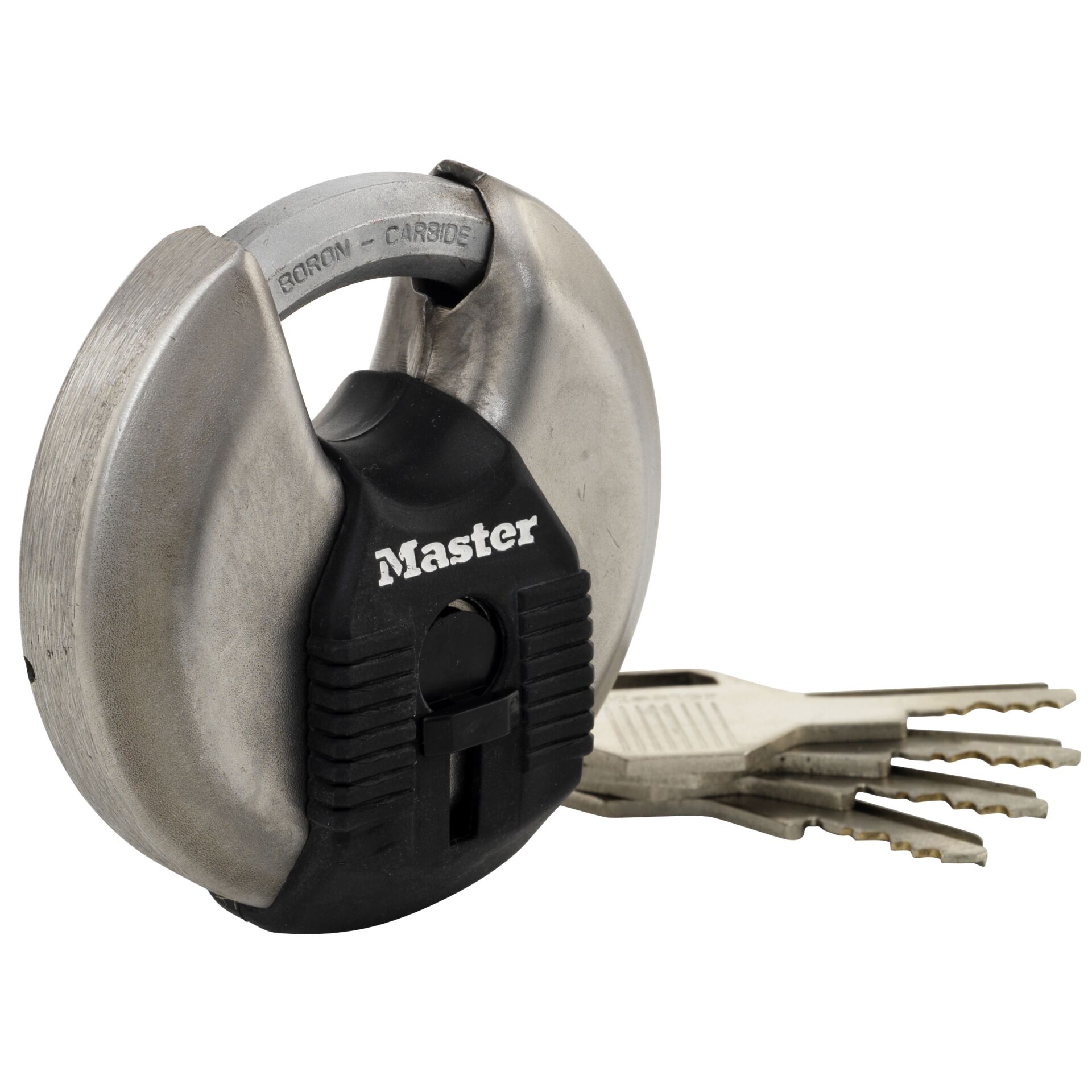 Das Master Lock Disc Schloss M40EURD mit 70 mm breitem Edelstahlgehäuse ist besonders massiv, zuverlässig und korrosionsbeständig. Das verdeckte Design minimiert die Sichtbarkeit des Bügels und schützt vor Aufbruchsversuchen mit dem Bolzenschneider. Der achteckige Bügel mit einem Durchmesser von 10 mm ist 16 mm lang und aus Tough-Cut Borcarbid gefertigt, das 50 % härter als gehärteter Stahl ist und maximalen Widerstand gegen Schneiden und Sägen bietet. Der Schließzylinder mit 4 Stiften verhindert das Aufknacken des Schlosses, während die beiden Kugellagerverriegelungen davor schützen, dass das Schloss aufgebrochen oder zerschlagen wird. Die Schlüsselkanalabdeckung bietet besten Witterungsschutz und die verstärkte Stoßschutzleiste schützt vor Kratzern.
