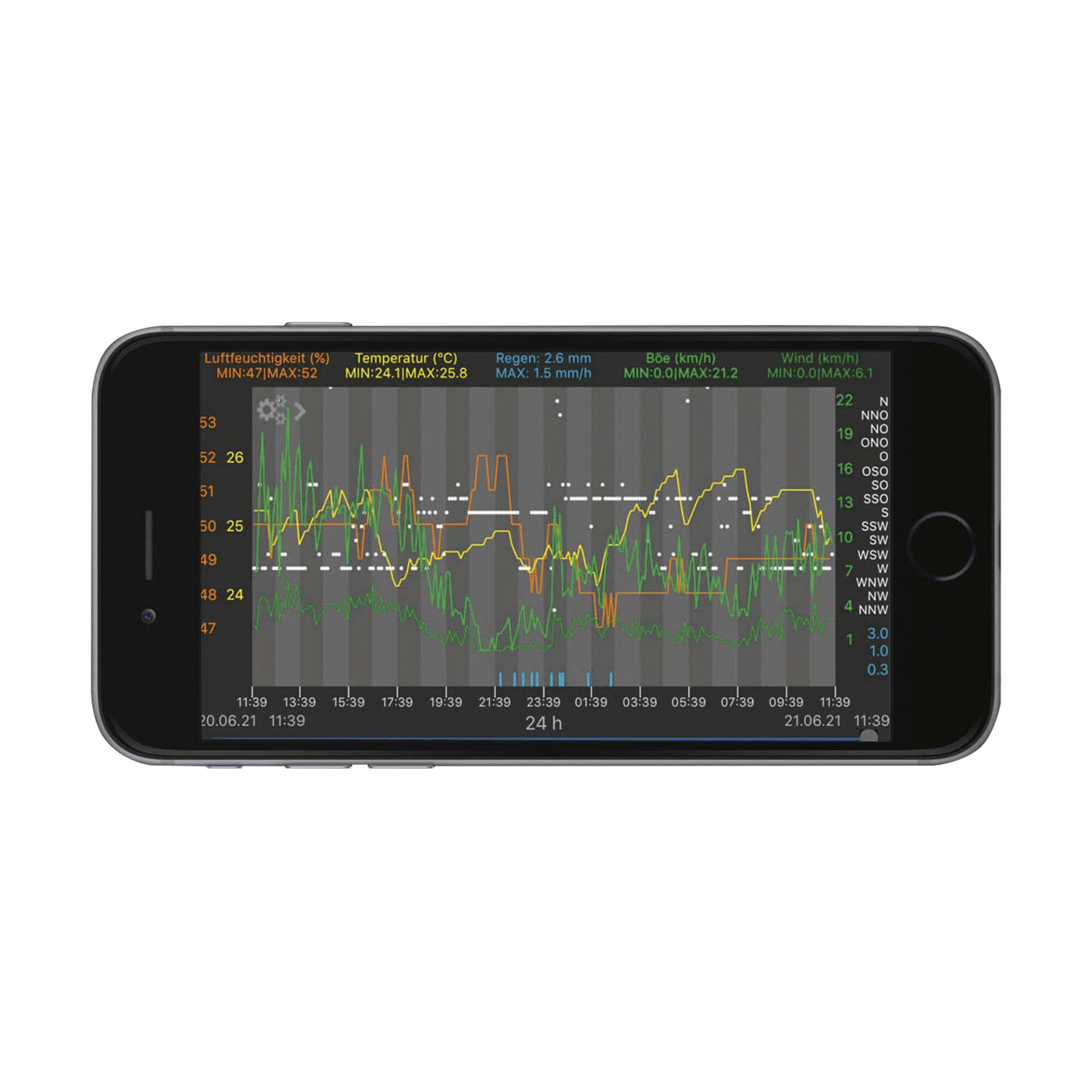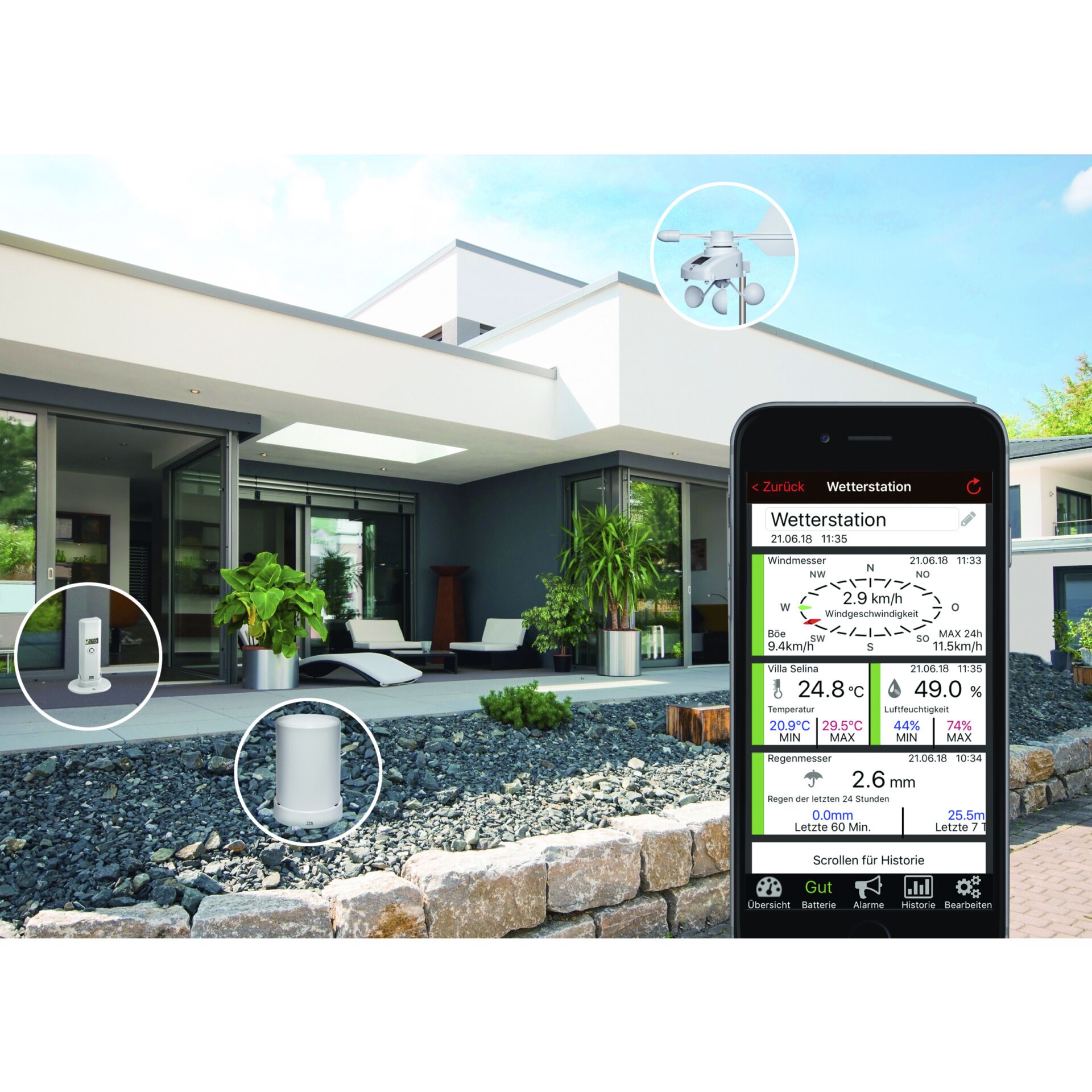 Mit der WEATHERHUB App lassen sich die aktuellen Messwerte Ihrer Sender abrufen, mit Vergangenheitswerten von bis zu 90 Tagen. Zudem können Sie Alarmgrenzen festlegen und werden im Alarmfall per Push-Benachrichtigung informiert. Die Sensoren der Wetterstation unterstützen die PRO+ Funktion von WEATHERHUB. Somit haben Sie Zugriff auf zusätzliche Features wie Grafiken, Max.-Min.-Funktion und Daten-Export. Das Set kann mit bis zu 50 weiteren Sendern und koppelbaren Geräten ergänzt werden.