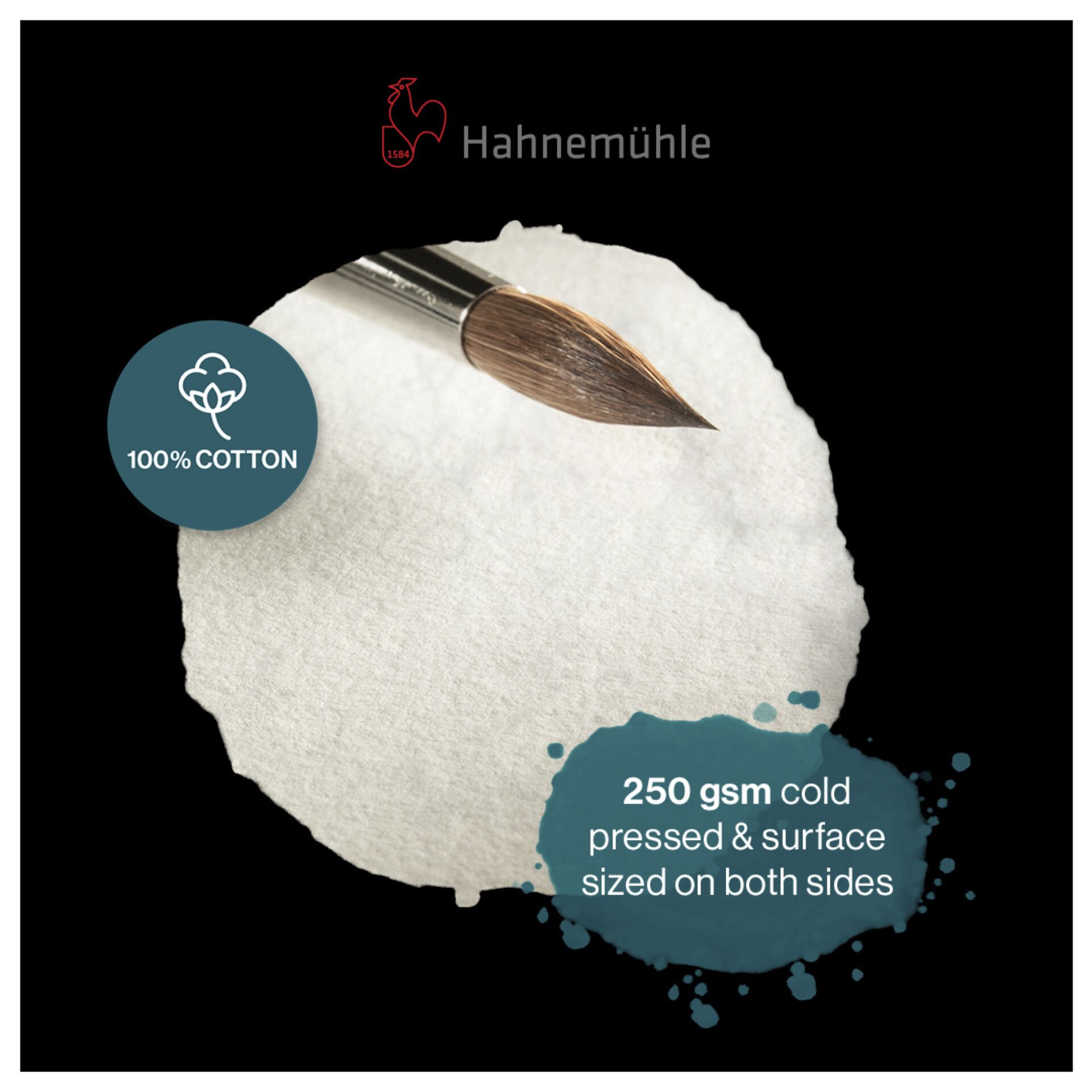 Das Hahnemühle Watercolour Book aus 100 % Baumwollfasern ist ein Must-have für Aquarellkünstler. Die Baumwolle verleiht dem Papier einen natürlichen Weißton, eine unvergleichliche Textur und eine hohe Widerstandsfähigkeit. Farben fließen hervorragend auf dem naturweißen Papier und beflügeln Pinsel und Künstler. Die 30 Blatt des 250 g/m² Papiers haben auf der Vorder- und Rückseite eine homogene, feinkörnige Oberflächenstruktur, so stehen Künstlern 60 Seiten zum kreativen Gestalten zur Verfügung. Das Buch ist für alle Aquarelltechniken geeignet, insbesondere für die Nass-in-Nass-Technik. Maskierstifte und Masking Tapes lassen sich ohne Rückstände entfernen. Selbst Radierungen sind dank Oberflächenleimung problemlos möglich. Der nachtschwarze, stabile Einband mit schwarzem Lesezeichen verleiht dem Buch eine Eleganz und die Stabilität, die es als unverzichtbarer Begleiter benötigt. Ein Gummiband verschließt das Buch fest.