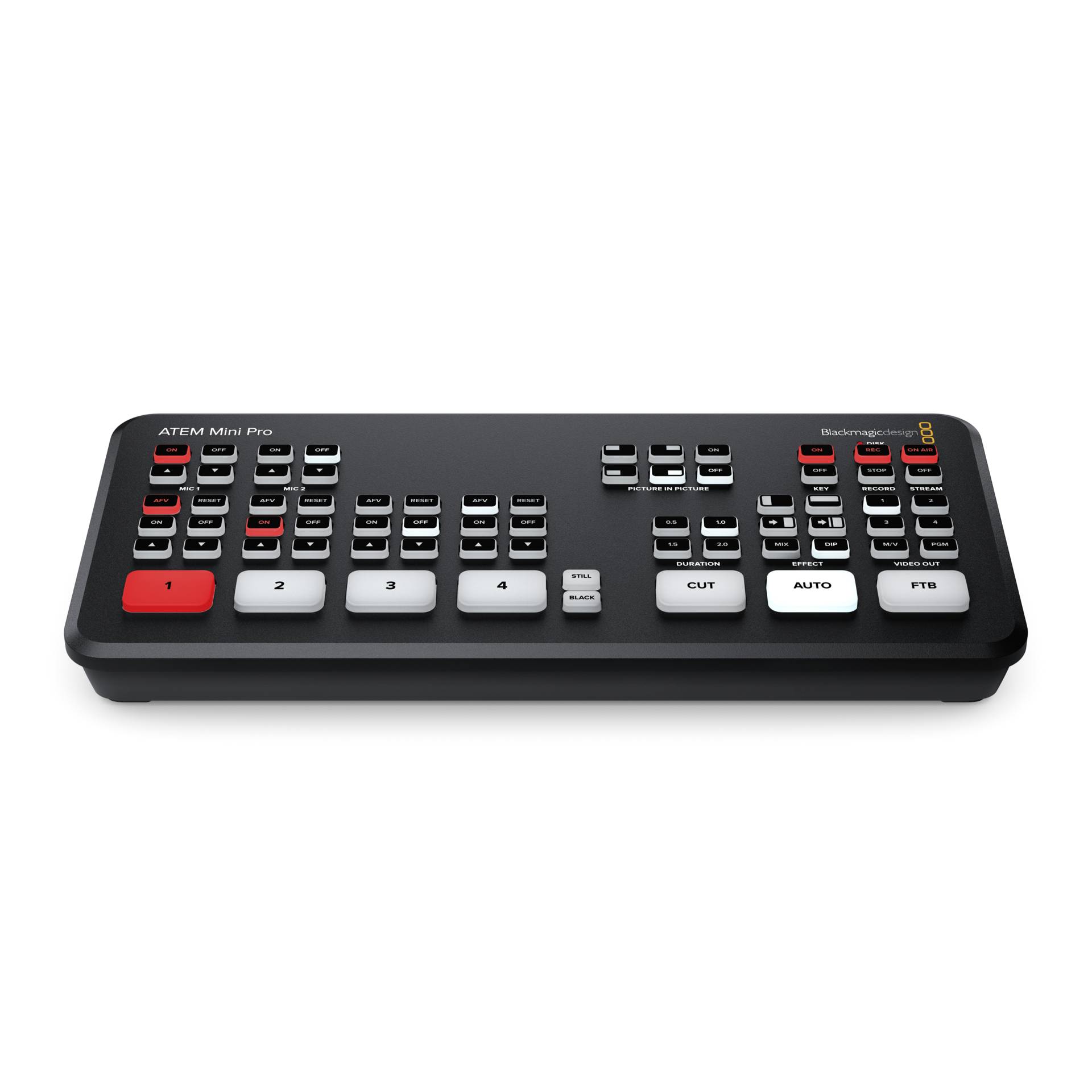 Der ATEM Mini Pro von Blackmagic Design ist fix eingerichtet und bedienfreundlich. Seine Features umfassen vier skalierbare HDMI-Eingänge, einen USB-Webcam-Ausgang, einen HDMI-Ausgang und einen Fairlight Audiomixer mit EQ und Dynamiktools, einen DVE-Prozessor für Bild-im-Bild-Darstellungen, Übergangseffekte, einen Greenscreen-Chromakeyer und einen 20 Standbilder fassenden Media Pool für Titel. Obendrein gibt es die ATEM Software Control kostenfrei dazu.