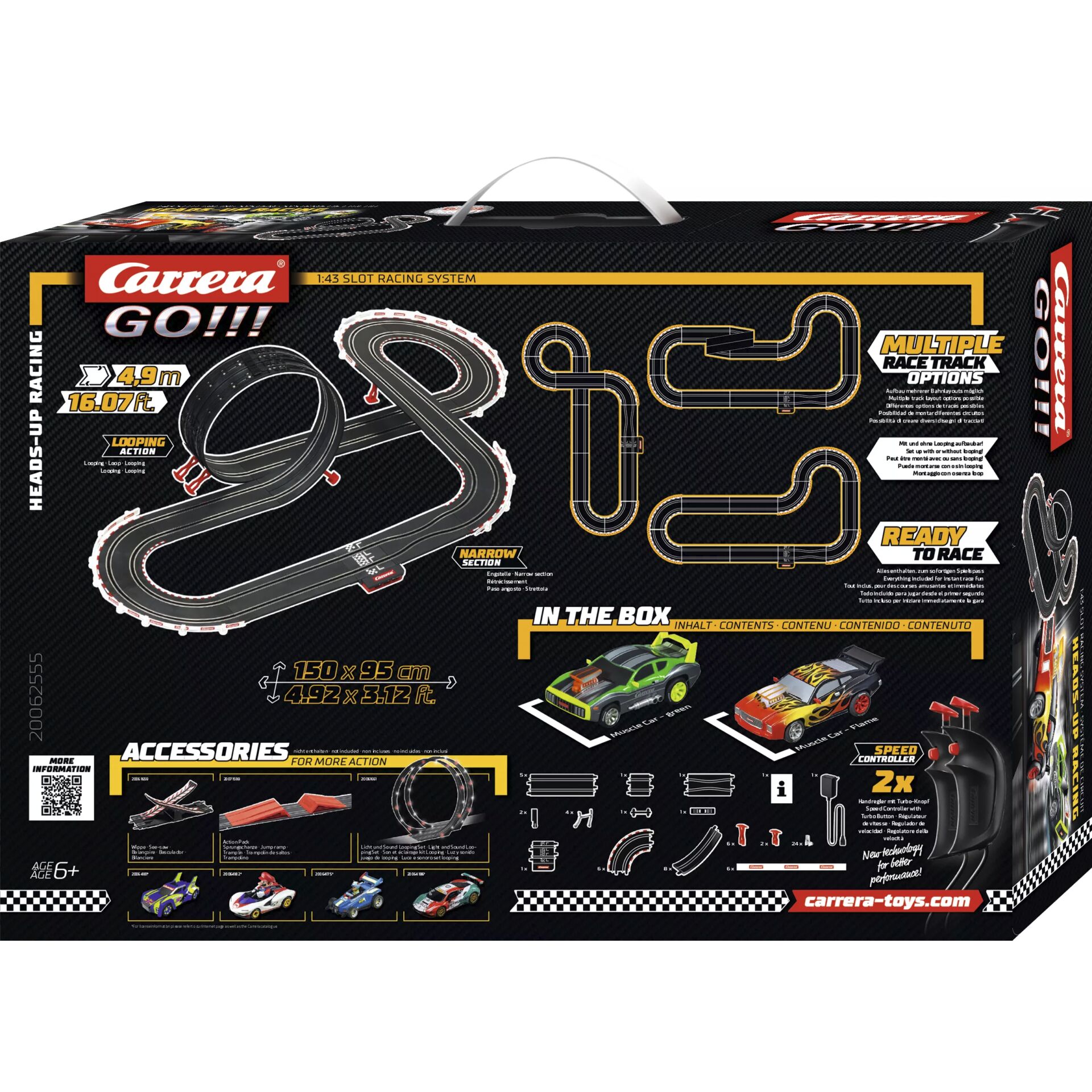 Im Carrera GO!!! Set "Heads-Up Racing" steckt purer Fahrspaß und Power. Das Muscle Car in leuchtendem Grün und sein Konkurrent im stylischen Flammendesign liefern sich auf der 4,9 Meter langen Rennstrecke ein packendes Duell - dank Lichteffekten sogar auch im Dunkeln!