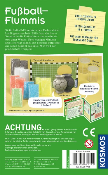 Inhalt: Spezialgranulat in 6 Farben (blau, gelb, rot, grün, weiß, schwarz), 2 Gussformen mit Fußballprägung (weiß, schwarz), 2 Versuchsbecher mit Deckel, Torwand Stanzteil, farbig illustrierte Anleitung