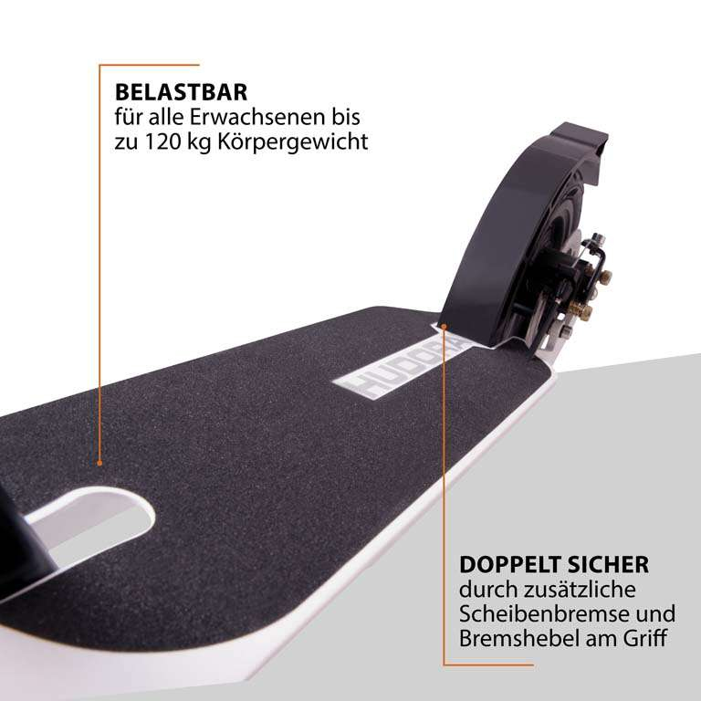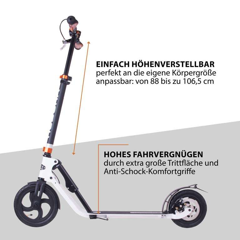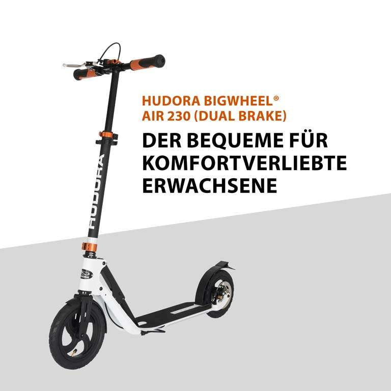 Der bequeme für komfortverliebte ErwachseneDer Scooter HUDORA Big Wheel Air 230 Dual Brake ist mit seinen zwei großen Luftreifen für fast jedes Terrain geeignet. Das doppelte Bremssystem sorgt für noch mehr Sicherheit und Sportlichkeit. Der HUDORA Big Wheel Air 230 Dual Brake ist faltbar und leicht, agil und bequem. Die großen, stoßdämpfenden Luftreifen sind auf leichten Alu-Felgen montiert. Ein Schmutzfang hinten und vorne hält die Kleidung sauber – so ist dieser Klapproller auch für den täglichen Weg zur Arbeit geeignet. Der HUDORA Big Wheel Air 230 Dual Brake hat ein hochwertiges Aluminium-Deck mit verstärkten Flügeln und einen umklappbaren, höhenjustierbaren Lenker. Die Anti-Shock-Komfortgriffe minimieren Vibrationen und maximieren den Fahrkomfort. Die Ausstattung dieses Alu-Scooters mit Klingel, Reflektoren und Ständer wird höchsten Ansprüchen gerecht. Das doppelte Bremssystem (Scheibenbremse und Friktionsbremse) dieses Scooters sorgt für zusätzliche Sicherheit.