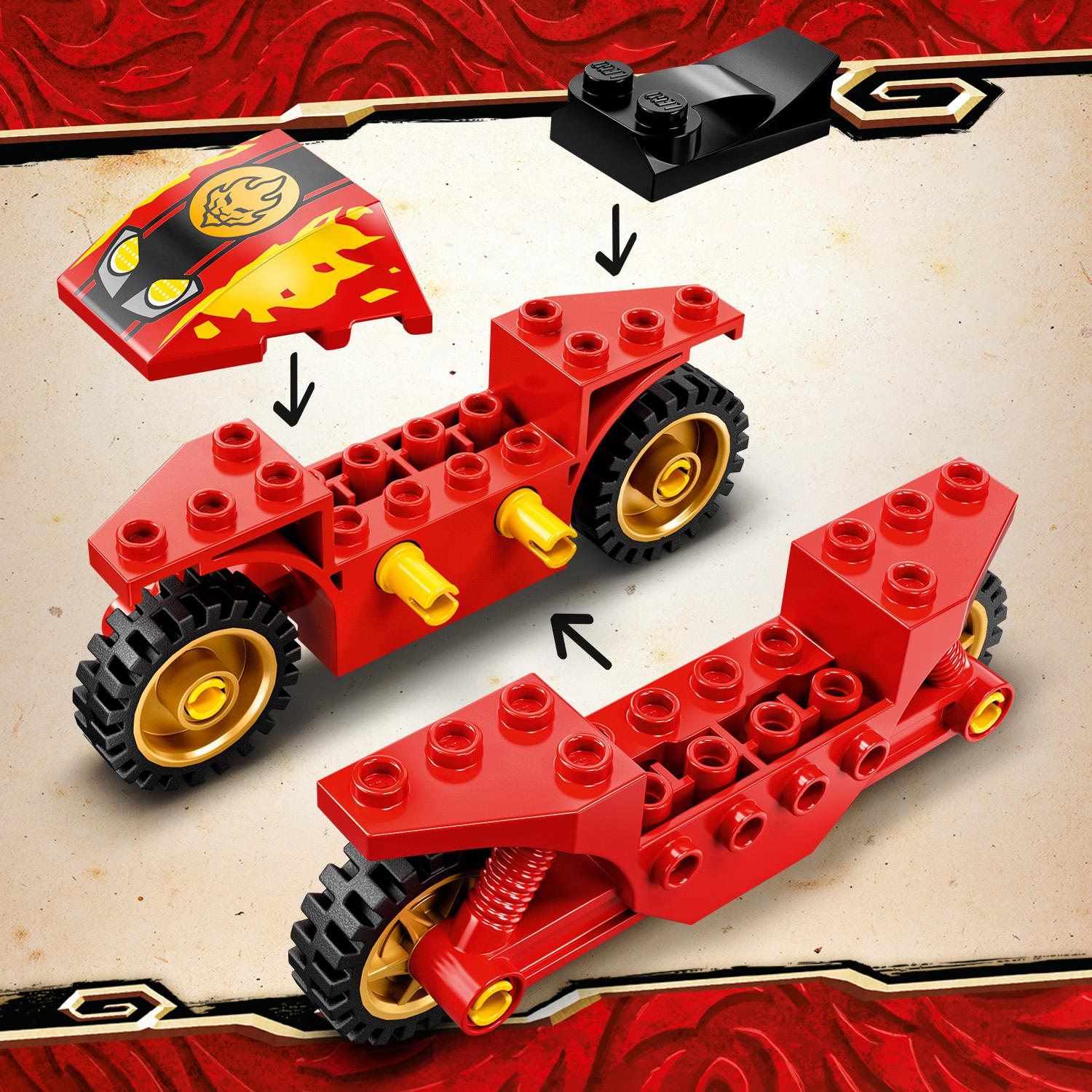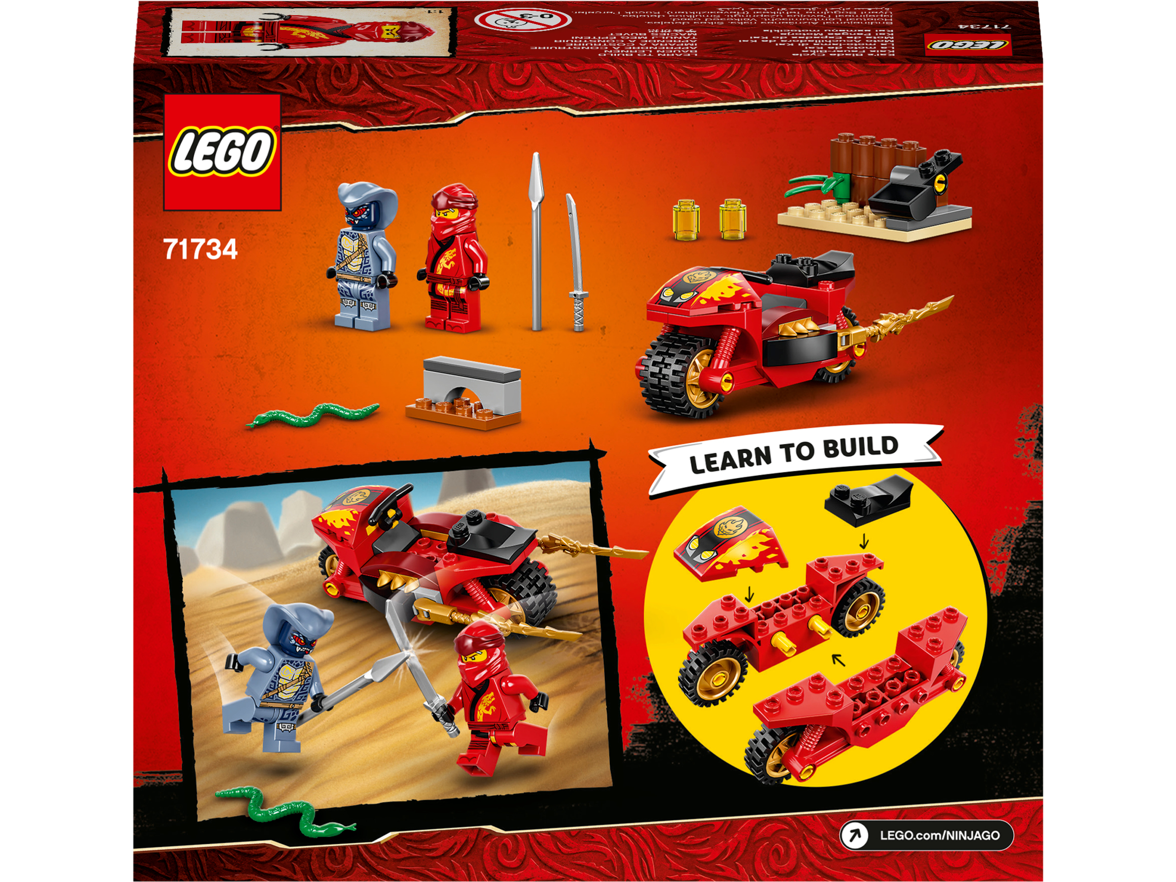 Enthält 2 LEGO NINJAGO Mini Figuren: Ninja Kai und den bösen Schlangenkrieger Rattla sowie deren Ninja-Waffen: ein Schwert, einen Speer und 2 goldene Motorradschwerter