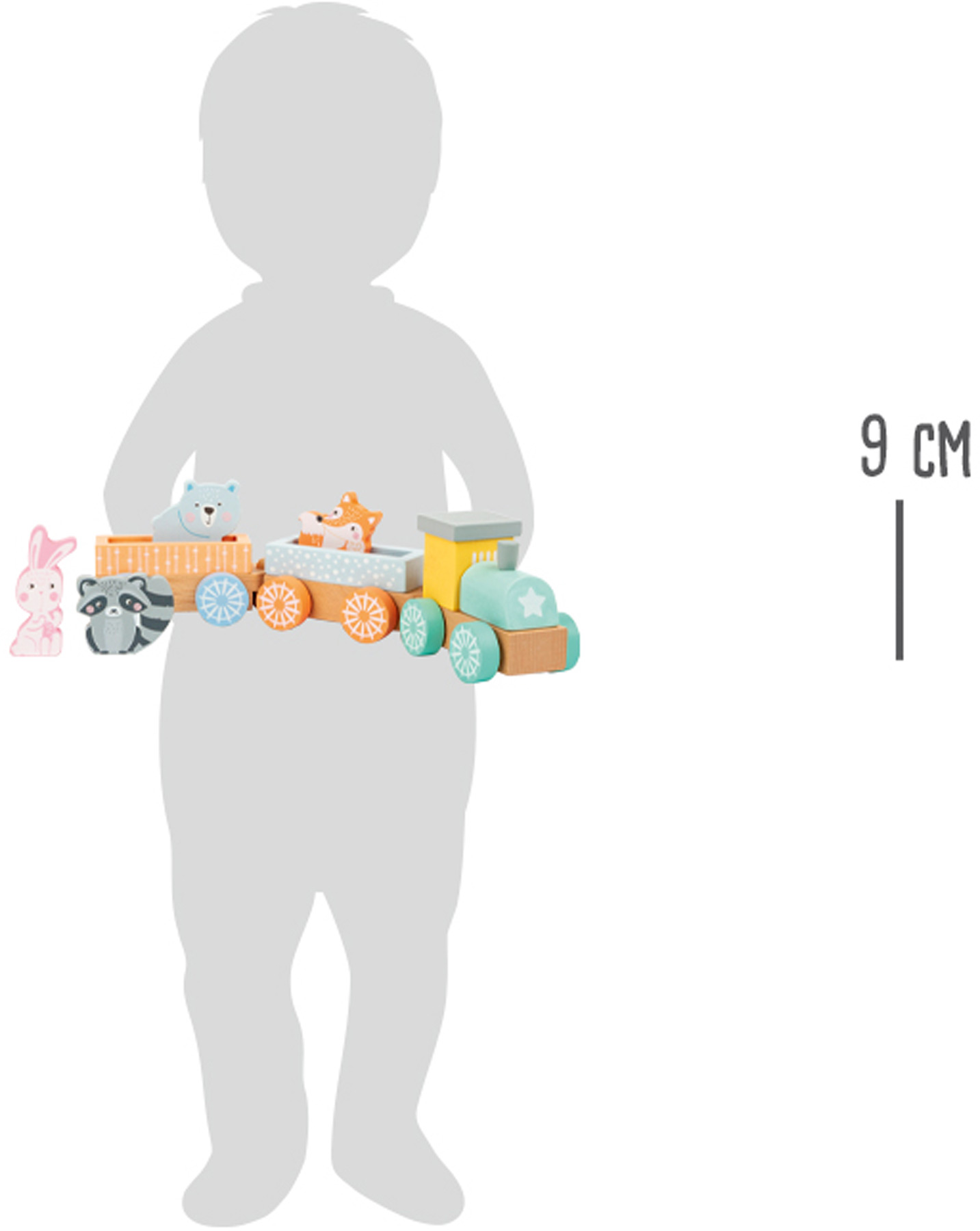 Tuut tuut, hier kommt der Zug! Dieser pastellfarbene Zug hat jede Menge Spielspaß an Bord! Die beiden Waggons lassen sich durch einfache Steckverbindungen aneinanderhängen. Gezogen werden sie von der kleinen Lokomotive mit zwei Bauklötzen zum Stecken. Die Waggons bieten Platz für die vier liebevoll gestalteten tierischen Passagiere. Und mitfahren wollen alle: Fuchs, Hase & Co warten schon gespannt auf die Reise durchs Kinderzimmer!