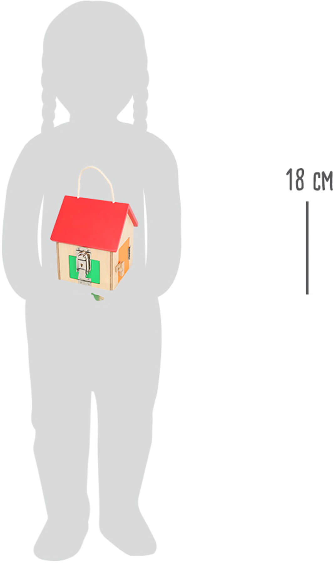 Dieses Haus sorgt für Schlüsselerlebnisse! Mit seinen diversen Riegeln, einem Bügelschloss und einem Scharnierverschluss fördert das Schlosshaus aus FSC® 100%-zertifiziertem Holz die Konzentration und Feinmotorik der Kinder. Viele Alltagssituationen können auf spielerische Weise erlebt und erprobt werden. Durch die hochwertige Verarbeitung aus Holz und die kompakte Form kann das Schlosshaus überall mithingenommen werden. Die Kordel dient dem leichten Transport. Wer schließt das nächste Schloss auf?