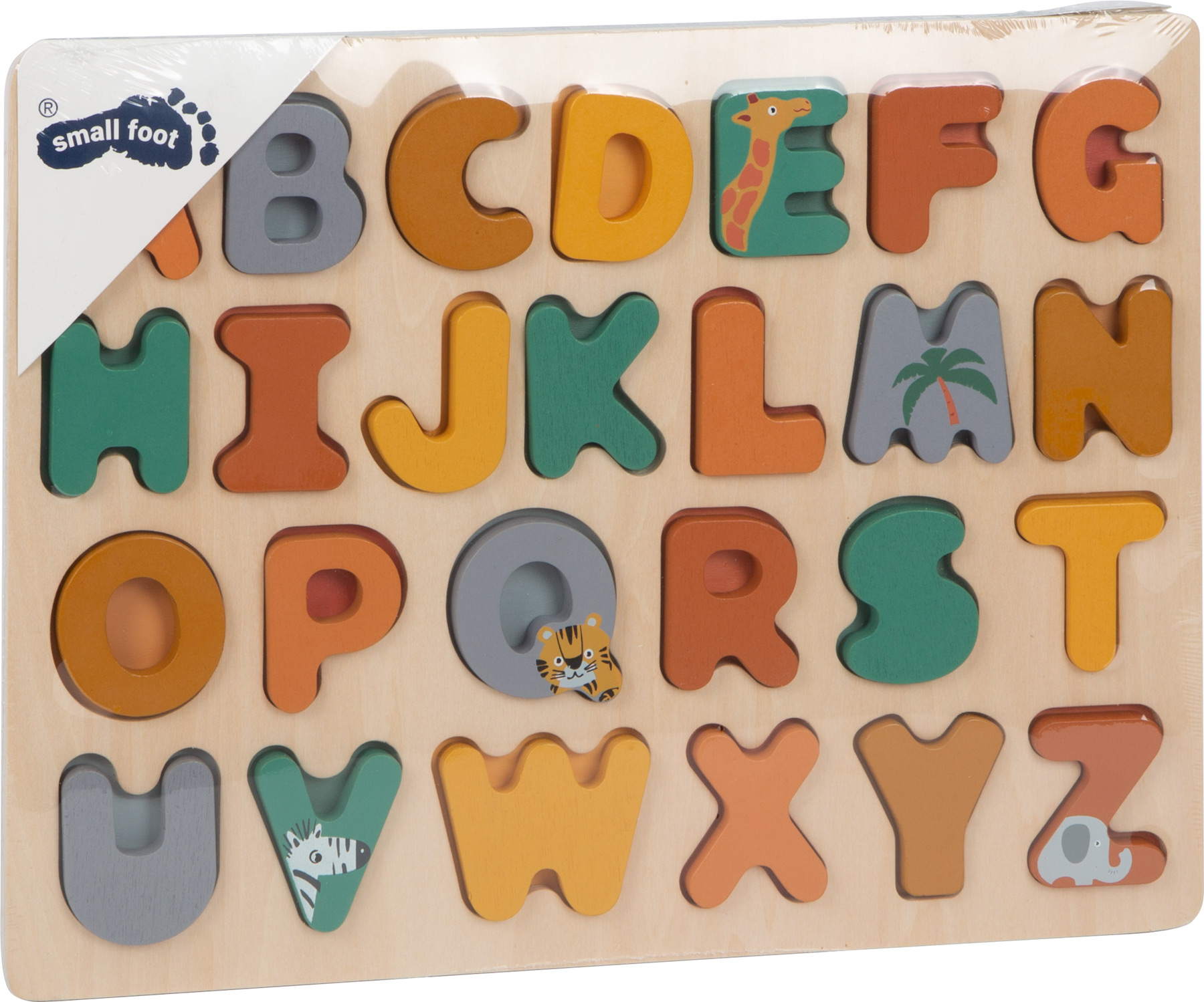 Spielend leicht das ABC lernen! Mit diesem Setzpuzzle aus Holz in Trendfarben lernen Kinder spielerisch das Alphabet und trainieren ihre Feinmotorik. Die 26 erhabenen Holzbuchstaben lassen sich von kleinen Händen gut greifen und in die passenden Aussparungen setzen. Sie können aber auch ganz ohne Rahmen aufrecht stehen! So fördern die niedlichen Safari-Motive wie Zebra, Giraffe, Elefant und Tiger die Lust am Buchstabenlernen gleich doppelt. Das Deko-Extra: Aufrecht hingestellt sind die Buchstaben ein dekorativer Eye-Catcher im Kinderzimmer.