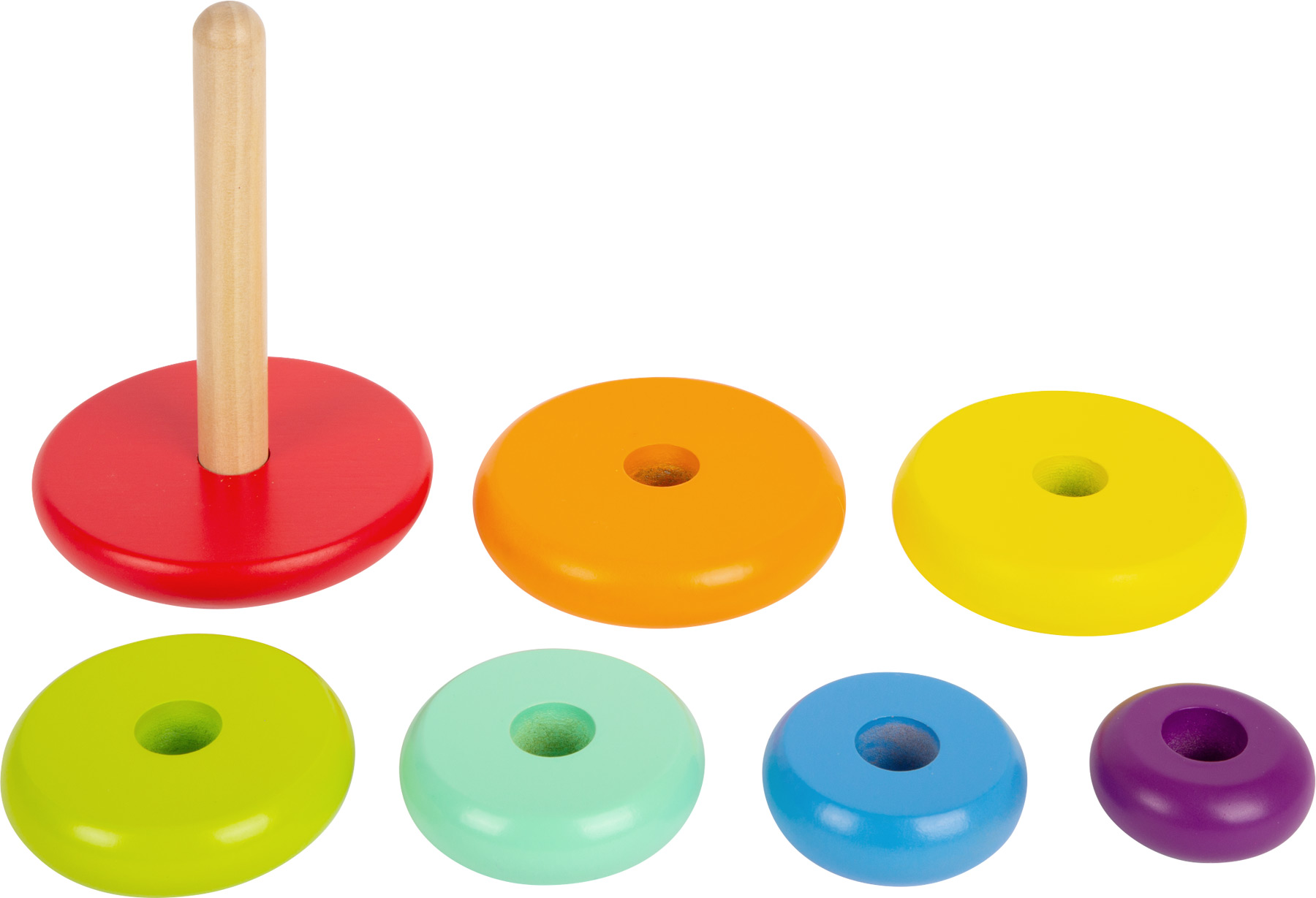 Ein Regenbogen zum Stapeln und Stecken! Dieser Stapelturm strahlt in leuchtenden Regenbogenfarben und animiert durch das handschmeichlerische Holz schon die Kleinsten dazu, die verschiedenfarbigen Ringe nach Größe und Farbe zu sortieren. Dabei werden Motorik, Hand-Augen-Koordination und das Verständnis für Formen und Größen geschult. Zusätzliche Freude bereitet der abgerundete Boden, der den Stapelturm hin und her schaukeln lässt. Für das Plus an Sicherheit sorgt ein beweglicher Pin. Kindgerecht gestaltete Stapelspiele aus robustem Holz garantieren langanhaltenden Spielspaß. Damit kommt bei den Kleinsten so schnell keine Langeweile auf. Regenbogenfarben sorgen für die moderne Optik dieses Motorik-Klassikers.