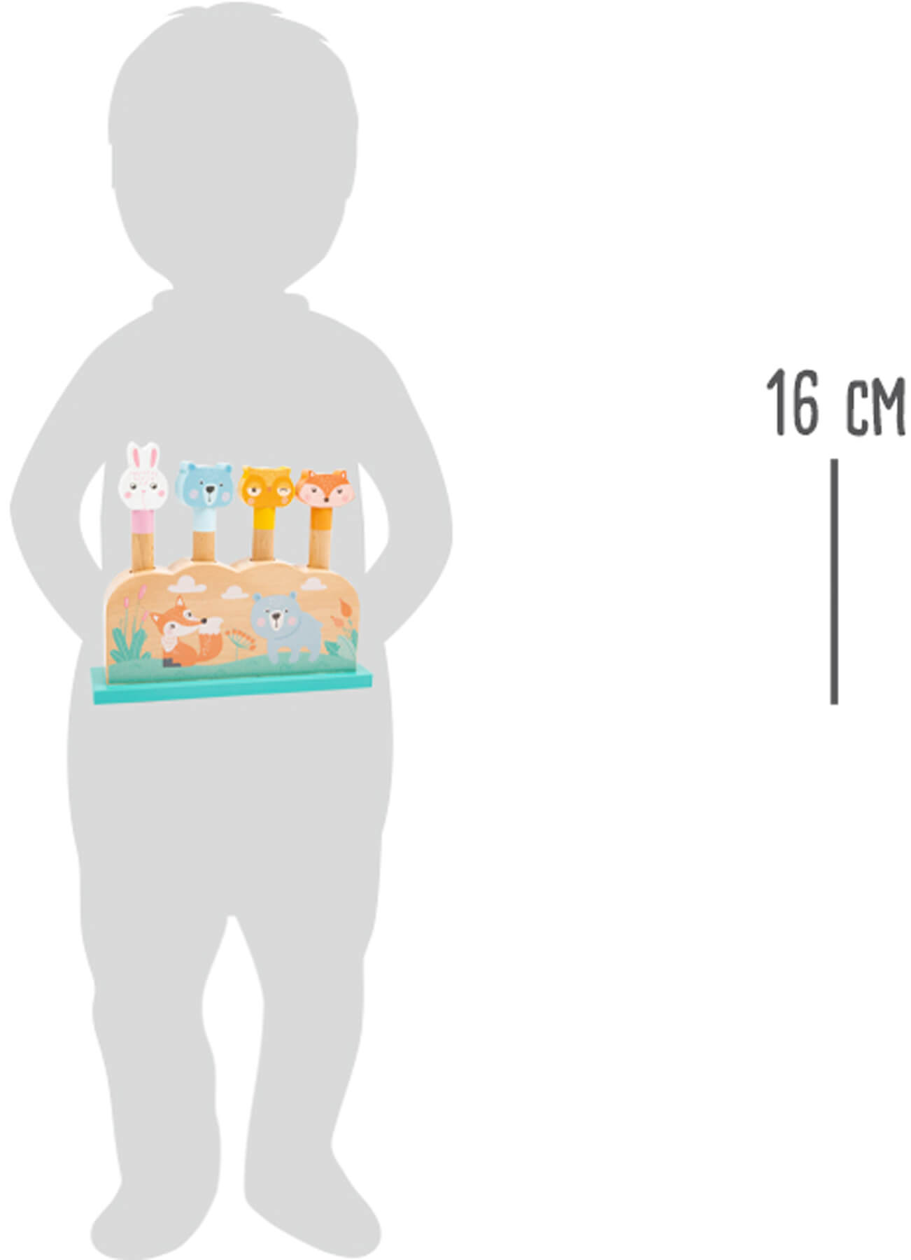Wer springt denn da? Dieses süße Steckspiel aus Holz kommt in angesagten Pastelltönen daher. Die niedlichen Waldtiere aus robustem Holz werden zunächst in die Öffnungen gesteckt. Da die Löcher mit Sprungfedern versehen sind, hüpfen die Tierchen schwungvoll wieder auf. Ein aufregendes Holzspielzeug, das die Motorik schult und Spielspaß ins Kinderzimmer bringt. Das Steckspiel hat durch sein stabiles Fundament eine gute Standfestigkeit. Ein perfektes Holzspielzeug für Kleinkinder, das auch optisch ein Hingucker ist!