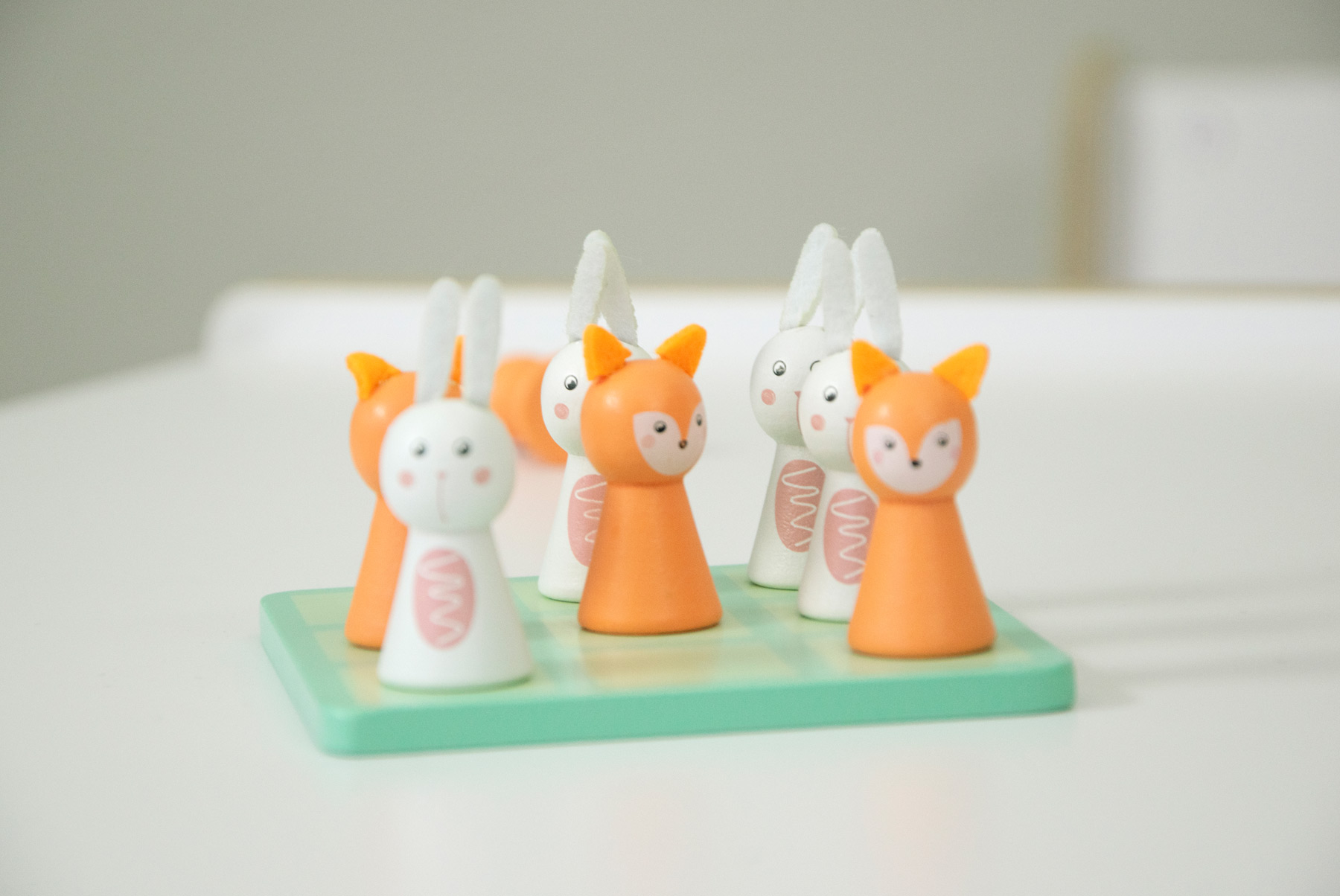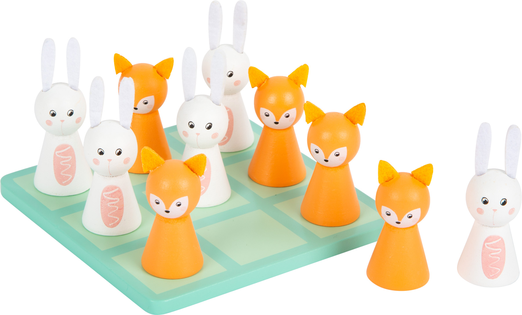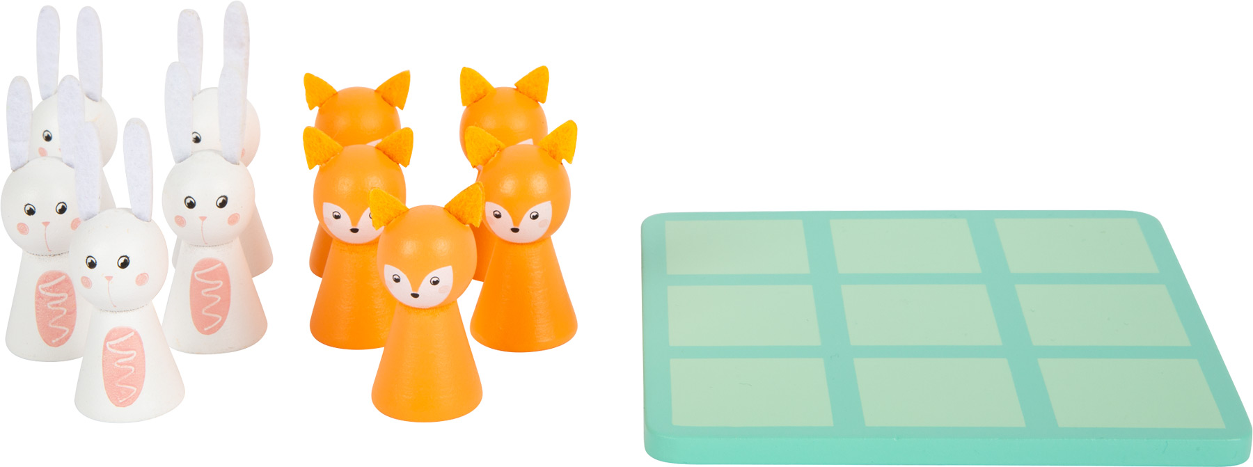 Jede Menge spannende Tic-Tac-Toe-Duelle mit Hase und Fuchs! Bei diesem handlichen Strategiespiel aus Holz treten Hase und Fuchs gegeneinander an, um als erstes eine Dreierreihe auf dem Spielbrett voll zu machen. Die pastellfarbenen Tierfiguren punkten optisch mit ihren süßen Filzohren und sind absolute Blickfänge auf dem Spielbrett. Kurzweiliger Spielspaß für Klein und Groß! Wer kann als erstes eine Reihe voll machen? Der Brettspielklassiker fördert spielerisch das logische Denken und vertreibt die Langeweile. Ein spannendes Gesellschaftsspiel für zwei Personen in abgestimmten Farben und in einem kompakten Format. Perfekt auch auf Reisen.